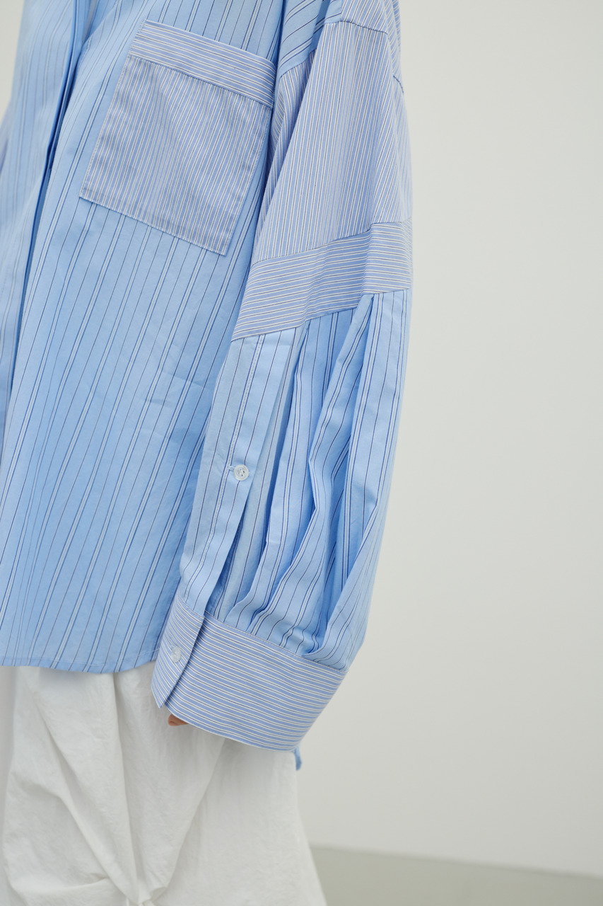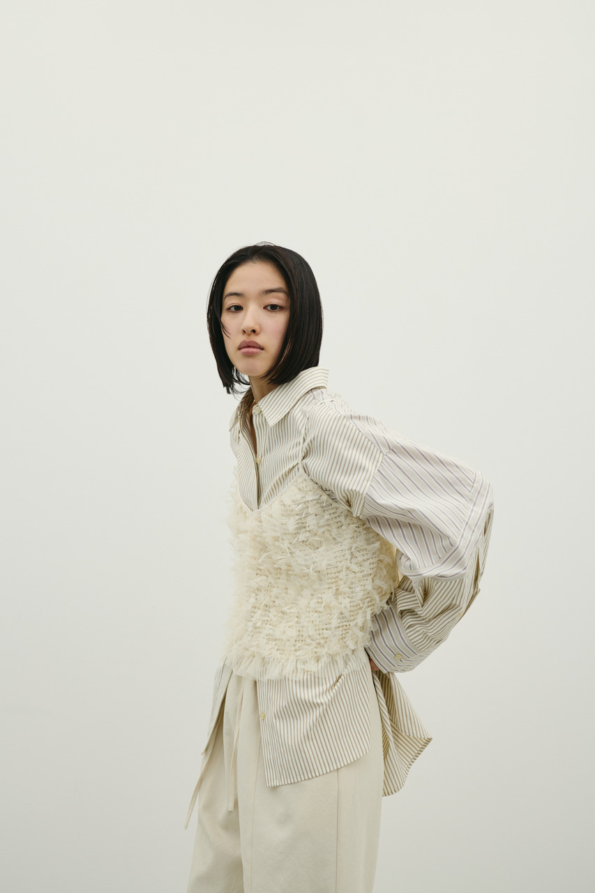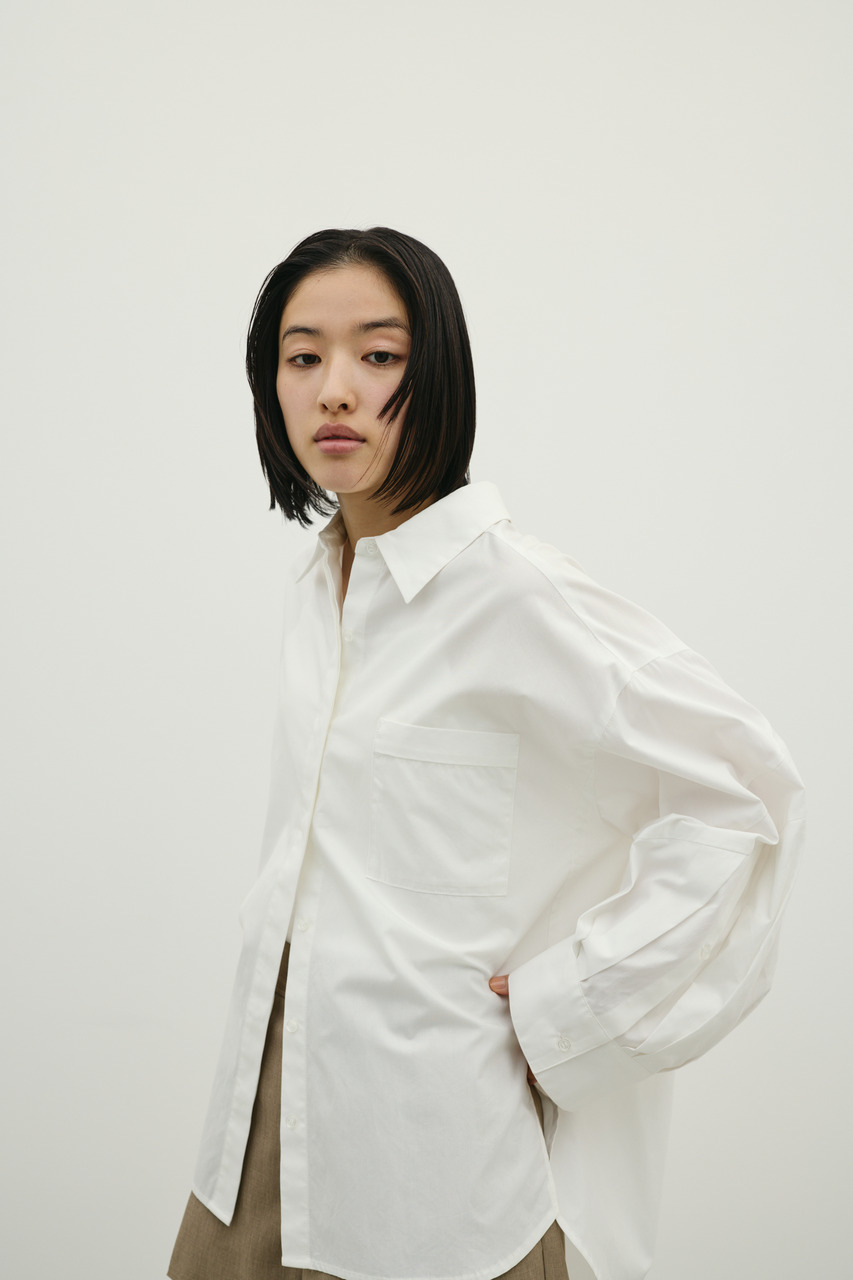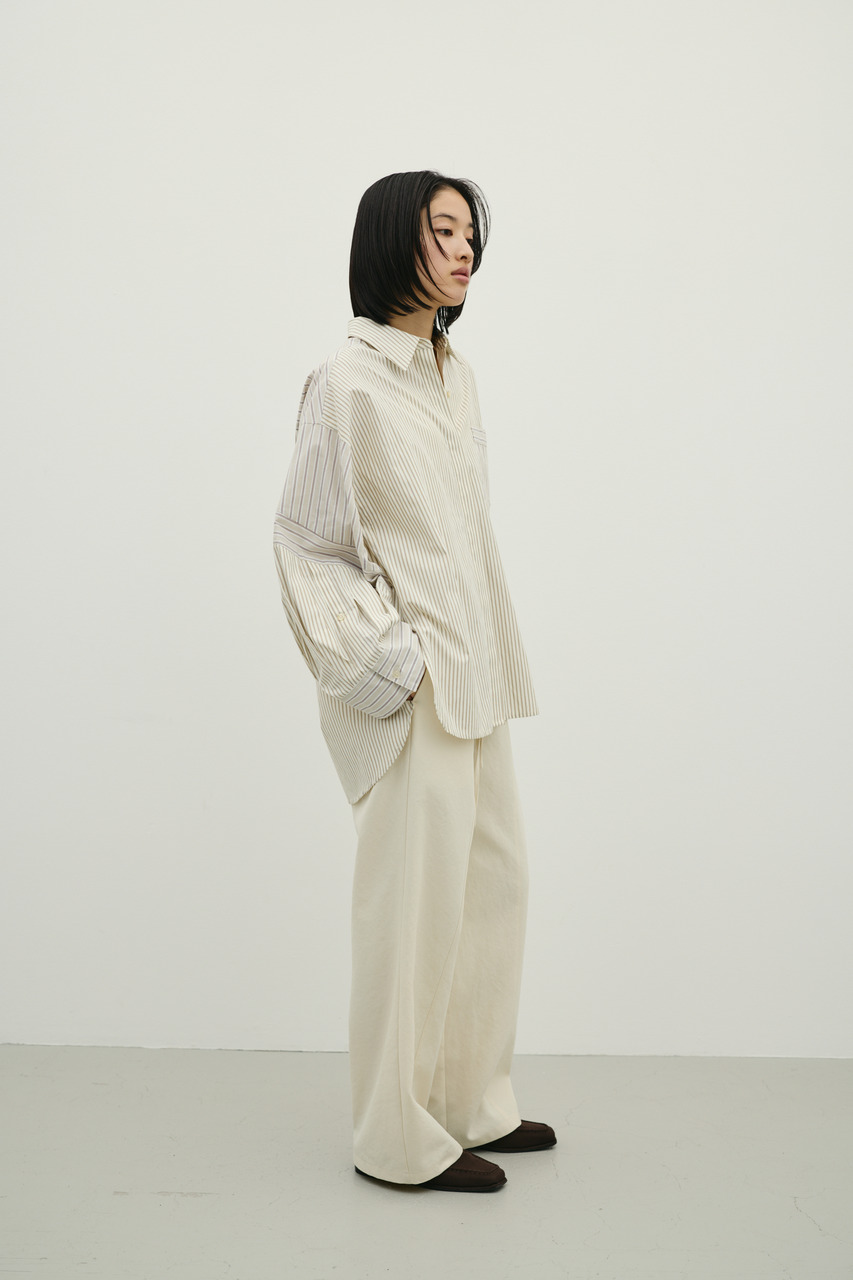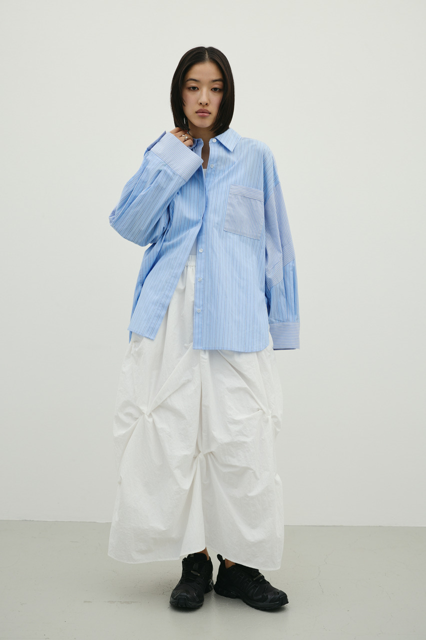 袖口のあきをあえて前側に振ることで、モード感をプラスしたオーバーサイズシャツ。身幅、袖ともに大きめサイズのメンズライクなシルエットで、一枚着としてはもちろん、羽織りとしても幅広いスタイリングが楽しめます。シンプルなホワイトと2種類のストライプを組み合わせた柄展開。細ピッチと太ピッチのストライプをパッチワークのように切り替え、遊び心あふれる他にはないデザインに仕上げました。ストレッチなし、透け感あり。