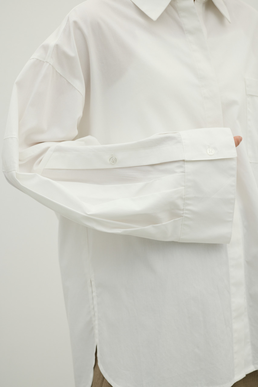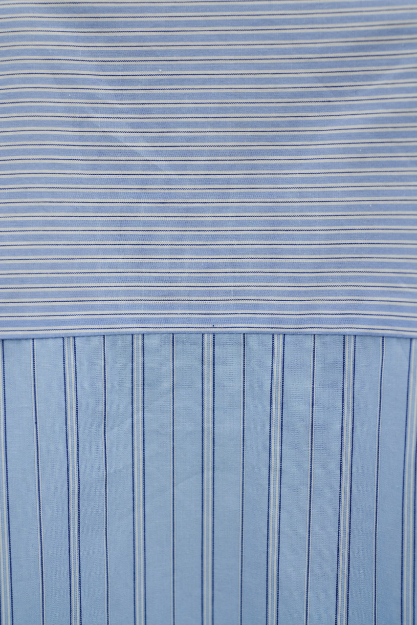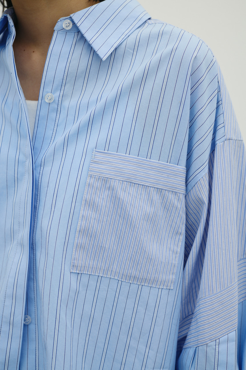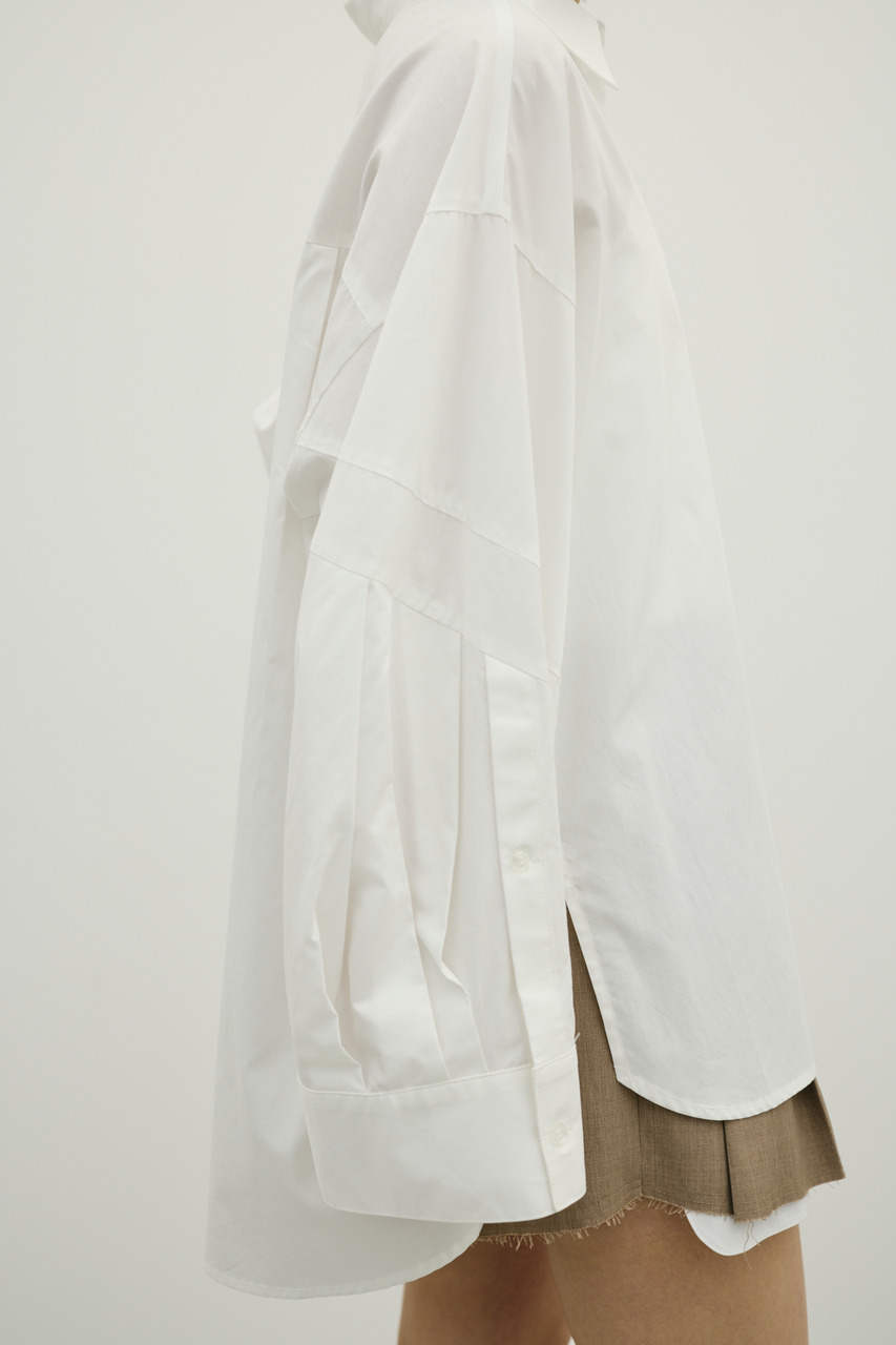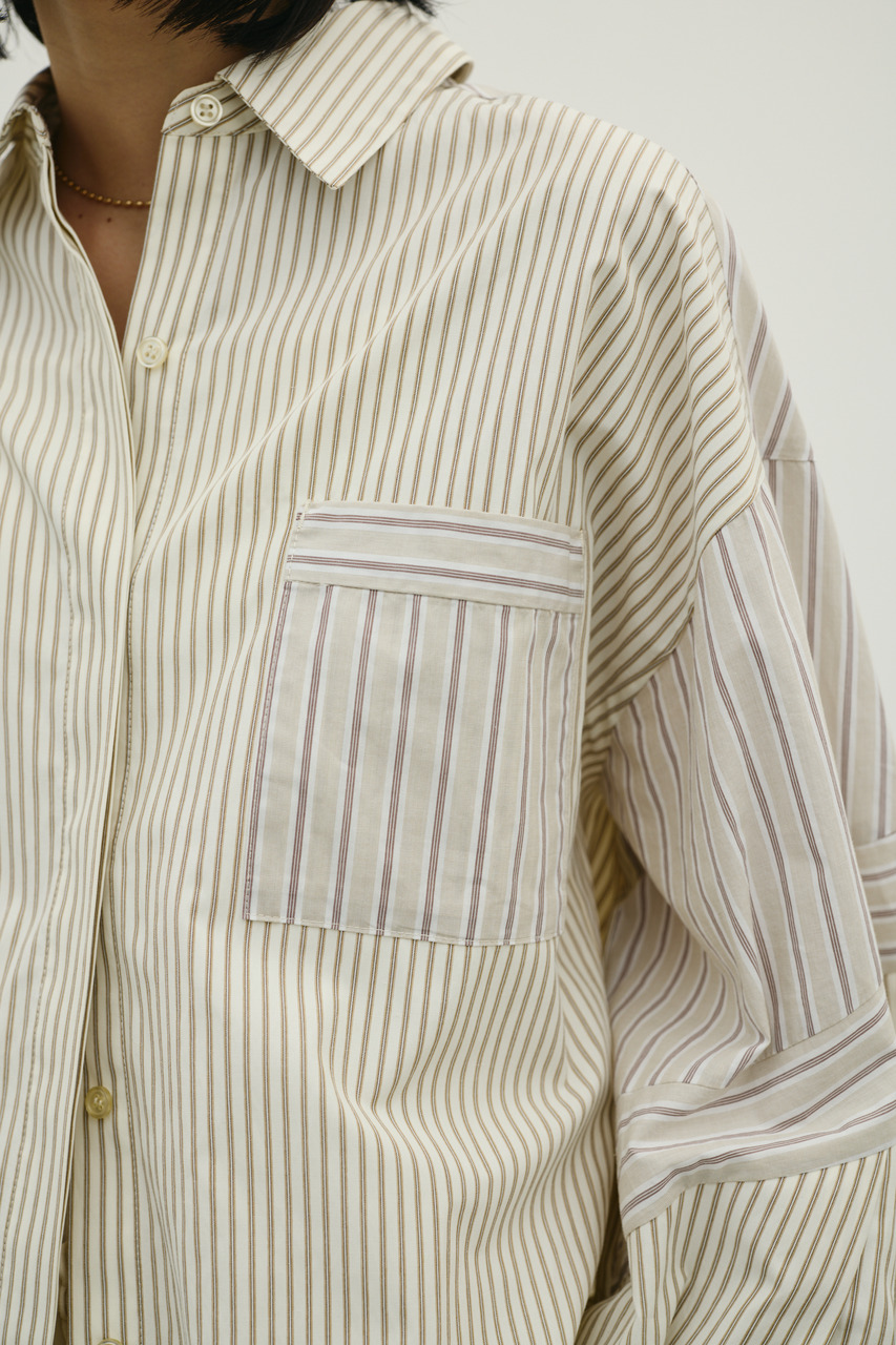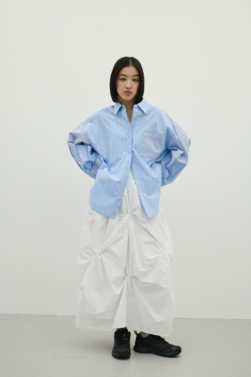 袖口のあきをあえて前側に振ることで、モード感をプラスしたオーバーサイズシャツ。身幅、袖ともに大きめサイズのメンズライクなシルエットで、一枚着としてはもちろん、羽織りとしても幅広いスタイリングが楽しめます。シンプルなホワイトと2種類のストライプを組み合わせた柄展開。細ピッチと太ピッチのストライプをパッチワークのように切り替え、遊び心あふれる他にはないデザインに仕上げました。ストレッチなし、透け感あり。