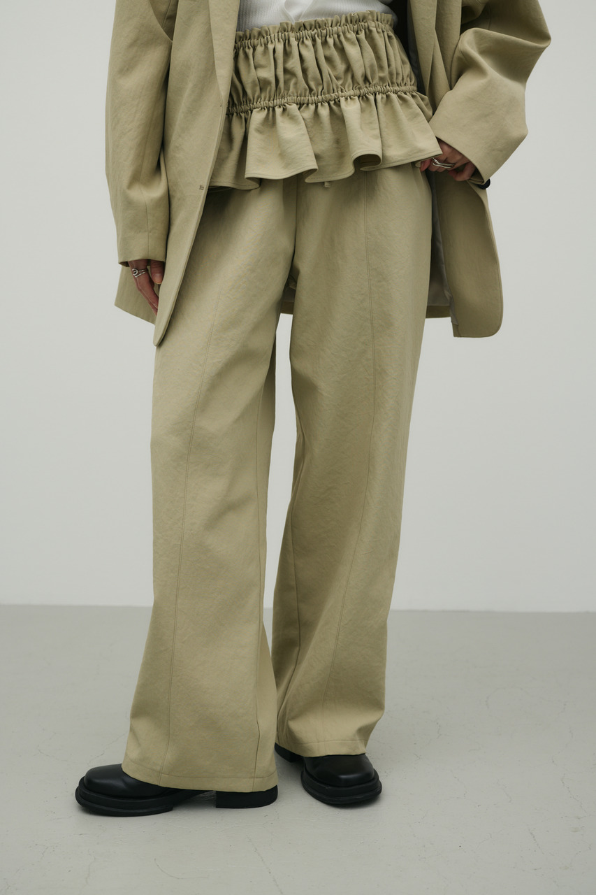 スタミキ大人気のハイラインシリーズからワイドパンツが登場。ウエストは共紐付きのぐるりゴム仕様で、気分やスタイリングに合わせてローウエストでもジャストウエストでも着用いただけます。ウエストヒップ周りはイージーパンツのような快適な履き心地でありながら、きちんと感のある素材を使用。デイリー使いはもちろん、ちょっとしたお出かけにも対応できる、汎用性の高い一枚です。フロントはあえてセンタープレスではなくハギにステッチを効かせることで、程よいモード感をプラス。縦のラインを強調し美脚見せが叶います。500JSA30-0571(ハイラインテーラードジャケット)、500JSA30-0581(ハイラインフリルビスチェ)とセットアップ着用可能。ストレッチややあり、透け感なし。