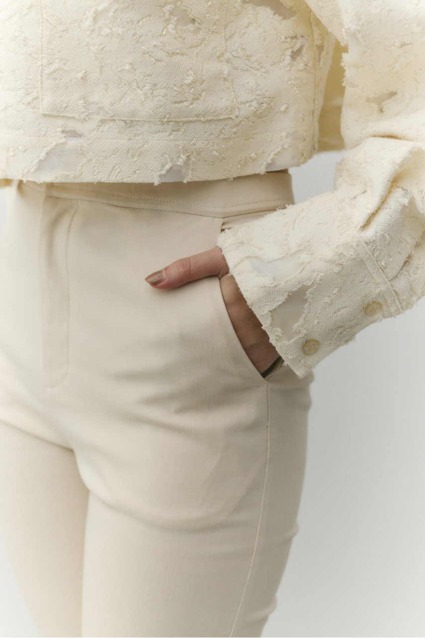 ハイストレッチ生地でストレスフリーに着用いただけるカプリパンツ。ウエストベルトはゴム仕様でそれぞれの身体にフィットしてくれる一枚。ジャケットやシャツ合わせのスタイリングがおすすめです。透け感ややあり(IVO)、ストレッチあり。