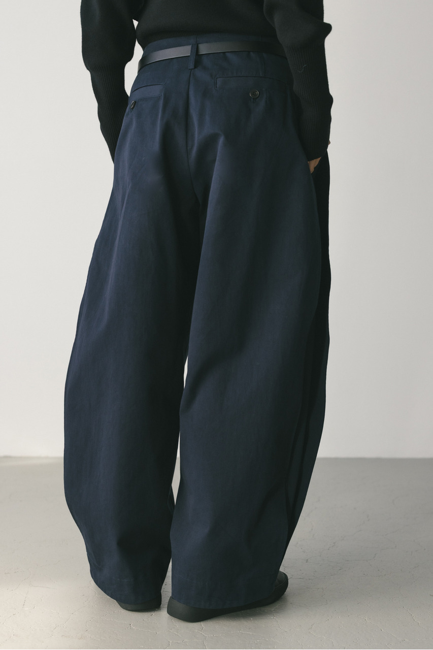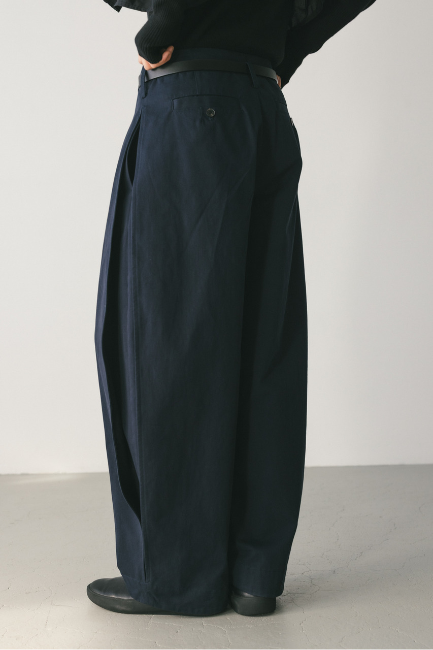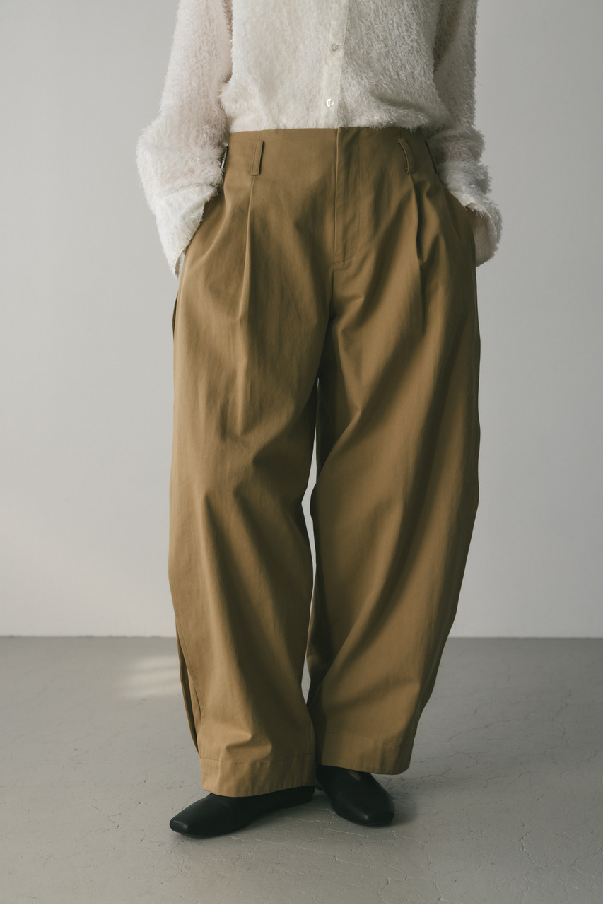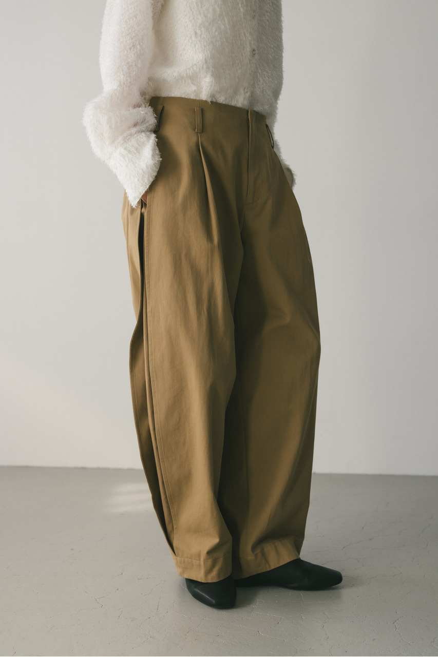 サイドに深いタックを入れたフォルムパンツ。コットンチノ素材を使用したローウエストデザインでルーズなシルエットがポイント。シルエットで新しさを出したスタミキらしいボトムです。透け感なし、ストレッチなし。