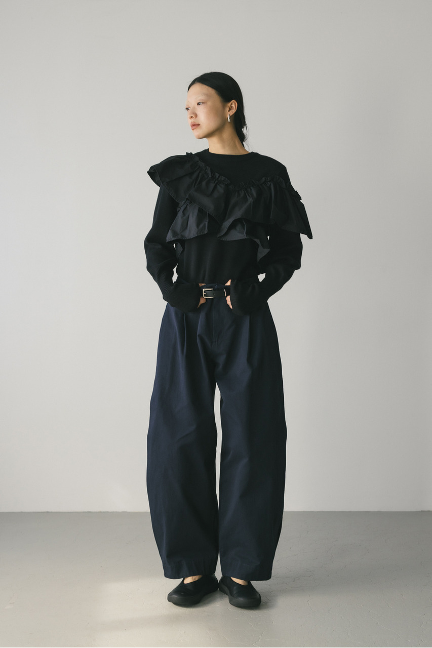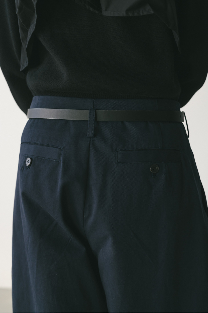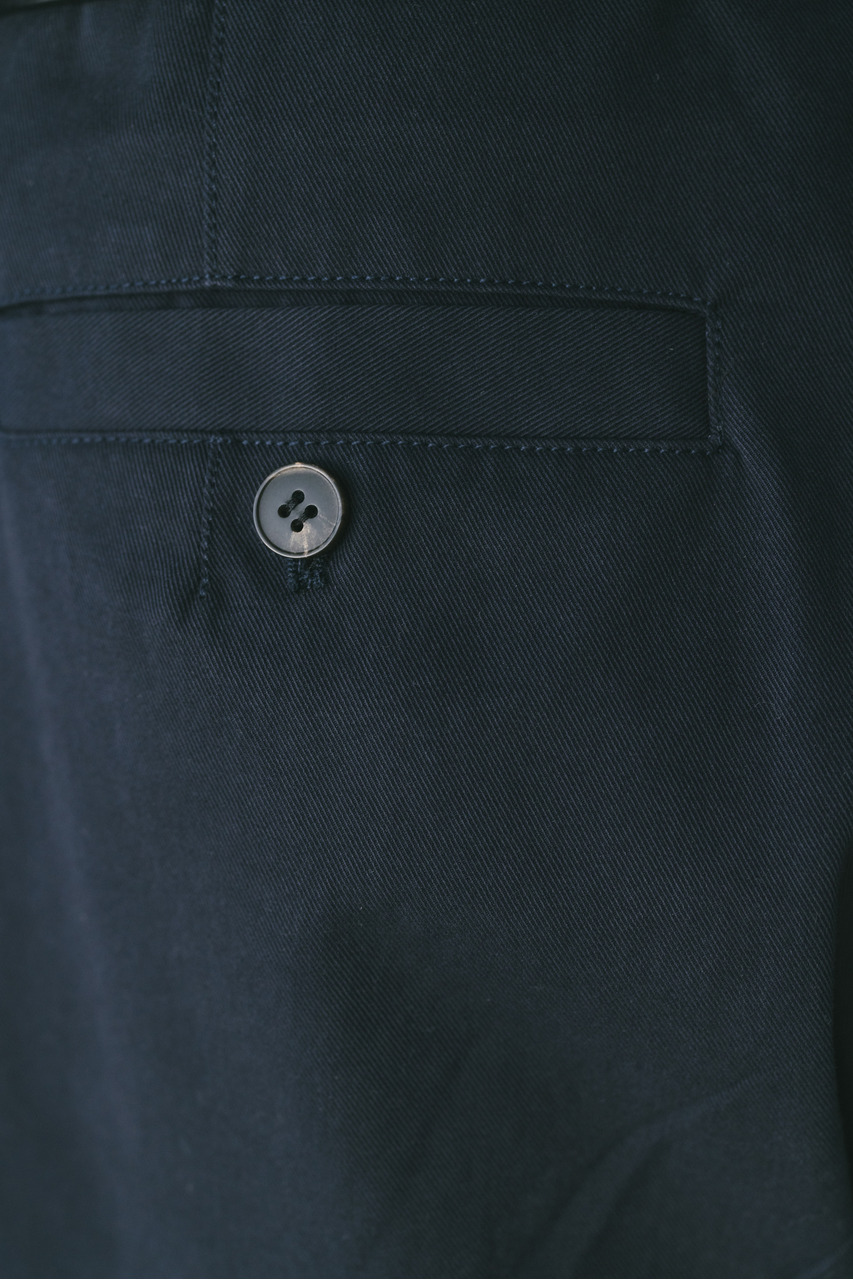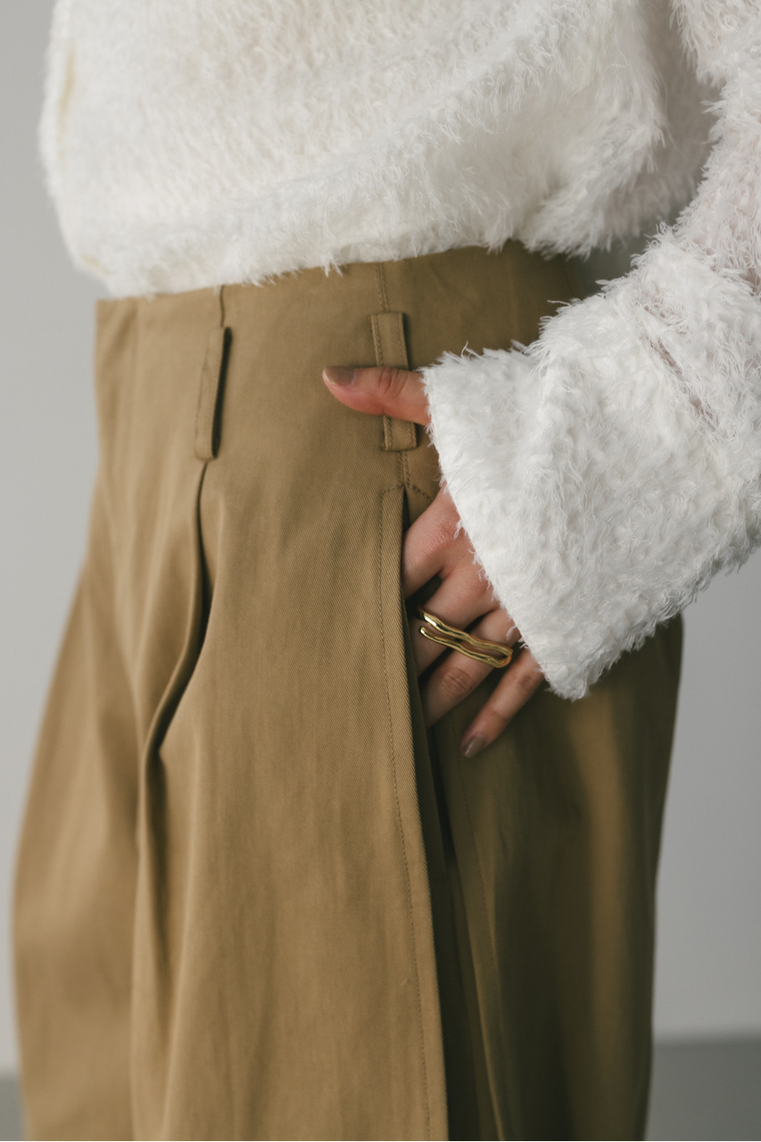 サイドに深いタックを入れたフォルムパンツ。コットンチノ素材を使用したローウエストデザインでルーズなシルエットがポイント。シルエットで新しさを出したスタミキらしいボトムです。透け感なし、ストレッチなし。