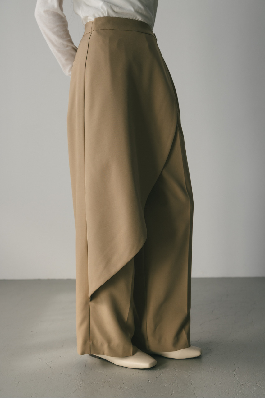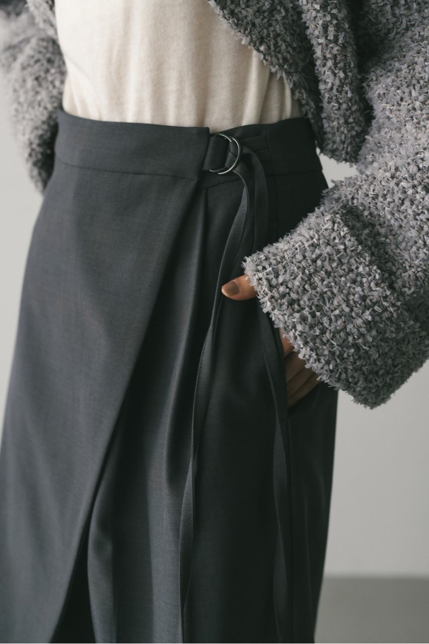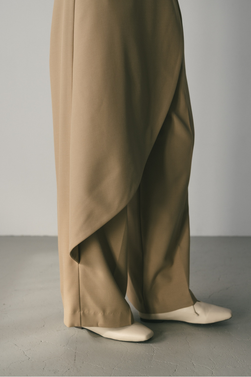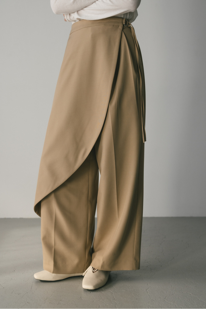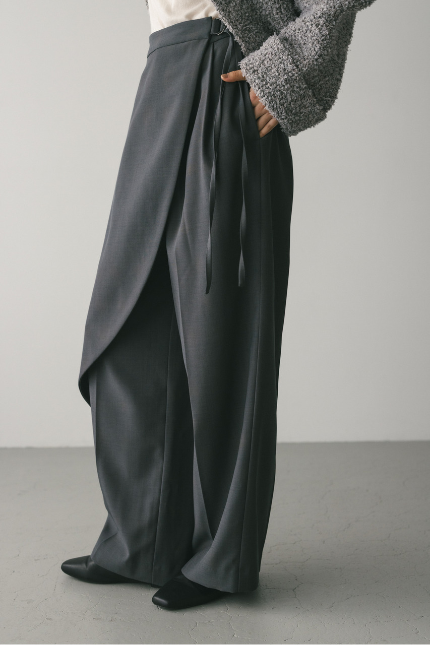 さらっとしたモードな表情感の素材を使用したサイドラップワイドパンツ。深いアシメデザインのラップとワイドシルエットのパンツはヒップ周りを自然にすっきりとカバーできるスタイルアップ効果の高いパンツです。左脇ベルト部分は細い2本の紐ベルトになっており、他にはないスタミキらしいデザインに仕上げました。ストレッチなし、透け感なし。
