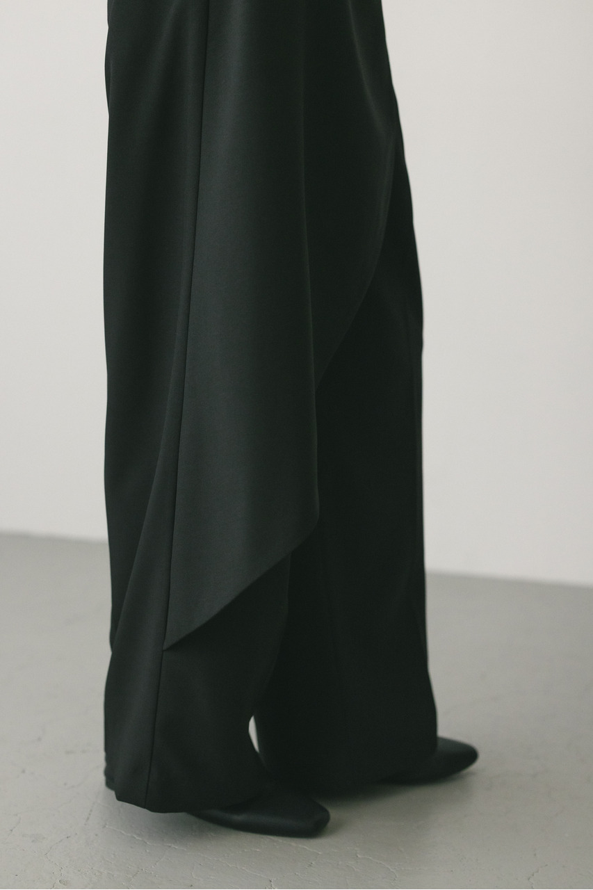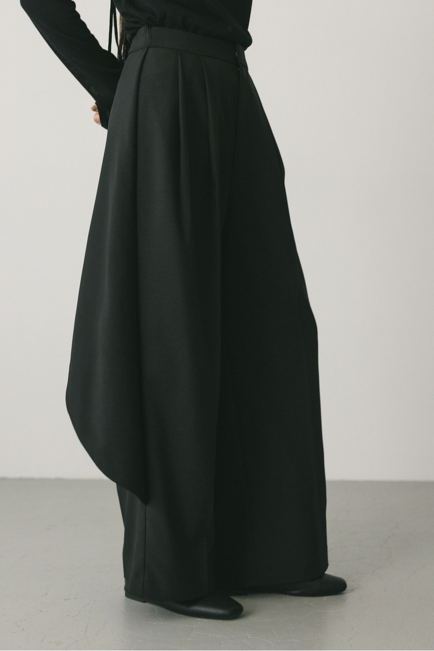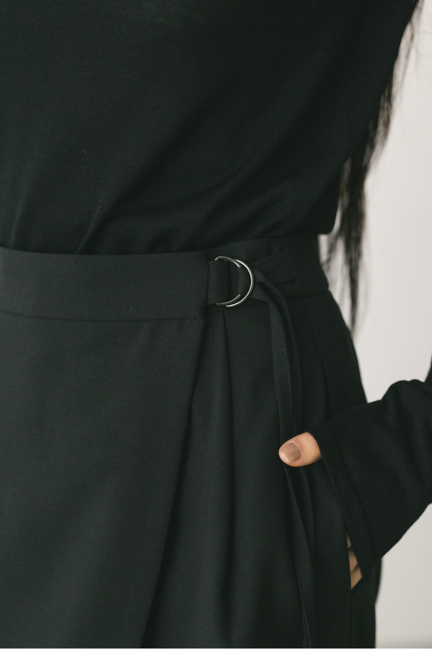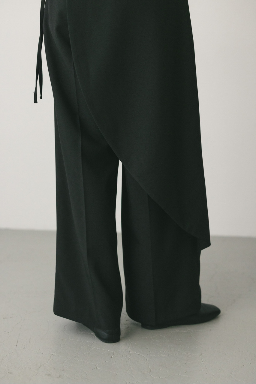 さらっとしたモードな表情感の素材を使用したサイドラップワイドパンツ。深いアシメデザインのラップとワイドシルエットのパンツはヒップ周りを自然にすっきりとカバーできるスタイルアップ効果の高いパンツです。左脇ベルト部分は細い2本の紐ベルトになっており、他にはないスタミキらしいデザインに仕上げました。ストレッチなし、透け感なし。