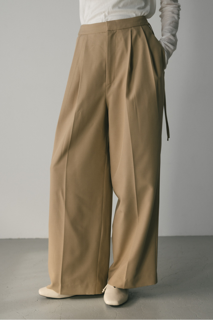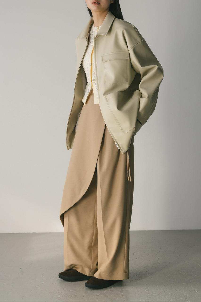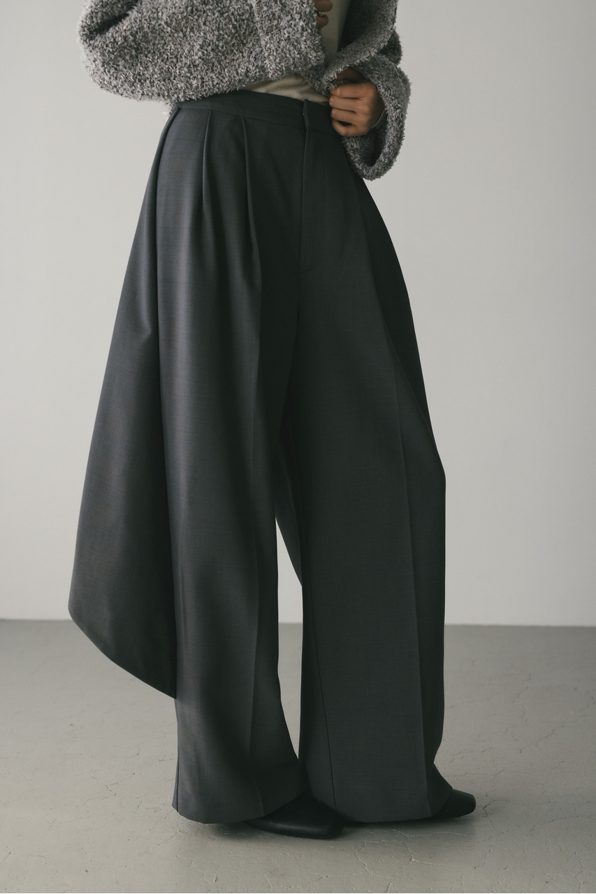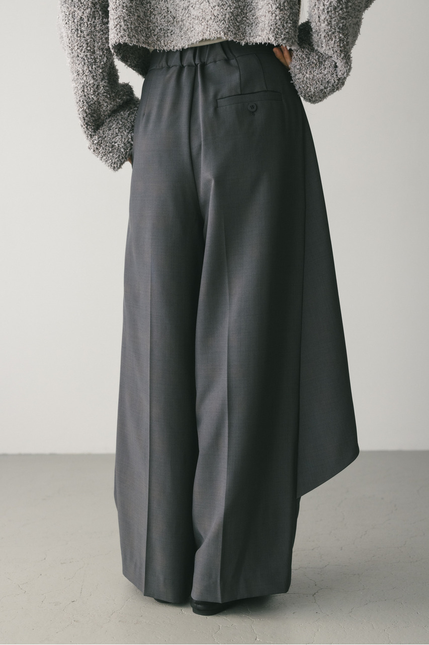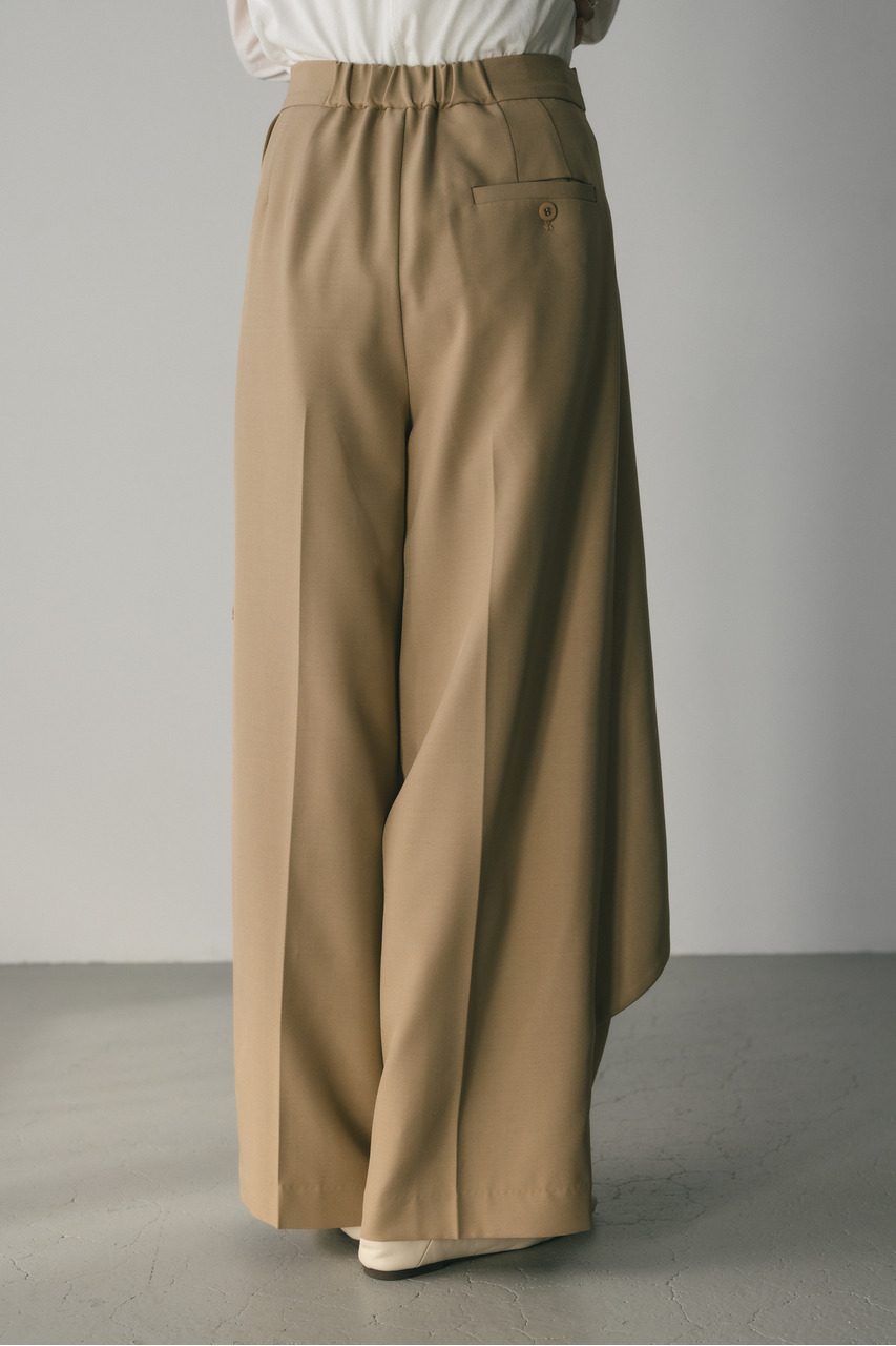 さらっとしたモードな表情感の素材を使用したサイドラップワイドパンツ。深いアシメデザインのラップとワイドシルエットのパンツはヒップ周りを自然にすっきりとカバーできるスタイルアップ効果の高いパンツです。左脇ベルト部分は細い2本の紐ベルトになっており、他にはないスタミキらしいデザインに仕上げました。ストレッチなし、透け感なし。