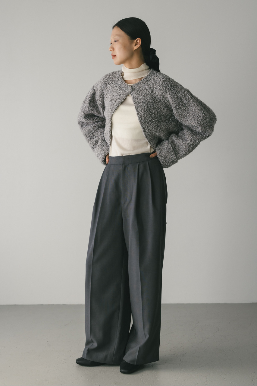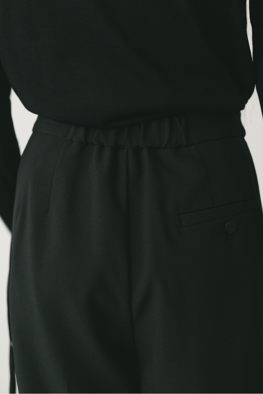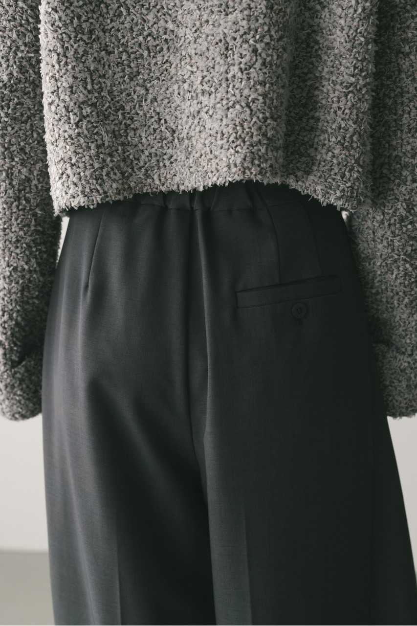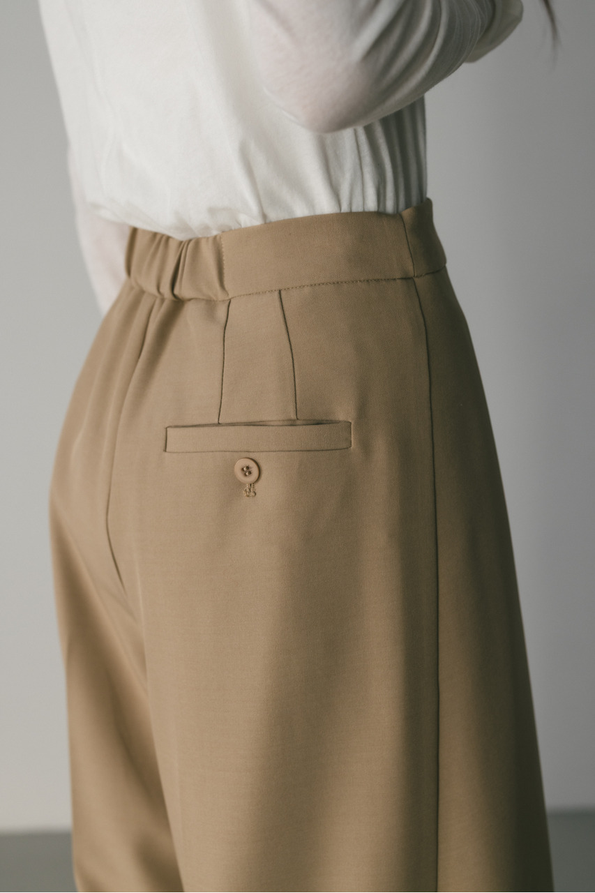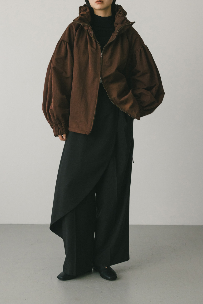 さらっとしたモードな表情感の素材を使用したサイドラップワイドパンツ。深いアシメデザインのラップとワイドシルエットのパンツはヒップ周りを自然にすっきりとカバーできるスタイルアップ効果の高いパンツです。左脇ベルト部分は細い2本の紐ベルトになっており、他にはないスタミキらしいデザインに仕上げました。ストレッチなし、透け感なし。