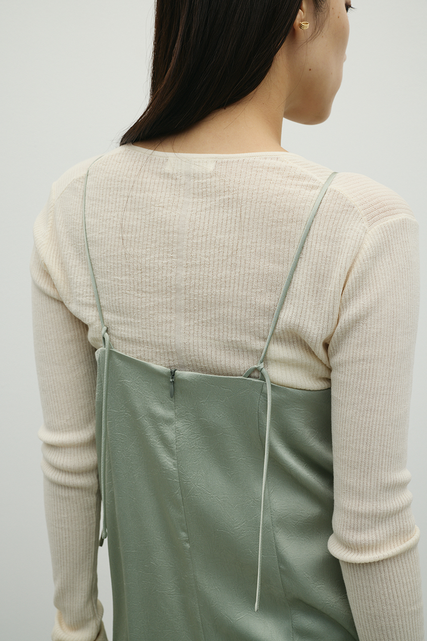 すっきりとしたナローシルエットのサテンキャミワンピース。表情のあるクラッシュサテンを使用した上品な光沢感とニュアンスのある風合いが魅力です。すべての肩紐は結び仕様で長さ調整が可能。斜めに渡した肩紐も調整可能。右肩紐に結んで、クロスさせずに使用したり、気分に合わせたアレンジが楽しめます。ポケット付き。透け感なし、ストレッチなし。