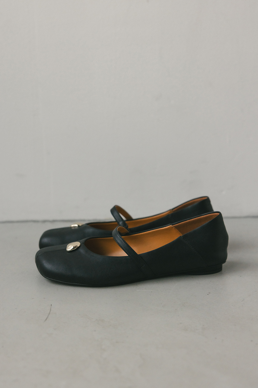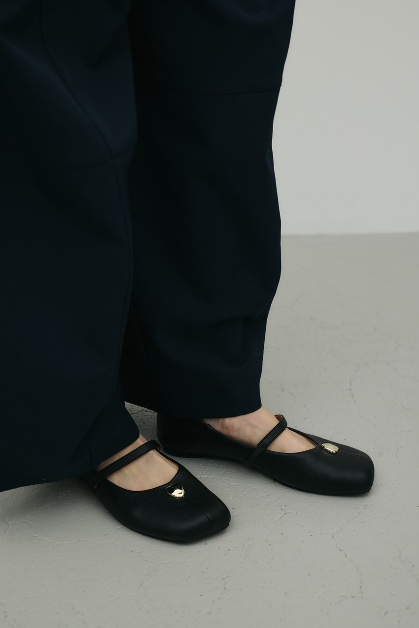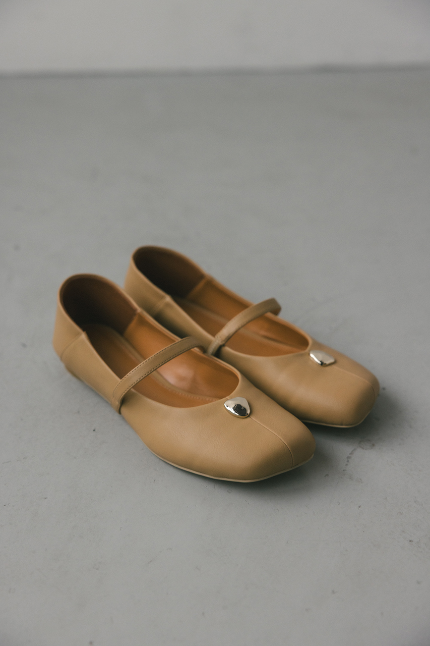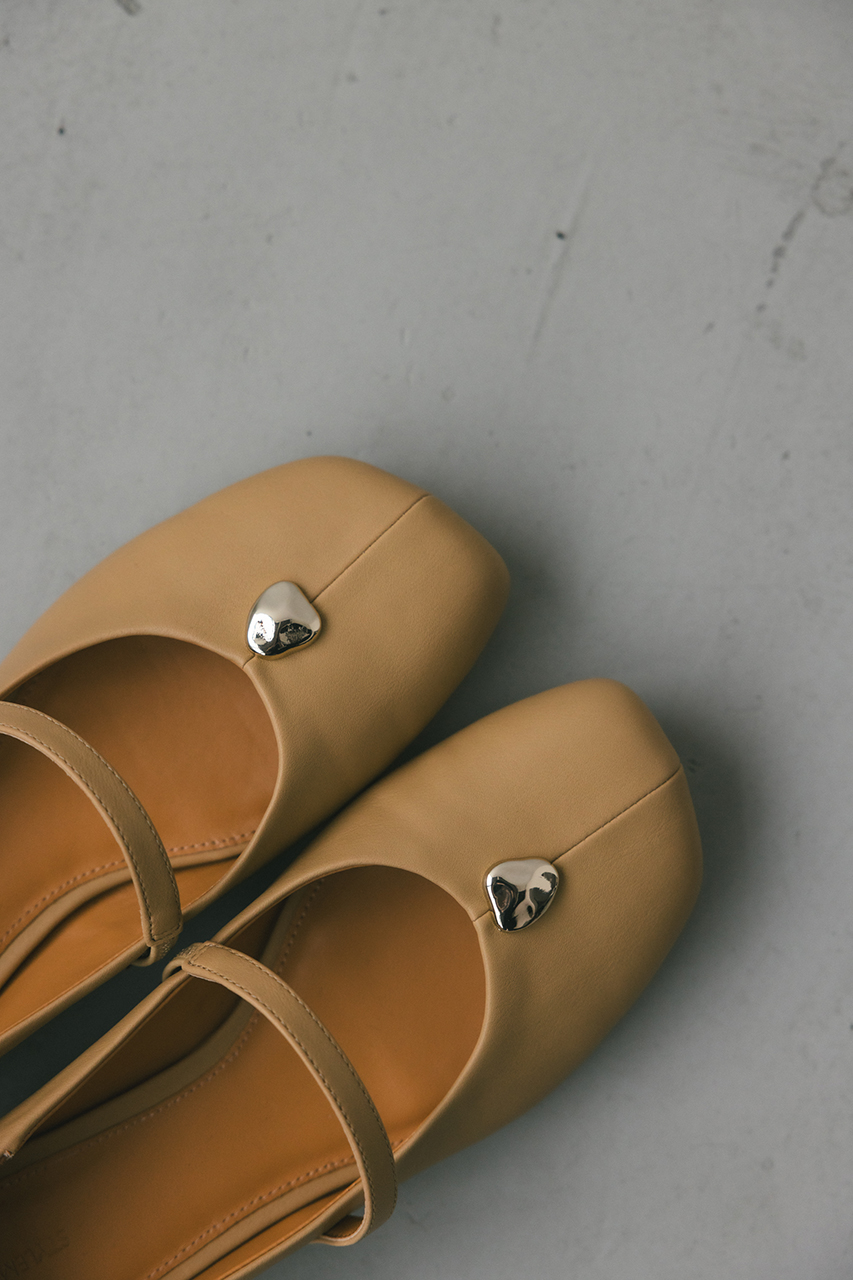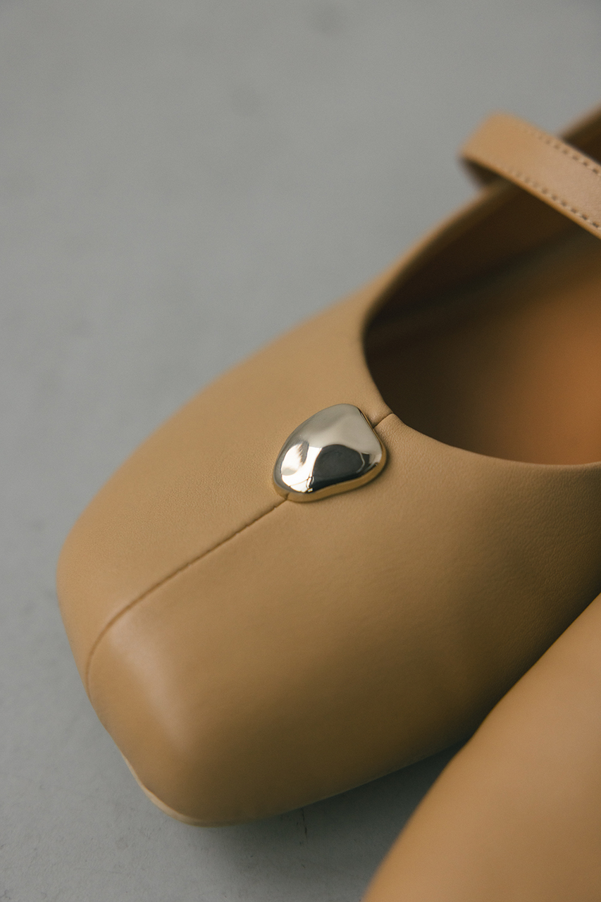 つま先のメタルパーツがコーデにアクセントを効かせるパンプス。かかとは柔らかく踏めるバブーシュ使用しているので踏んでの着用も可能です。