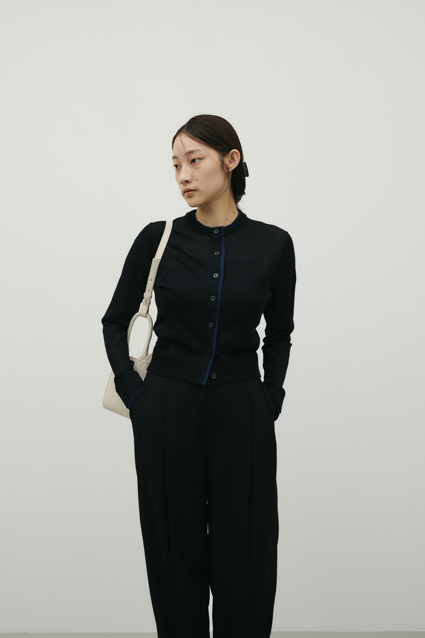 衿、前立て、袖口をバイカラーで仕立てた、配色デザインがポイントのニットカーデ。シンプルな中にさりげないコントラストを効かせたコーディネートのアクセントとして活躍する一枚です。程よくシャリ感のある糸を使用し、天竺組織で軽く編み立てているため、さらっとした肌触りで快適な着心地を叶えます。カーディガンの中にロンTなどをレイヤードしやすいシルエットに仕上げており、ジャケットやアウターの中にコーディネートしても着膨れせず着用していただけます。透け感あり、ストレッチあり。