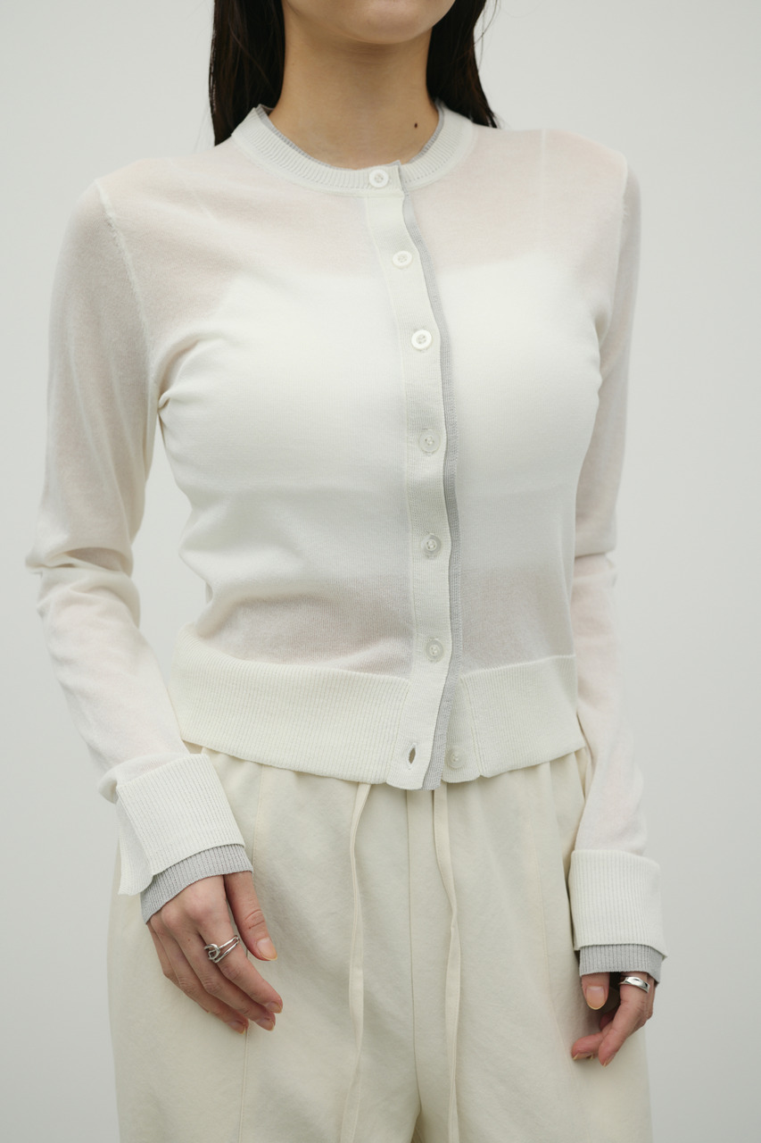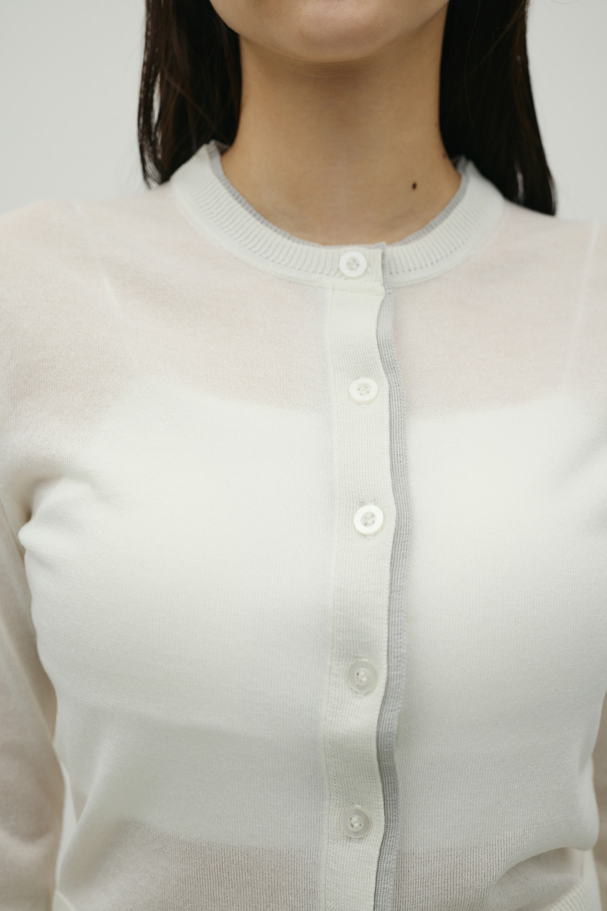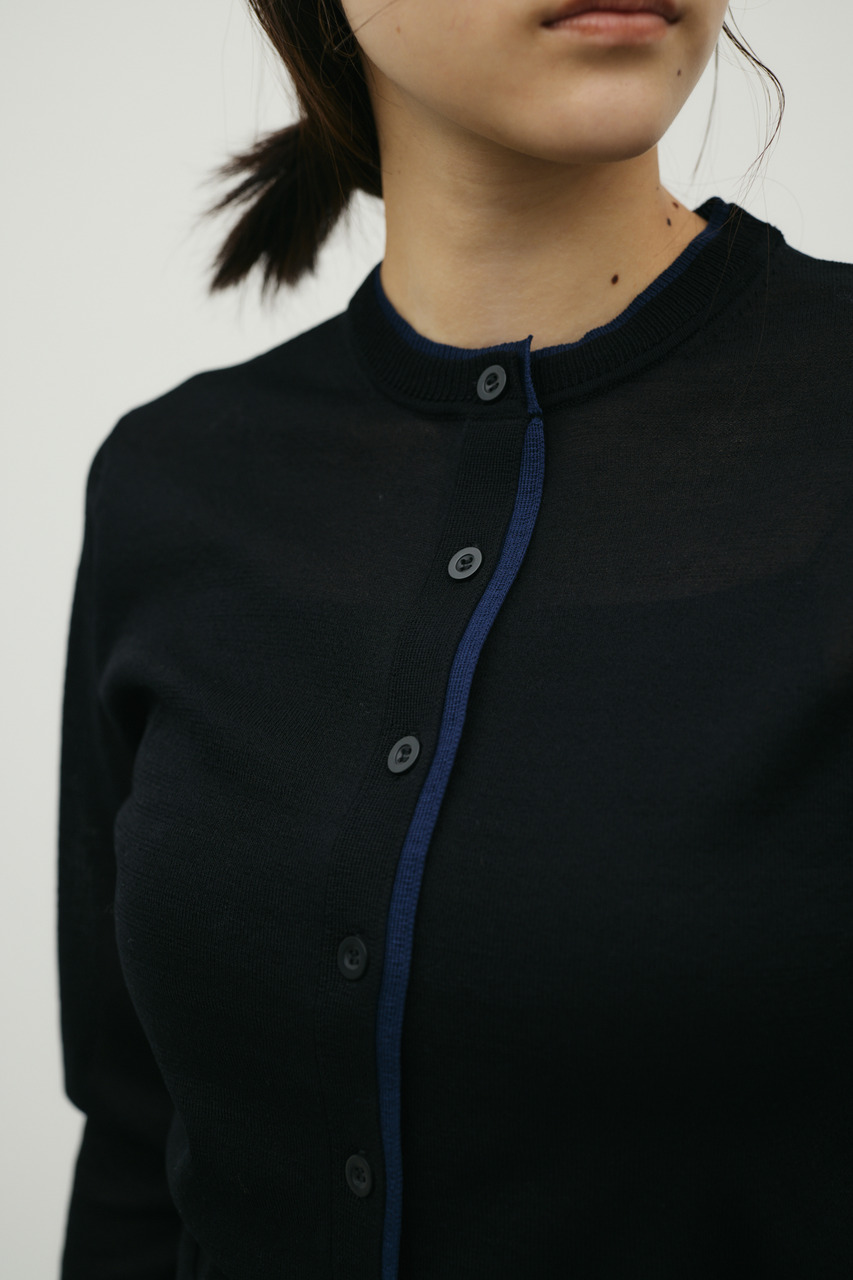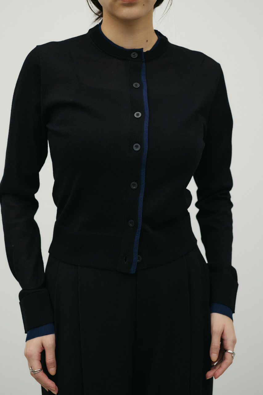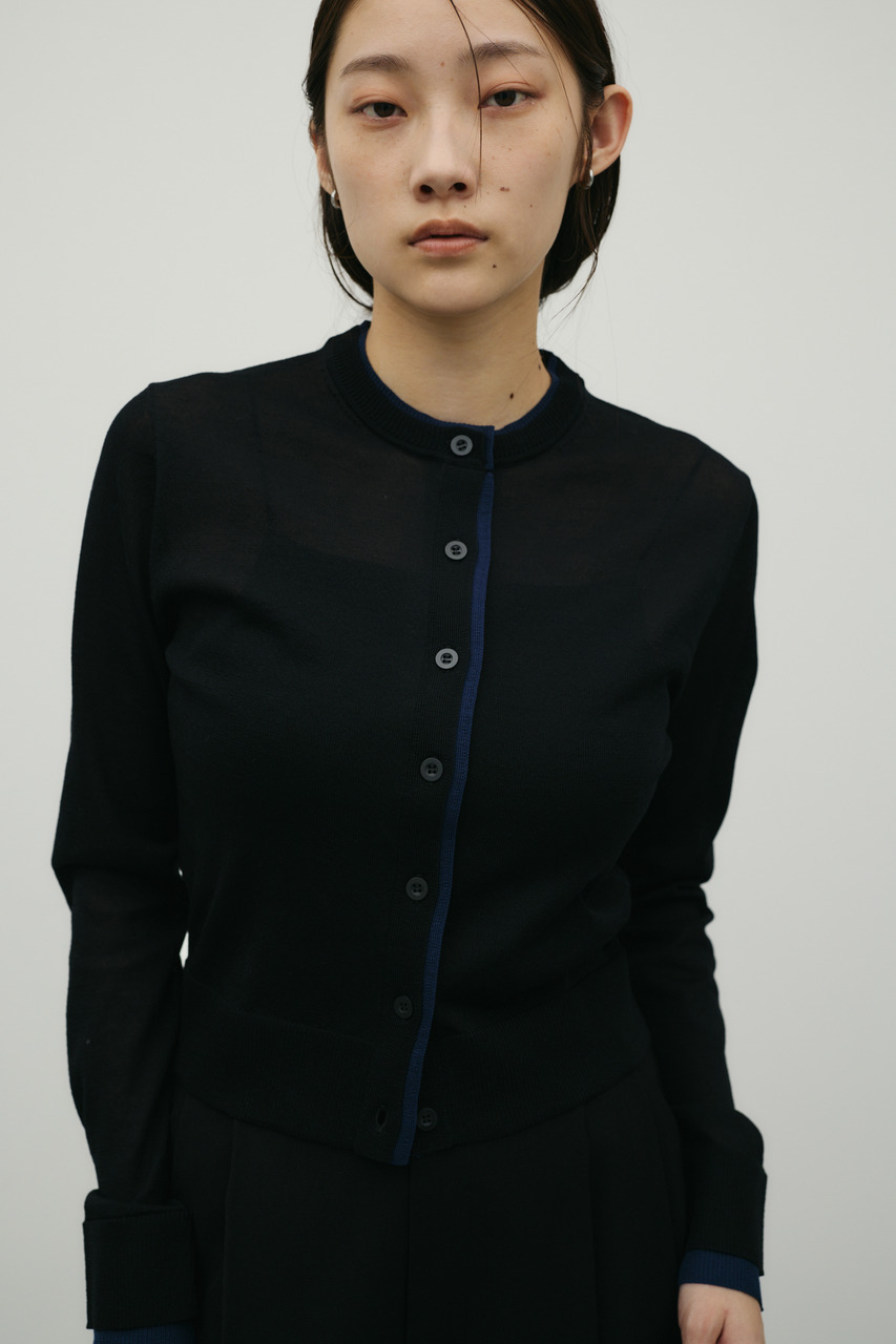 衿、前立て、袖口をバイカラーで仕立てた、配色デザインがポイントのニットカーデ。シンプルな中にさりげないコントラストを効かせたコーディネートのアクセントとして活躍する一枚です。程よくシャリ感のある糸を使用し、天竺組織で軽く編み立てているため、さらっとした肌触りで快適な着心地を叶えます。カーディガンの中にロンTなどをレイヤードしやすいシルエットに仕上げており、ジャケットやアウターの中にコーディネートしても着膨れせず着用していただけます。透け感あり、ストレッチあり。