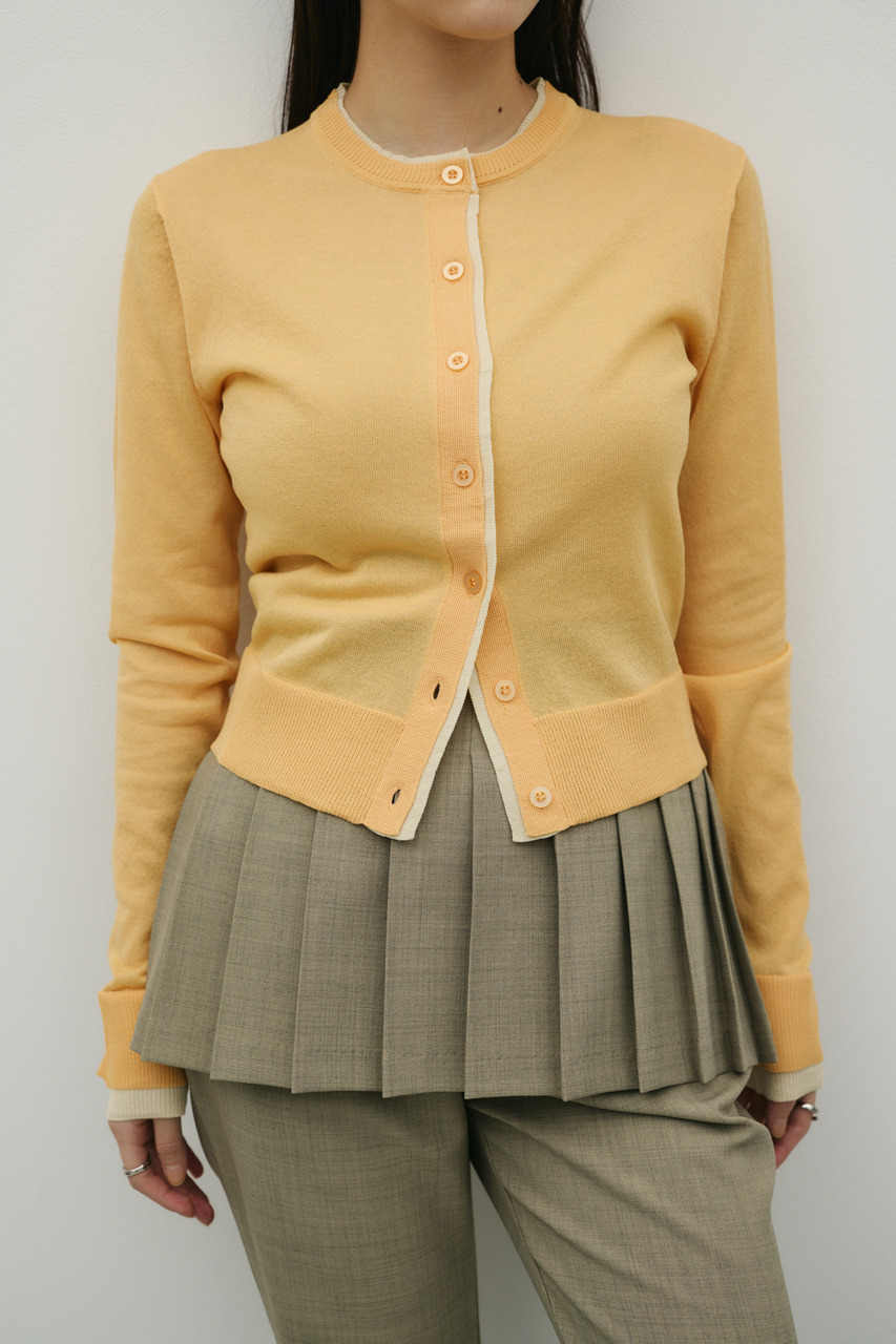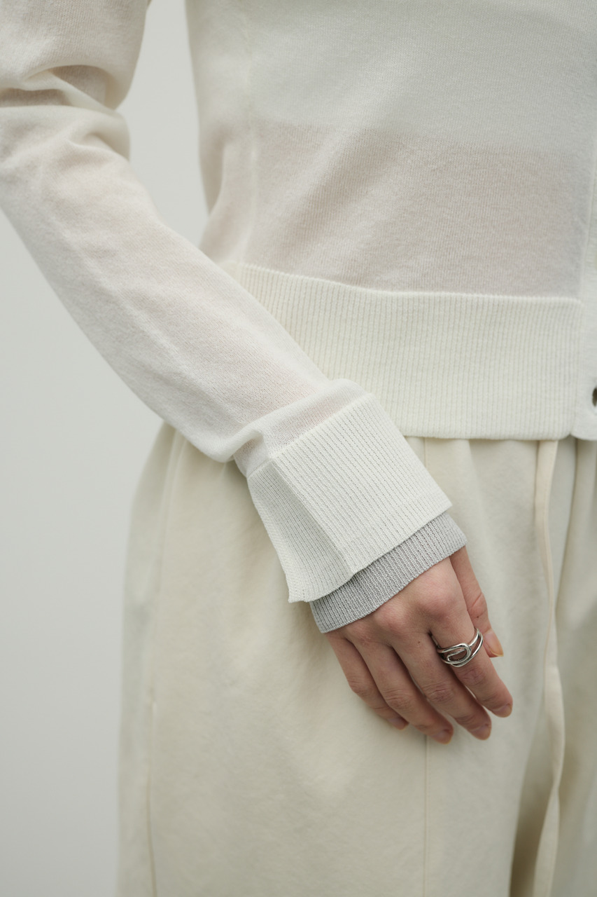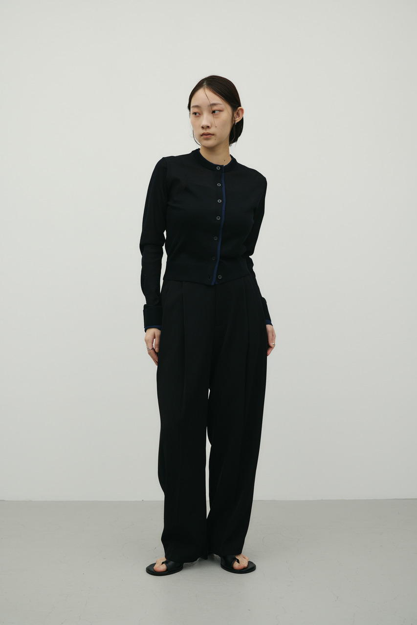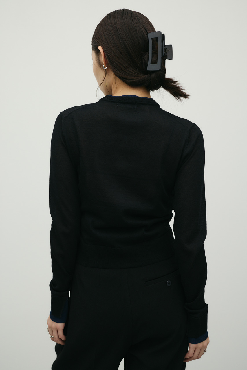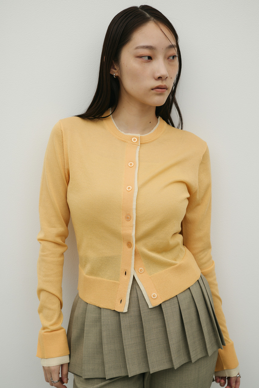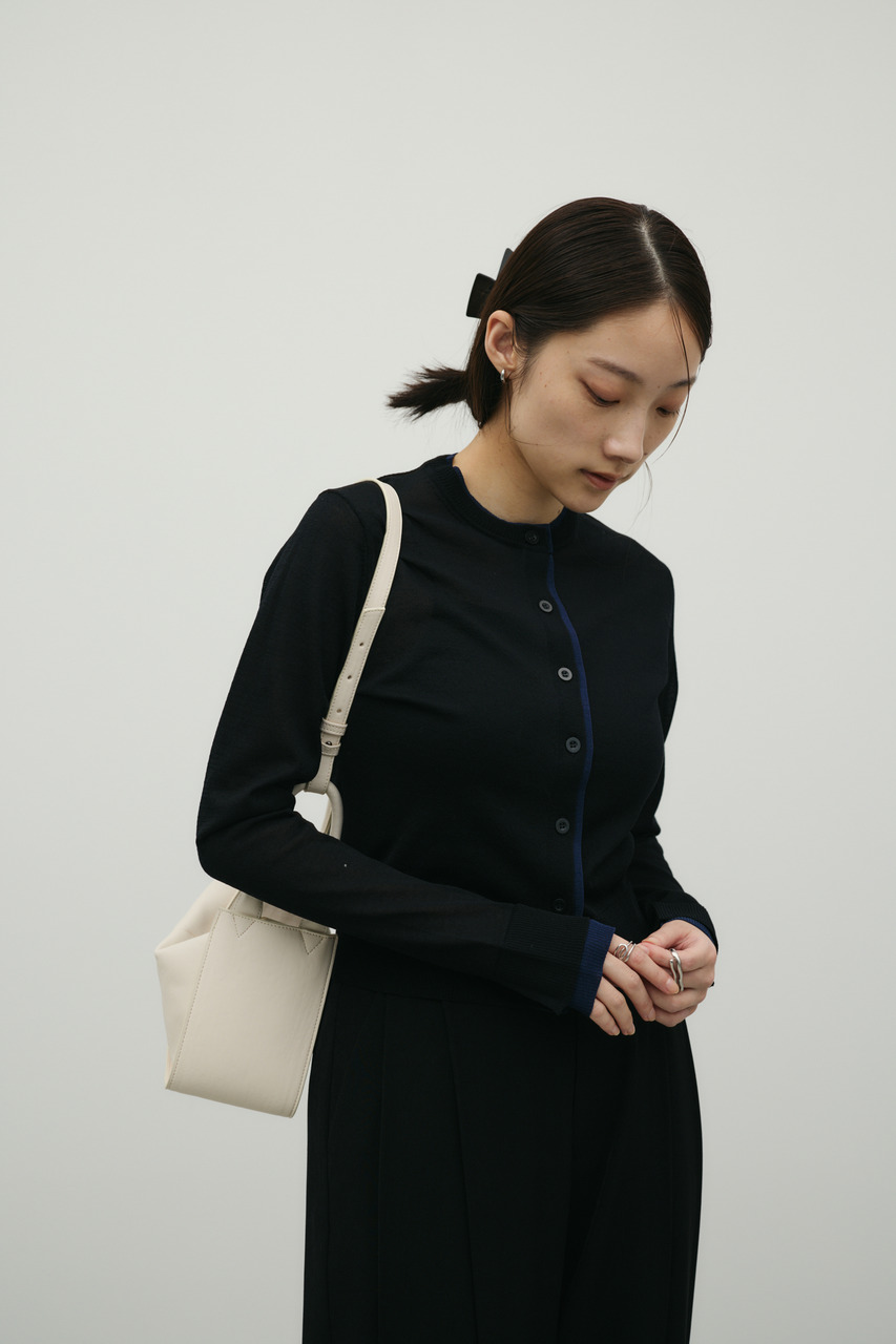 衿、前立て、袖口をバイカラーで仕立てた、配色デザインがポイントのニットカーデ。シンプルな中にさりげないコントラストを効かせたコーディネートのアクセントとして活躍する一枚です。程よくシャリ感のある糸を使用し、天竺組織で軽く編み立てているため、さらっとした肌触りで快適な着心地を叶えます。カーディガンの中にロンTなどをレイヤードしやすいシルエットに仕上げており、ジャケットやアウターの中にコーディネートしても着膨れせず着用していただけます。透け感あり、ストレッチあり。
