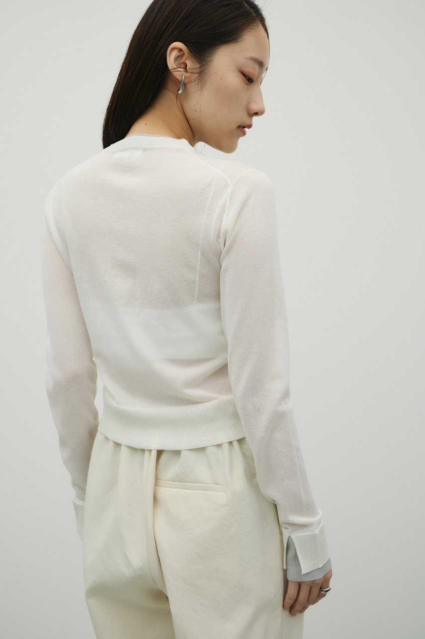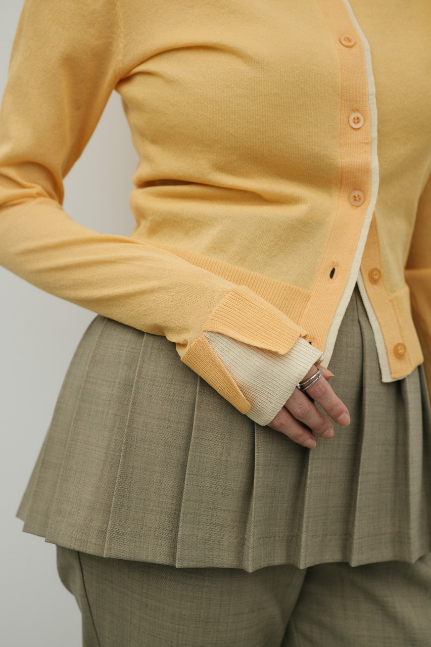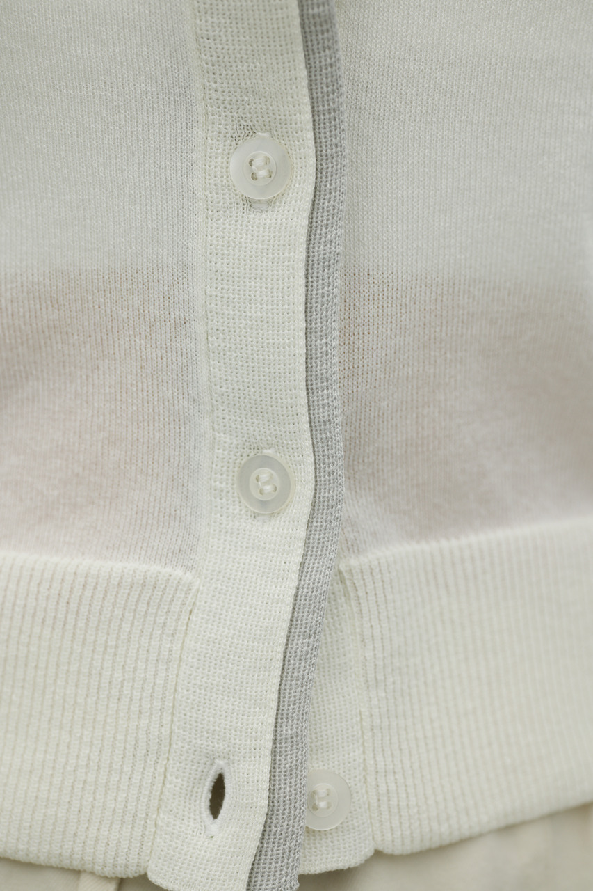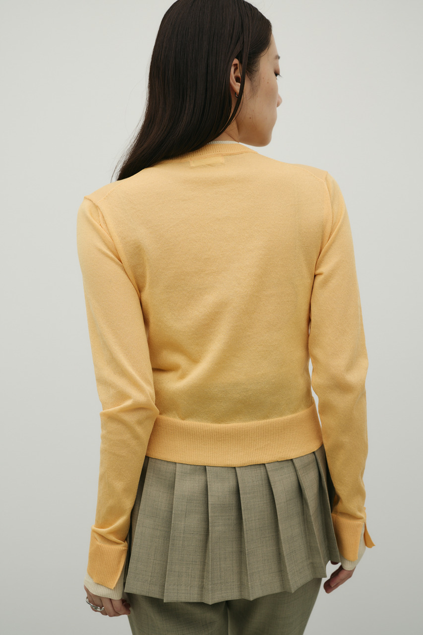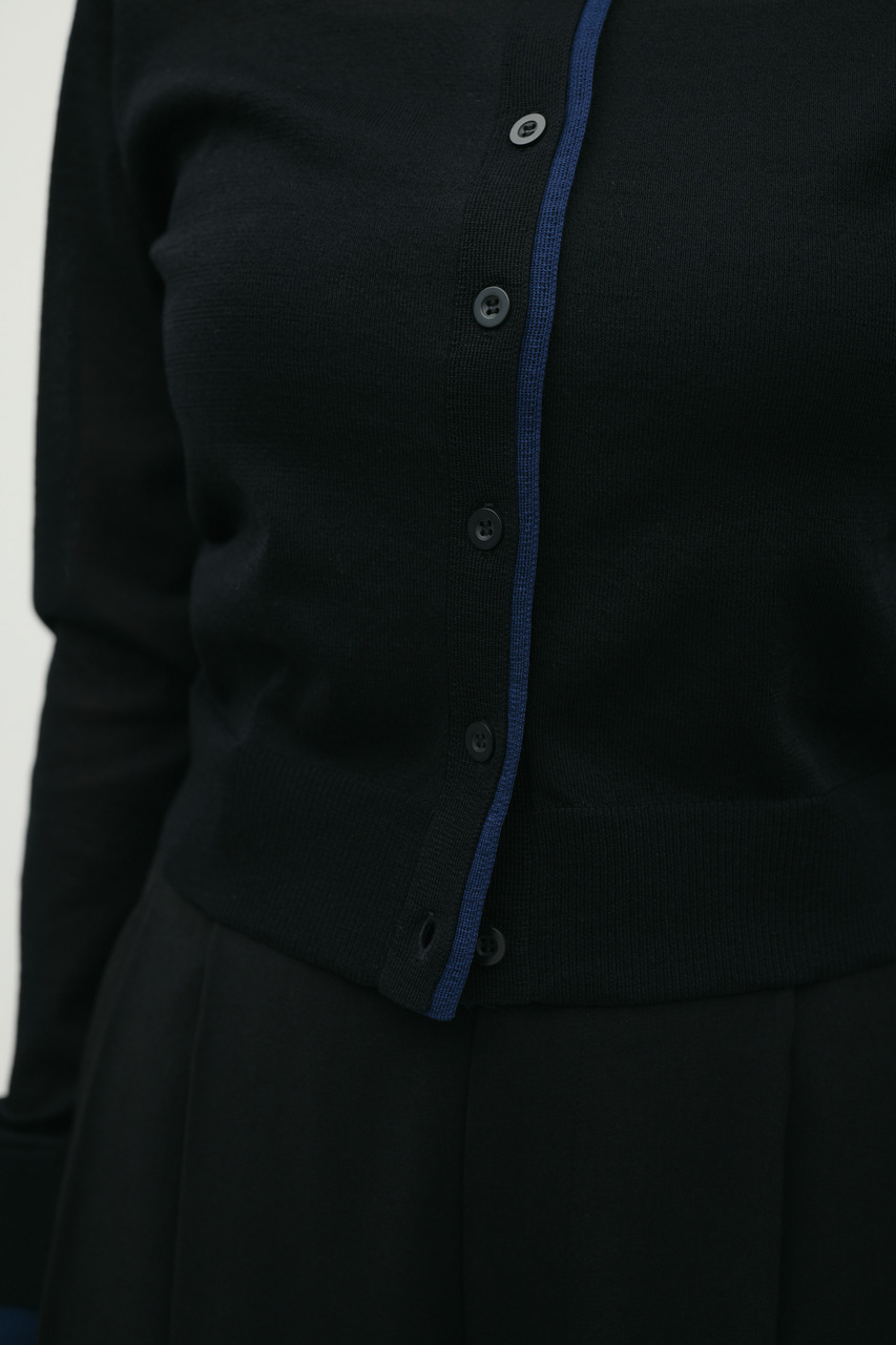 衿、前立て、袖口をバイカラーで仕立てた、配色デザインがポイントのニットカーデ。シンプルな中にさりげないコントラストを効かせたコーディネートのアクセントとして活躍する一枚です。程よくシャリ感のある糸を使用し、天竺組織で軽く編み立てているため、さらっとした肌触りで快適な着心地を叶えます。カーディガンの中にロンTなどをレイヤードしやすいシルエットに仕上げており、ジャケットやアウターの中にコーディネートしても着膨れせず着用していただけます。透け感あり、ストレッチあり。