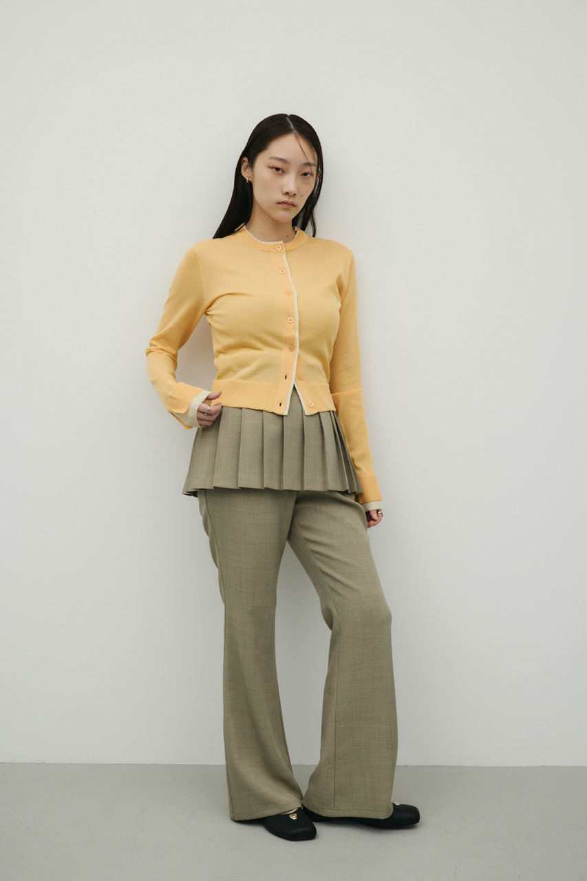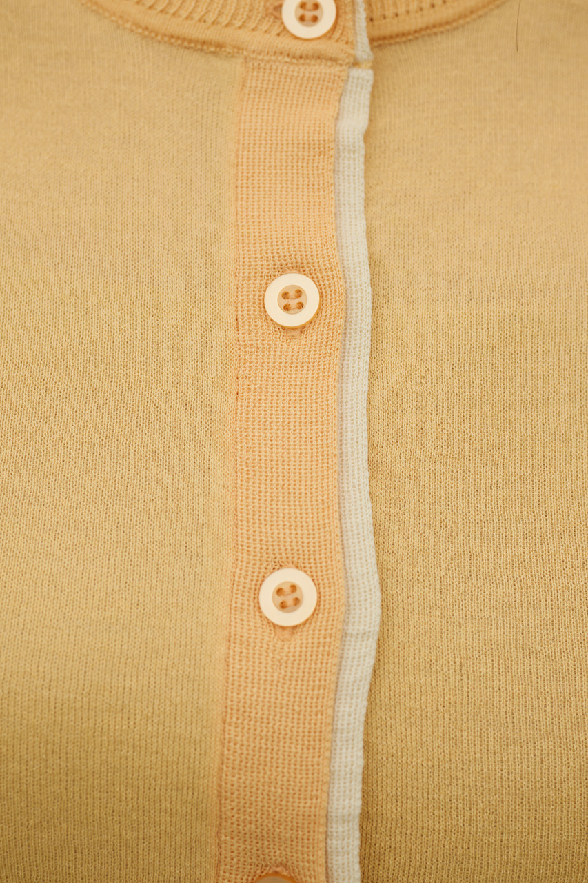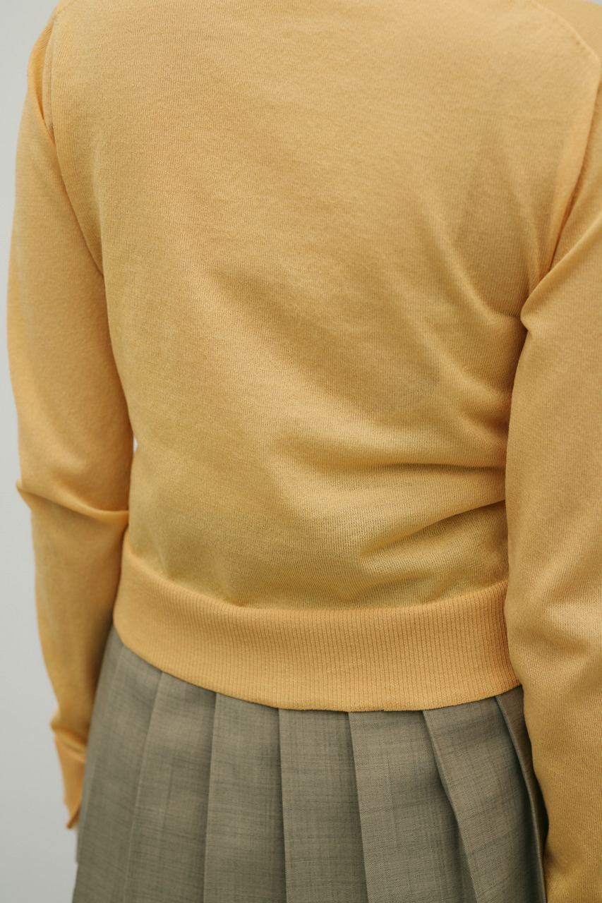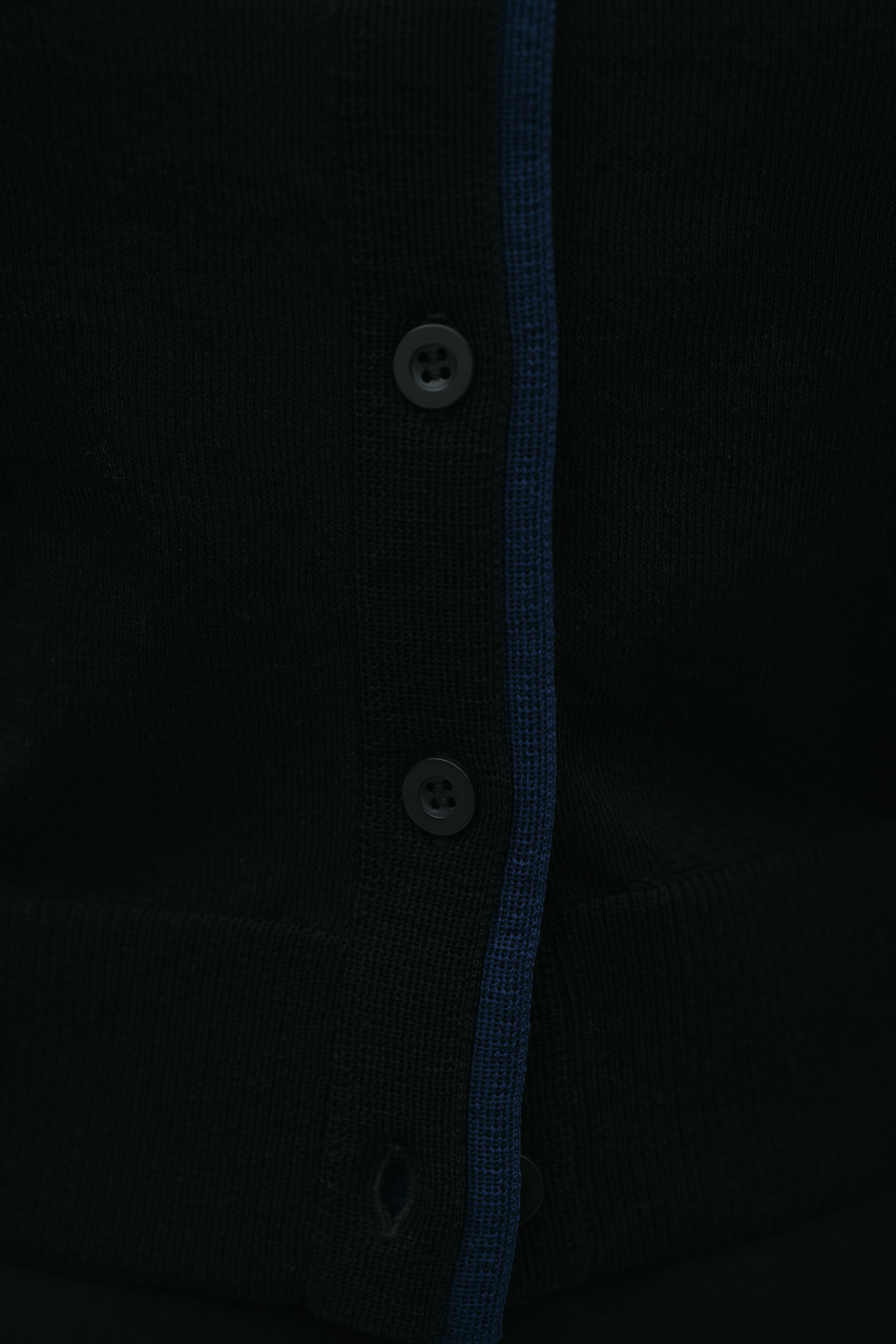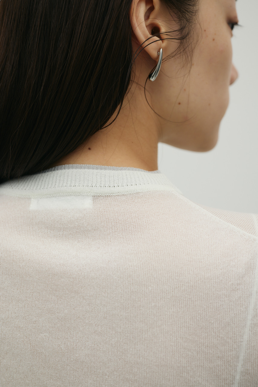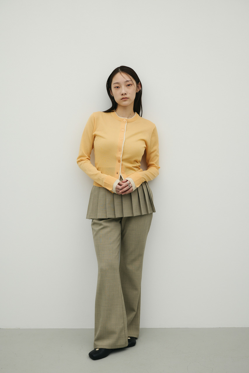 衿、前立て、袖口をバイカラーで仕立てた、配色デザインがポイントのニットカーデ。シンプルな中にさりげないコントラストを効かせたコーディネートのアクセントとして活躍する一枚です。程よくシャリ感のある糸を使用し、天竺組織で軽く編み立てているため、さらっとした肌触りで快適な着心地を叶えます。カーディガンの中にロンTなどをレイヤードしやすいシルエットに仕上げており、ジャケットやアウターの中にコーディネートしても着膨れせず着用していただけます。透け感あり、ストレッチあり。