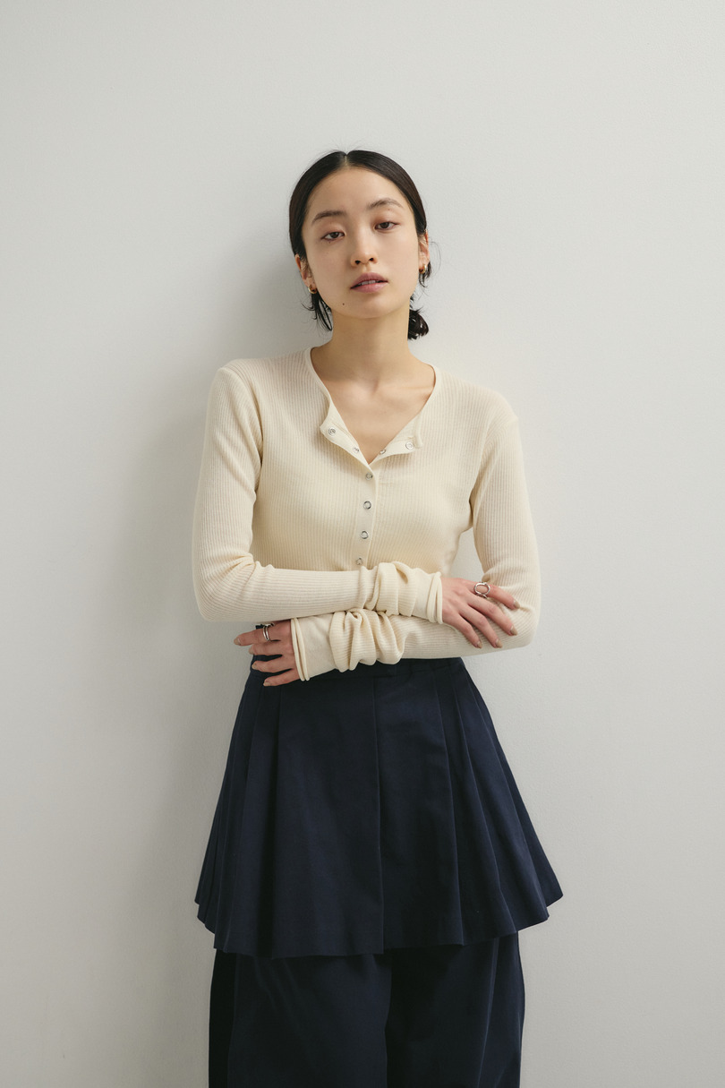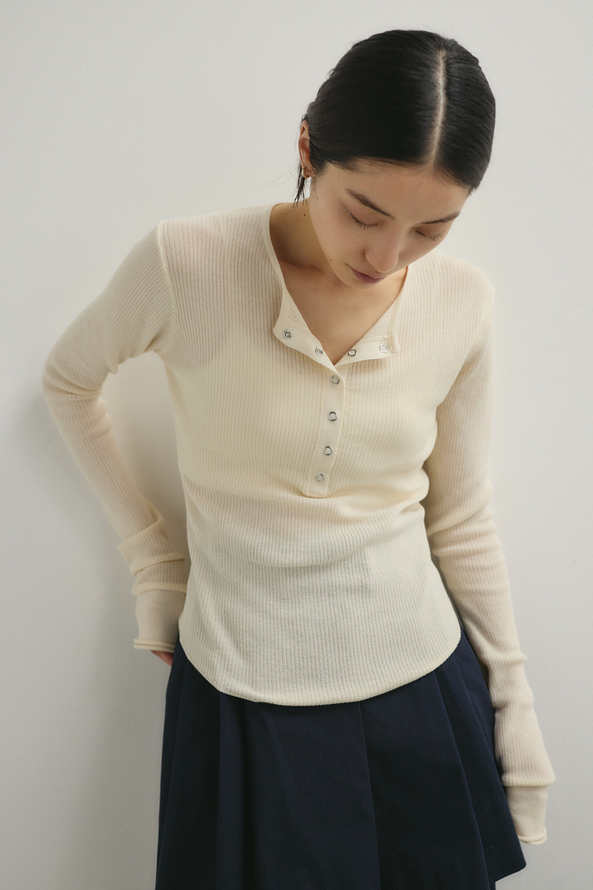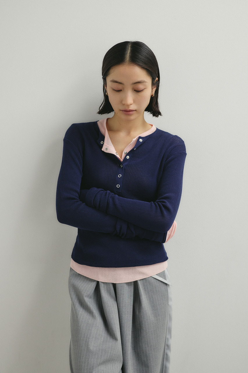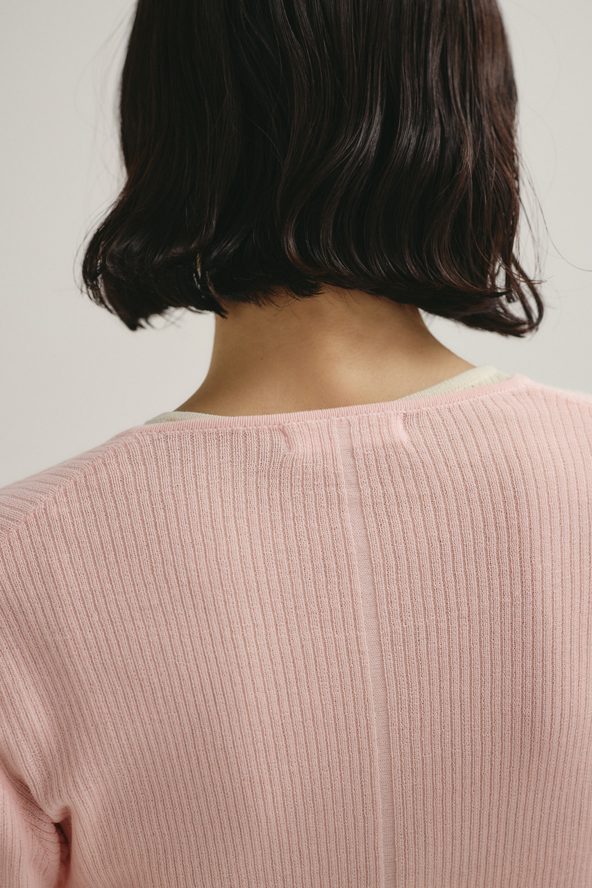 細番手のコットンナイロンの素材を使用したやわらかな風合いのシアートップス。ショルダーラインを後ろたおしたデザインで肩回りをすっきりと見せてくれます。1枚で着用するのはもちろん、重ねて着用いただくのもおすすめです。ストレッチあり、透け感あり。