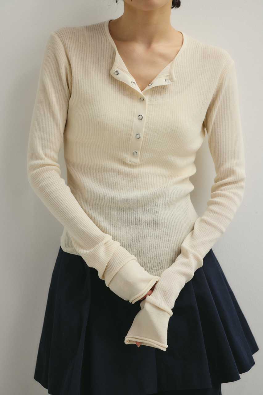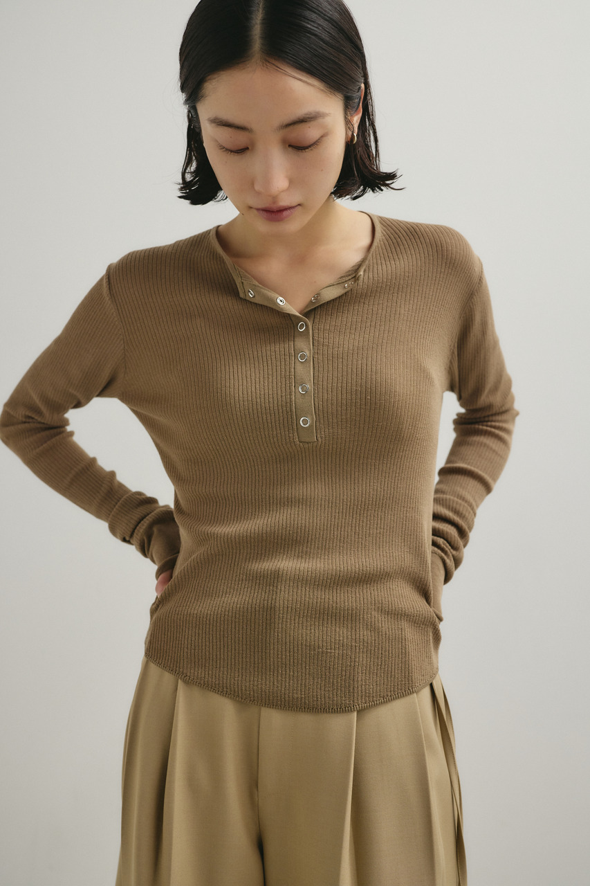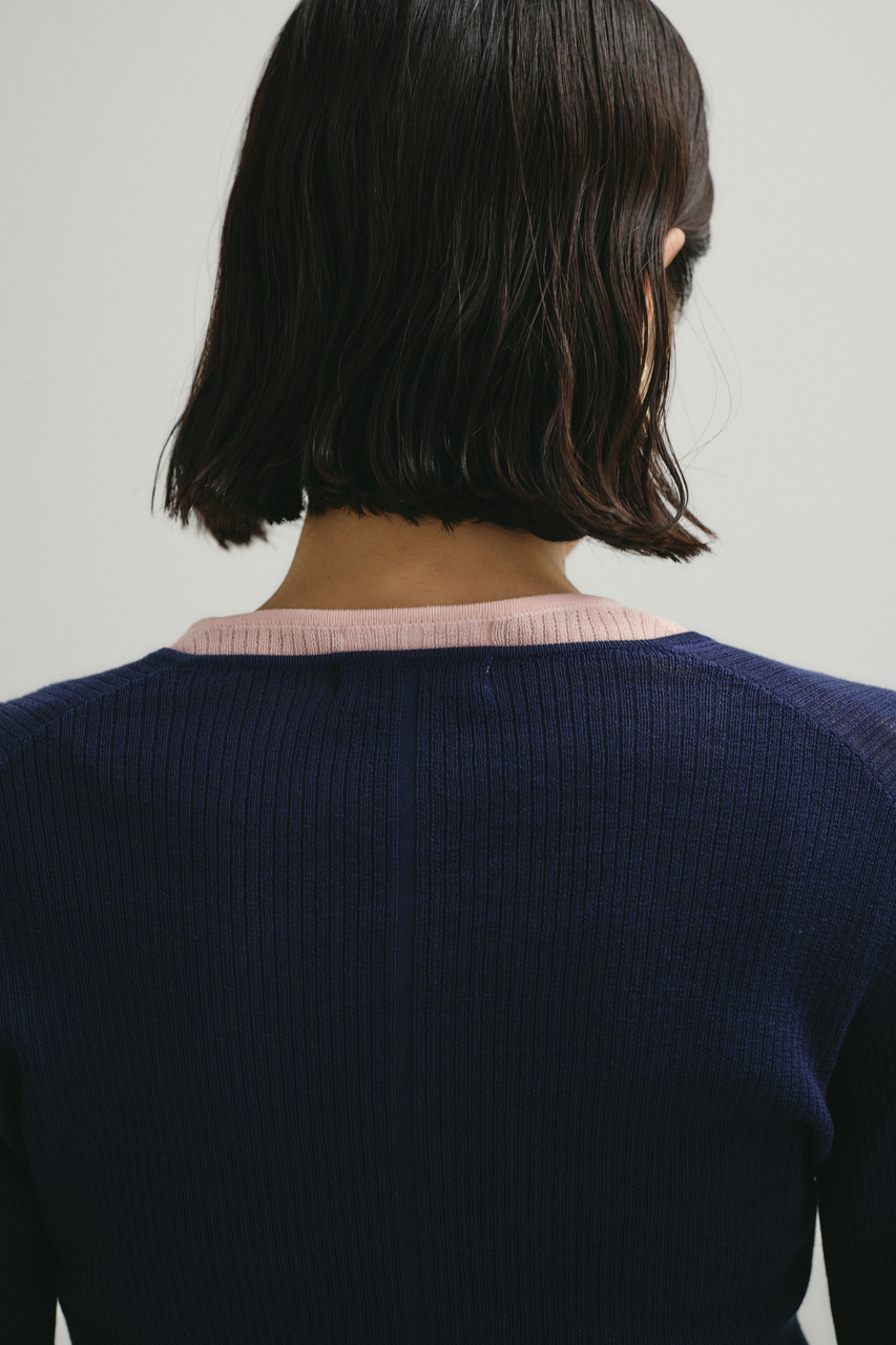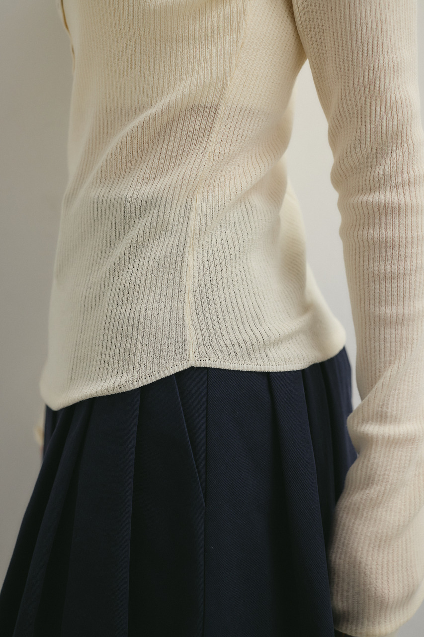 細番手のコットンナイロンの素材を使用したやわらかな風合いのシアートップス。ショルダーラインを後ろたおしたデザインで肩回りをすっきりと見せてくれます。1枚で着用するのはもちろん、重ねて着用いただくのもおすすめです。ストレッチあり、透け感あり。