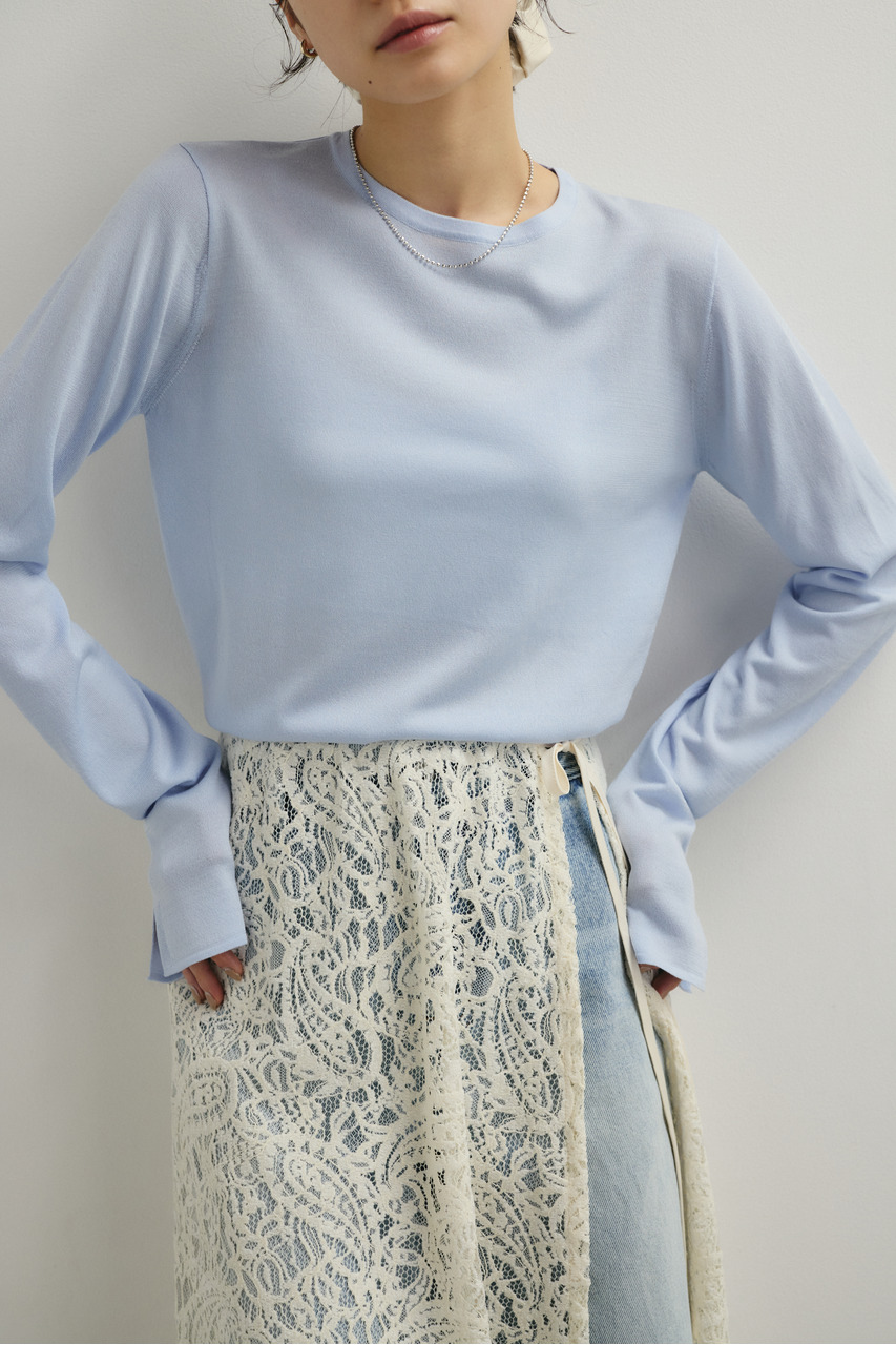 長め袖と袖口スリットがスタイリングのポイントになるモードかつ上品見えする万能ニット。しなやかで身体馴染みの良いハイゲージ素材を使用着心地抜群です。透け感ややあり、ストレッチあり。