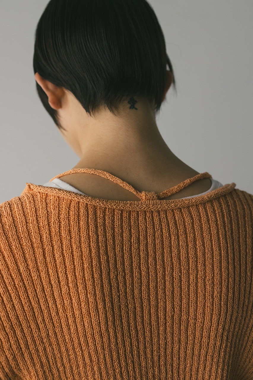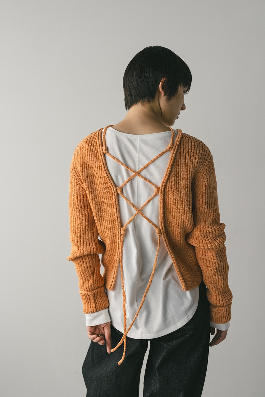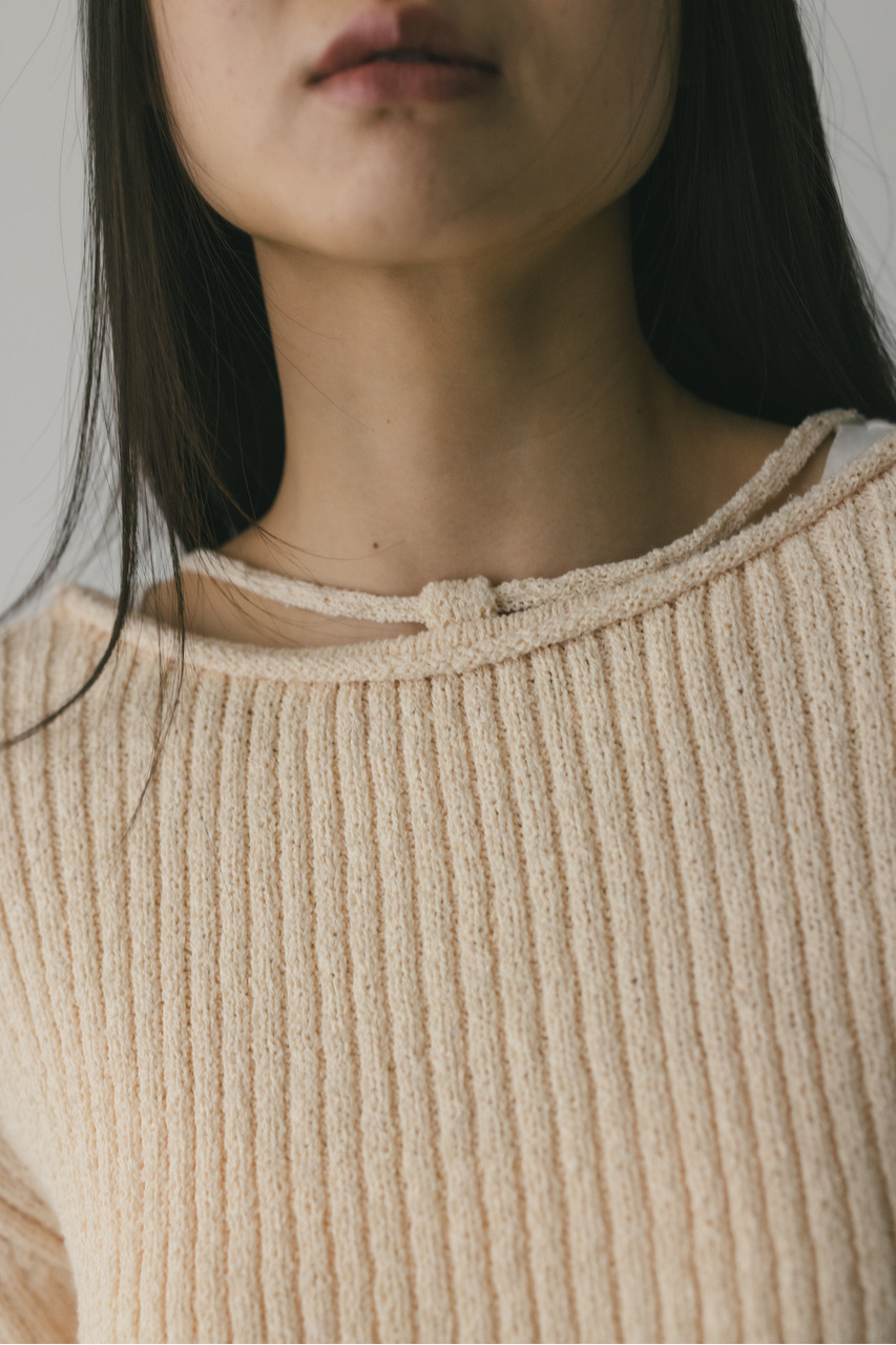 フロントに施されたレースアップがコーディネートに抜け感と女性らしさをプラスしてくれるニット。ブークレー糸を使用してリブで編み立てることで表面感のあるトップスに仕上げました。紐を通すループは高めの位置までにしているので、リボン結びをしたり、あえてルーズに紐をたらしたままにするのもおすすめ。襟ぐりと袖口はくるんとカール仕様になっており、細部までおしゃれさを追求したニットです。ストレッチあり、透け感なし。