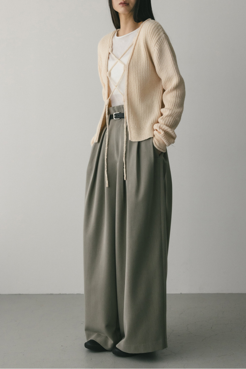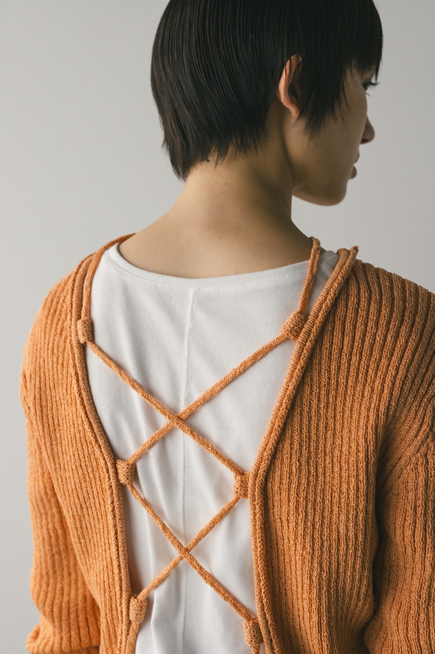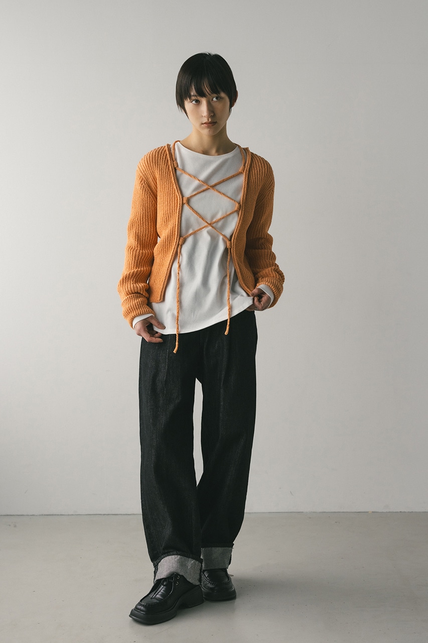 フロントに施されたレースアップがコーディネートに抜け感と女性らしさをプラスしてくれるニット。ブークレー糸を使用してリブで編み立てることで表面感のあるトップスに仕上げました。紐を通すループは高めの位置までにしているので、リボン結びをしたり、あえてルーズに紐をたらしたままにするのもおすすめ。襟ぐりと袖口はくるんとカール仕様になっており、細部までおしゃれさを追求したニットです。ストレッチあり、透け感なし。
