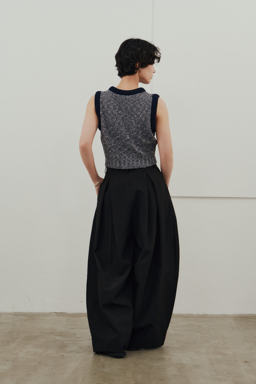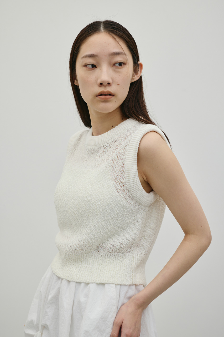 ネップ調の糸とコットン糸を引き揃え、鹿の子編みで仕立てた表情豊かなメランジニット。衿と袖口のぷっくりとしたリブデザインがさりげないアクセントに。表情感のある編み地とコンパクトなサイズ感で一枚でトレンド感のあるスタイリングを楽しめます。ストレッチあり、透け感あり。