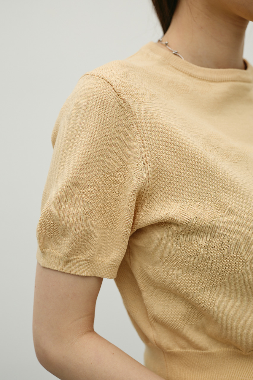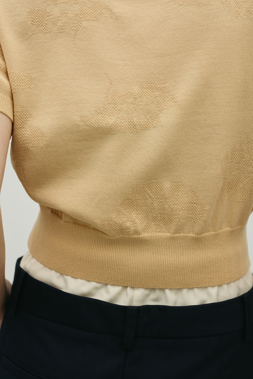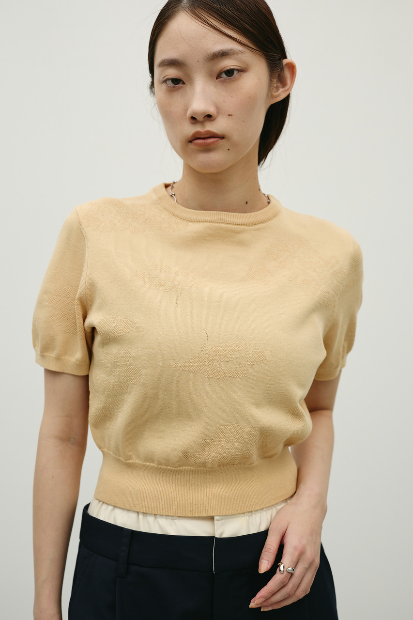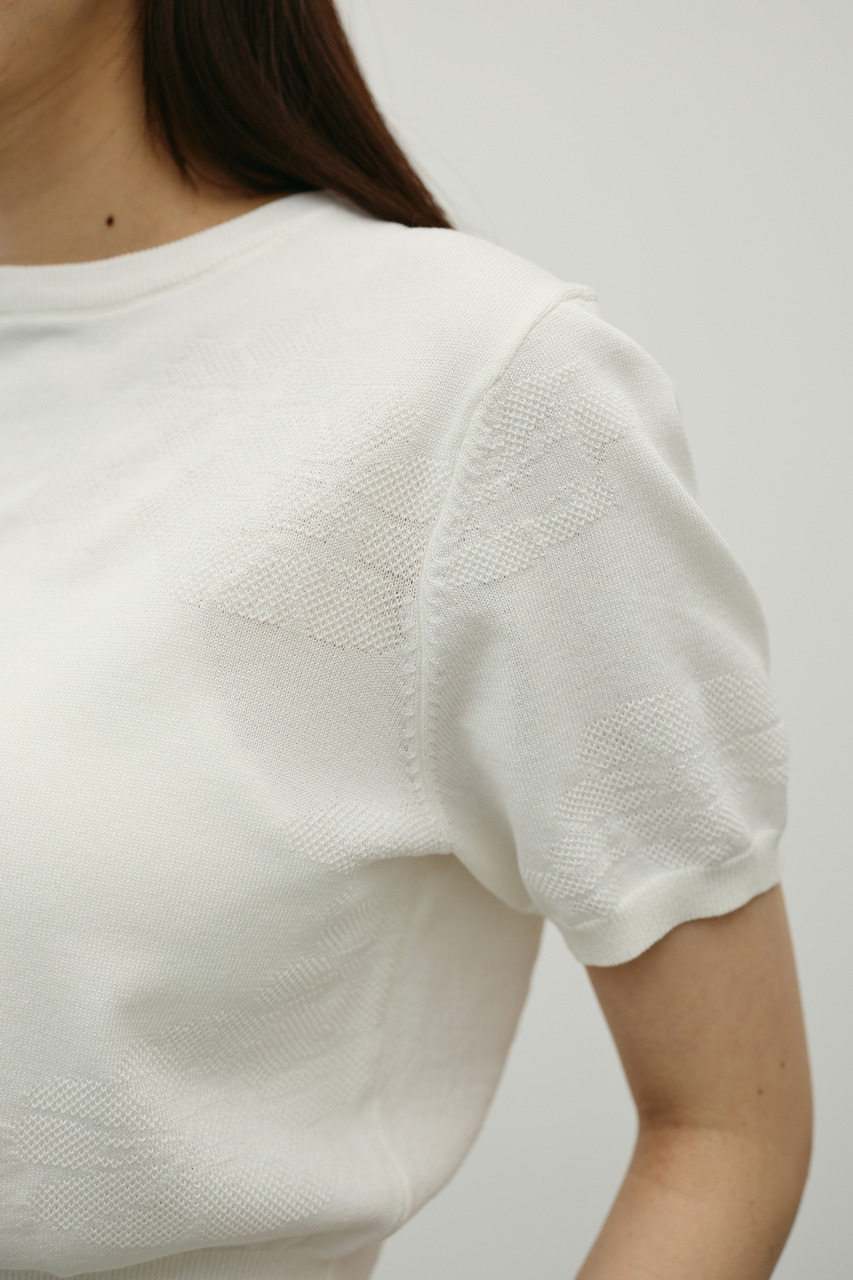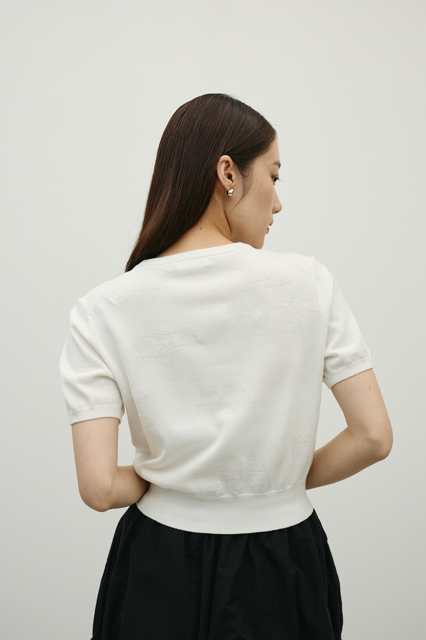 抽象的な花柄をジャガード編みで仕立てた軽やかで清涼感のあるニット。袖口と裾はリブで引き締め、着用するとパフっと丸みのあるシルエットでポイント。デニムと合わせたカジュアルスタイルやスカートと合わせたフェミニンスタイルもおすすめです。透け感WHTややあり、ストレッチあり。