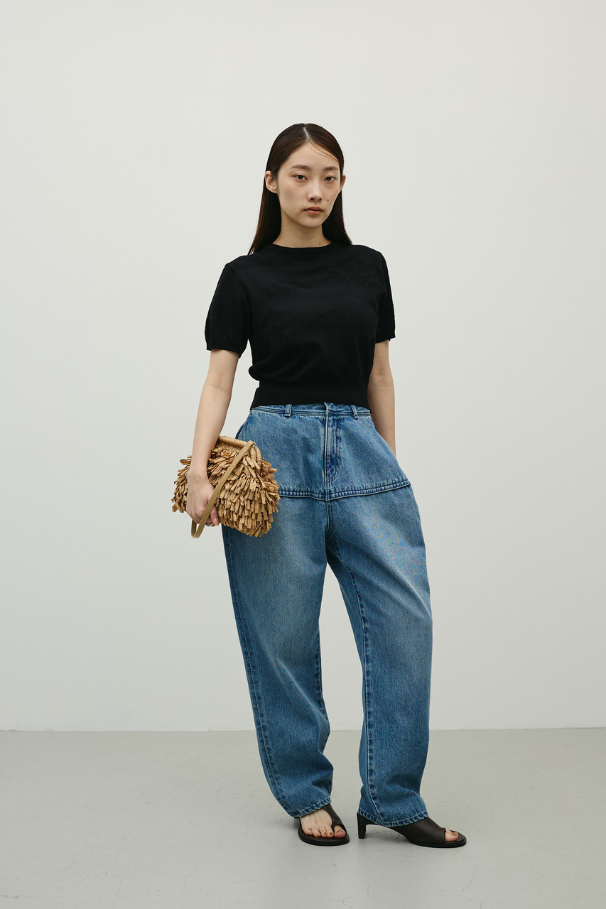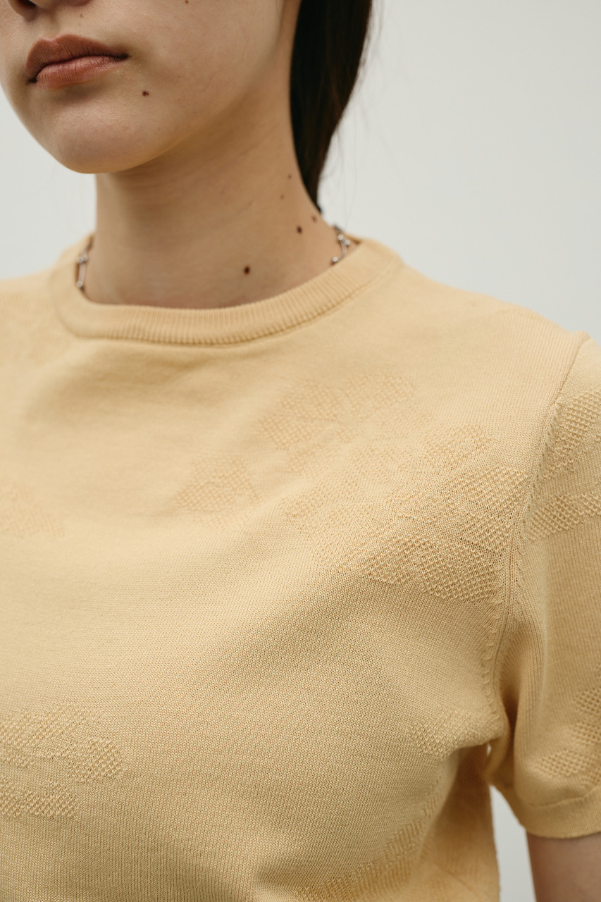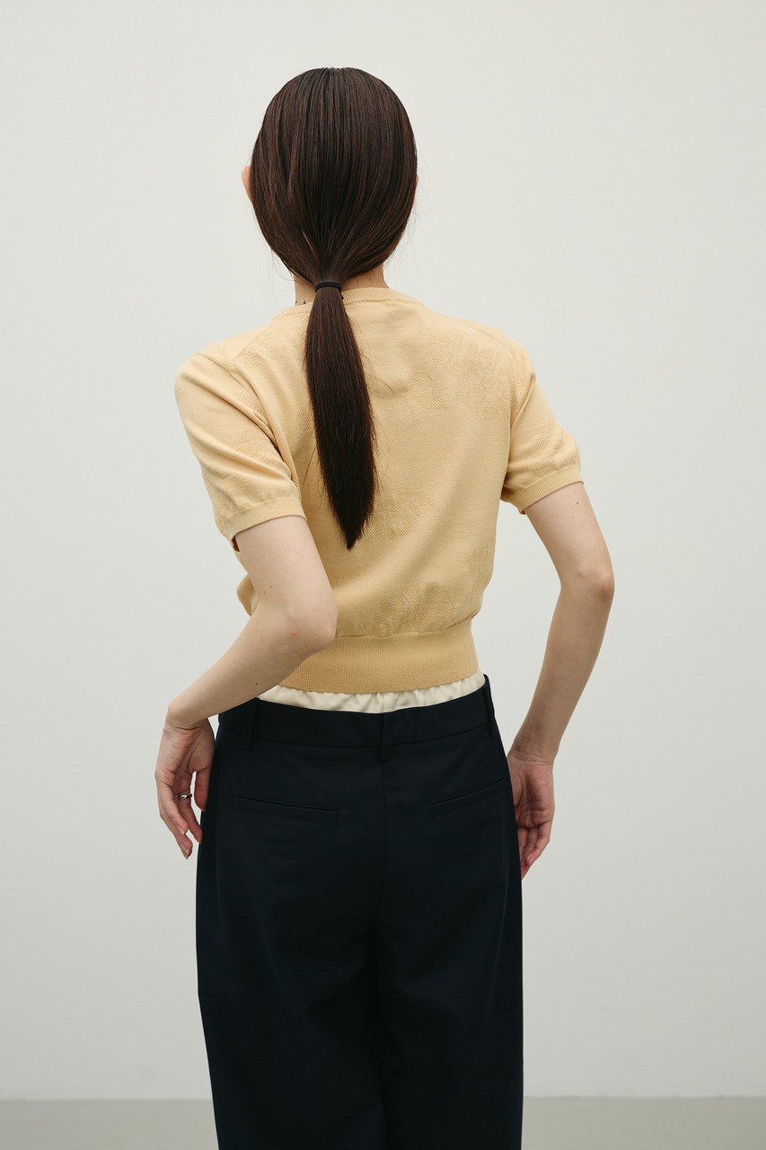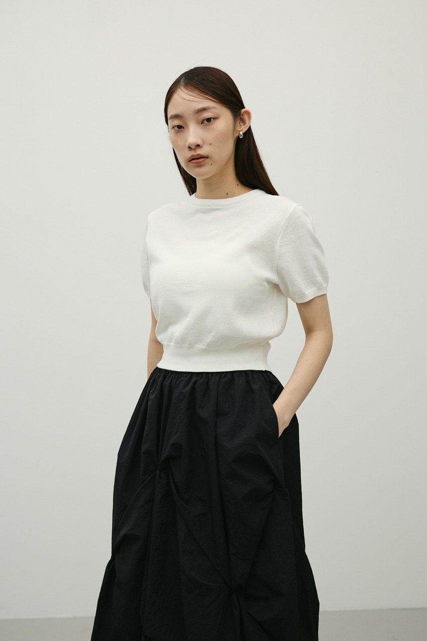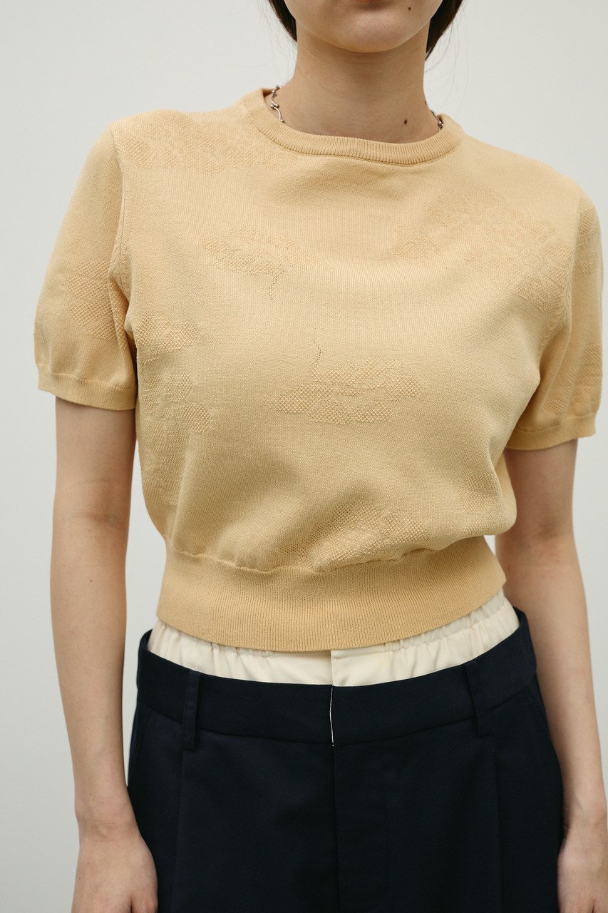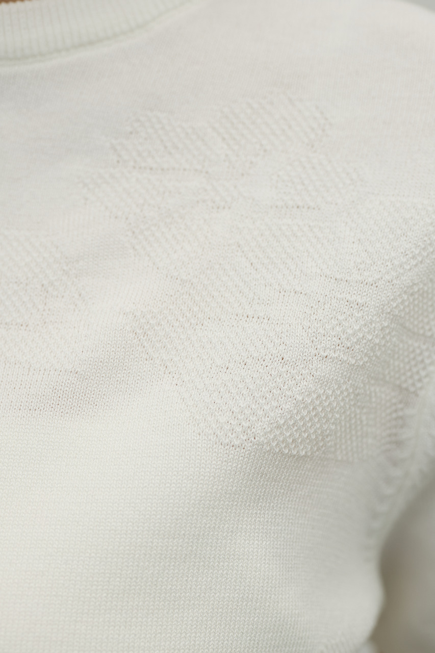 抽象的な花柄をジャガード編みで仕立てた軽やかで清涼感のあるニット。袖口と裾はリブで引き締め、着用するとパフっと丸みのあるシルエットでポイント。デニムと合わせたカジュアルスタイルやスカートと合わせたフェミニンスタイルもおすすめです。透け感WHTややあり、ストレッチあり。