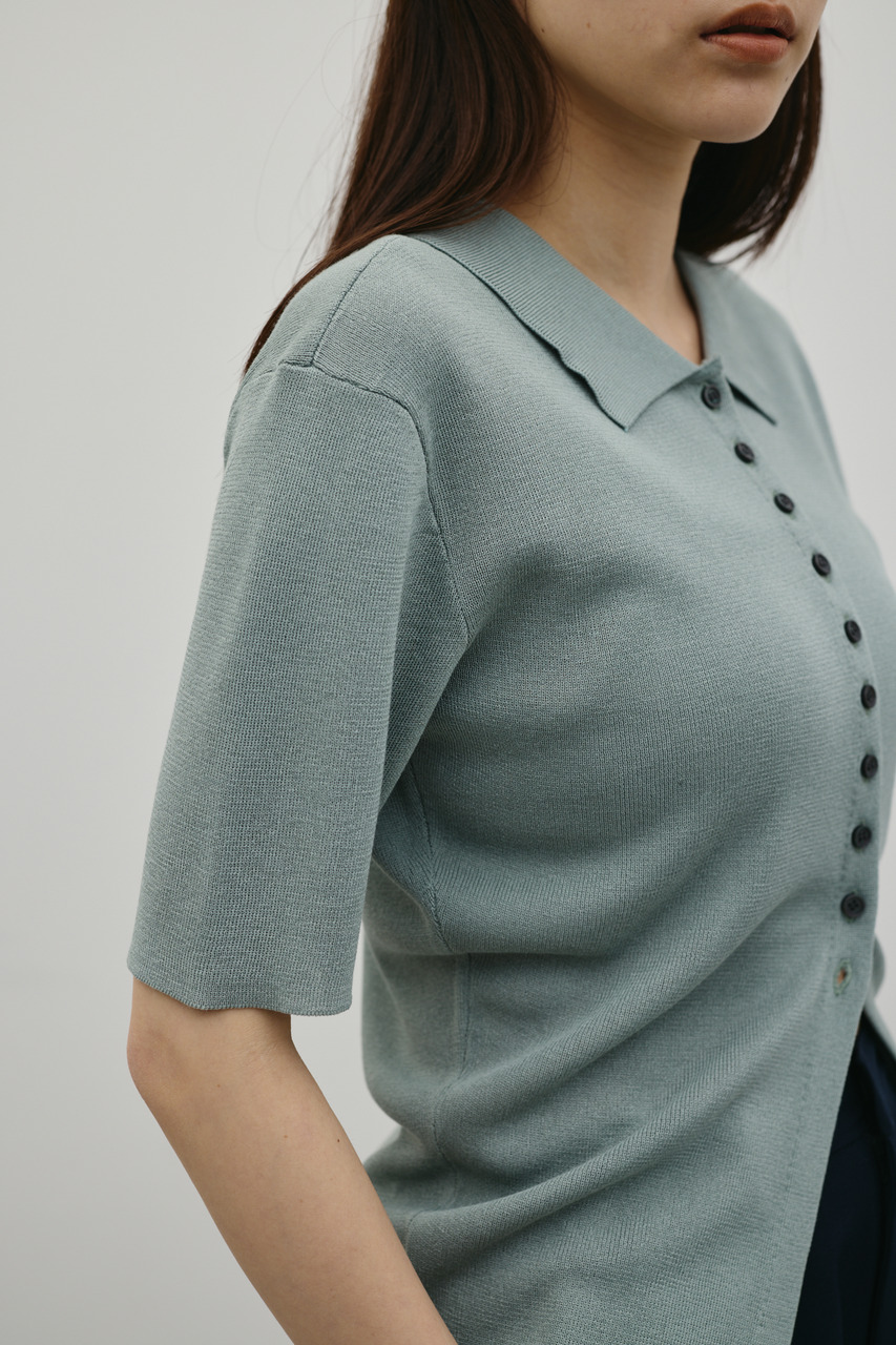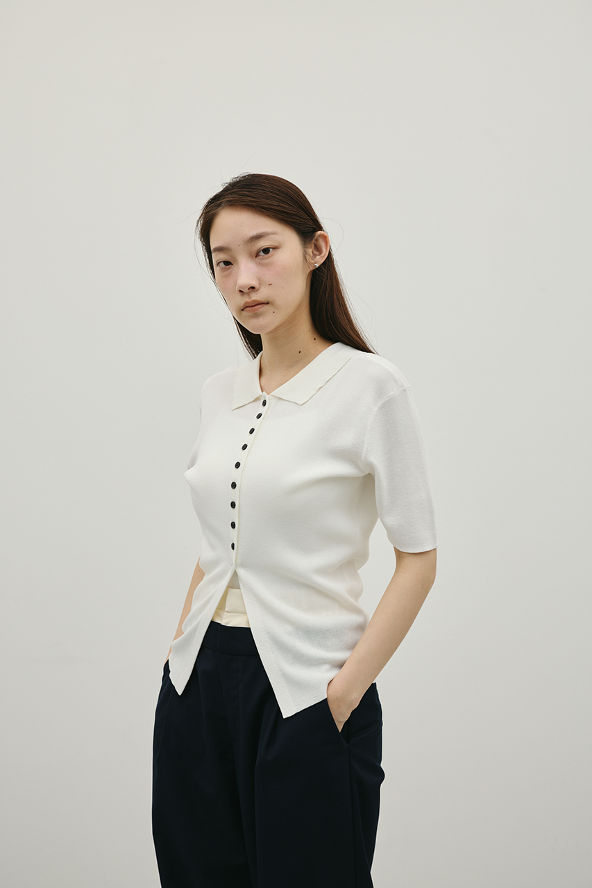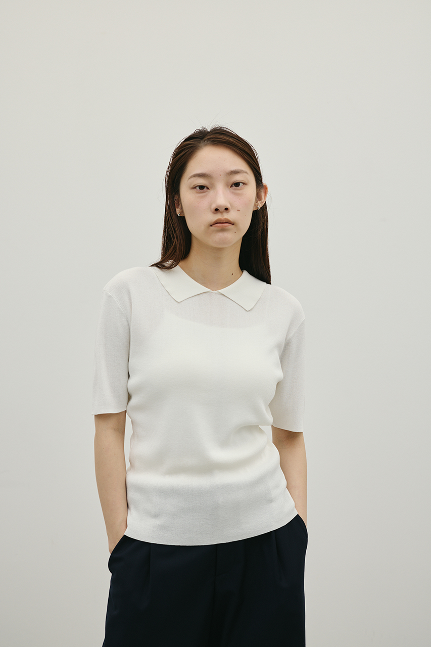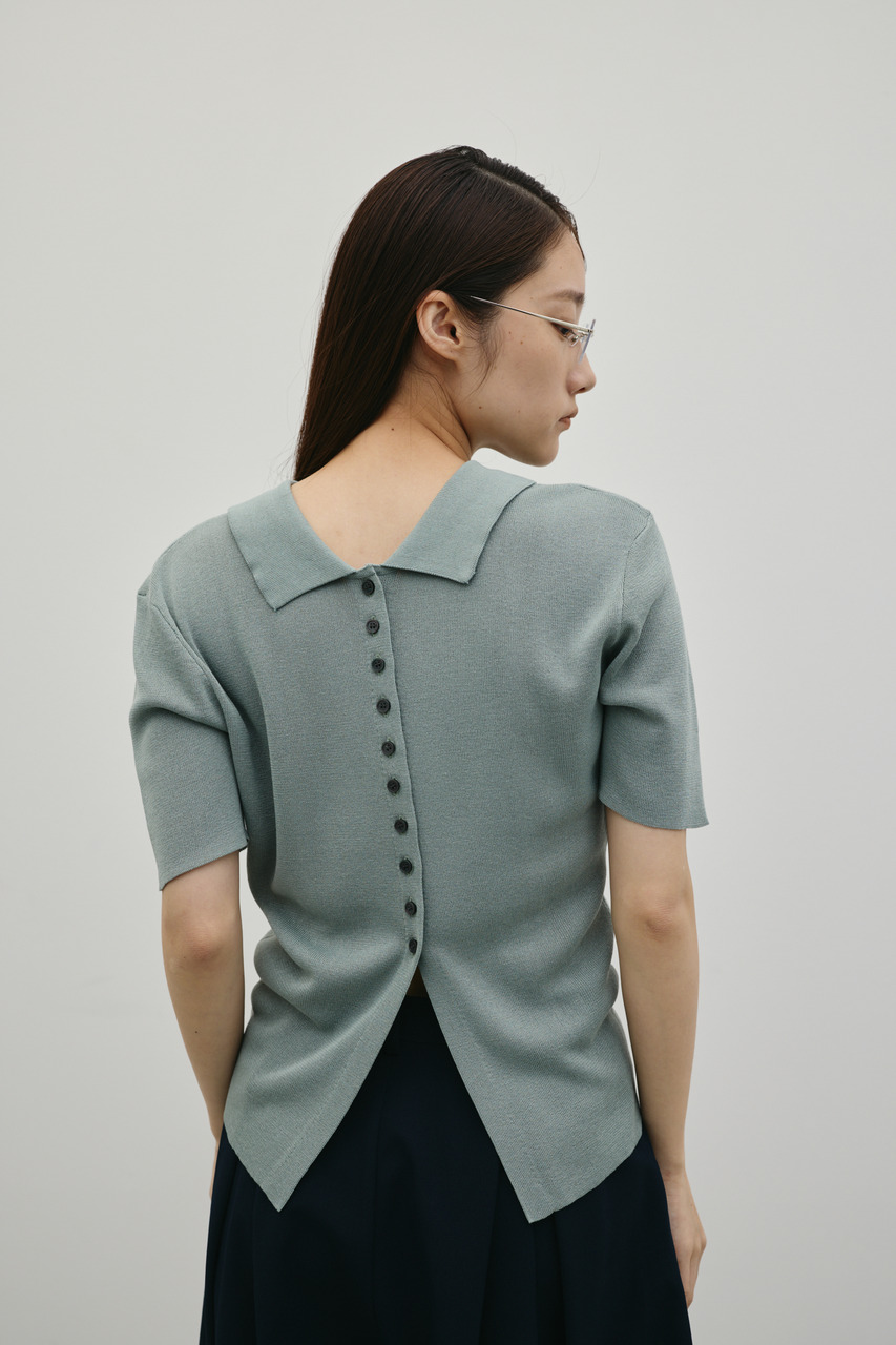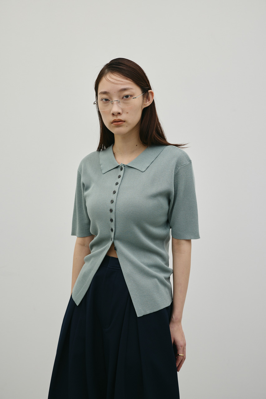 前後2WAYで着用可能なニットポロ。なめらかでさらりとした糸を使用。ビスコース混の微光沢が上品な印象に見せてくれます。総針に編み立てにしているのでボディーラインもひびきにくい一枚です。ストレッチあり、透け感なし。