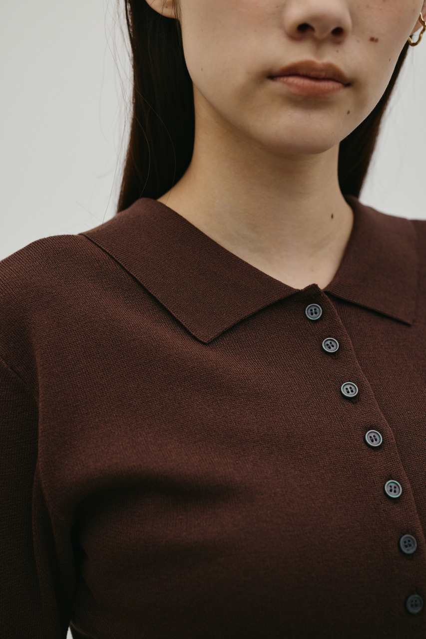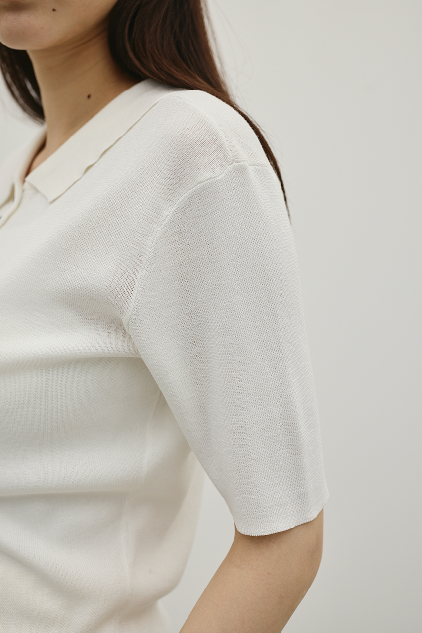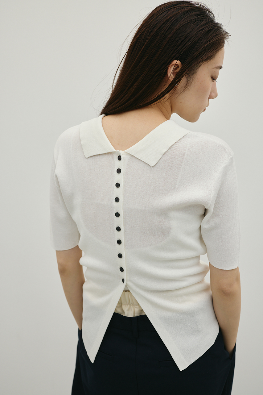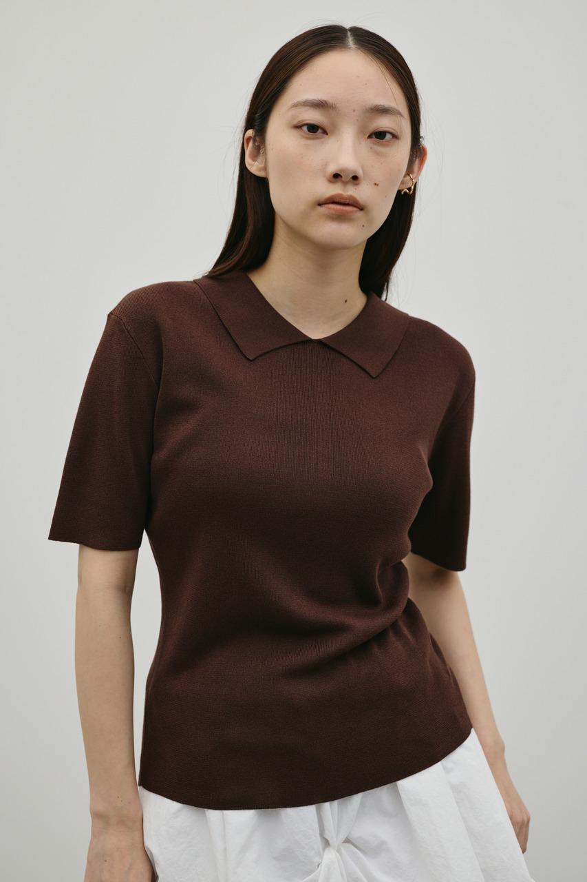 前後2WAYで着用可能なニットポロ。なめらかでさらりとした糸を使用。ビスコース混の微光沢が上品な印象に見せてくれます。総針に編み立てにしているのでボディーラインもひびきにくい一枚です。ストレッチあり、透け感なし。