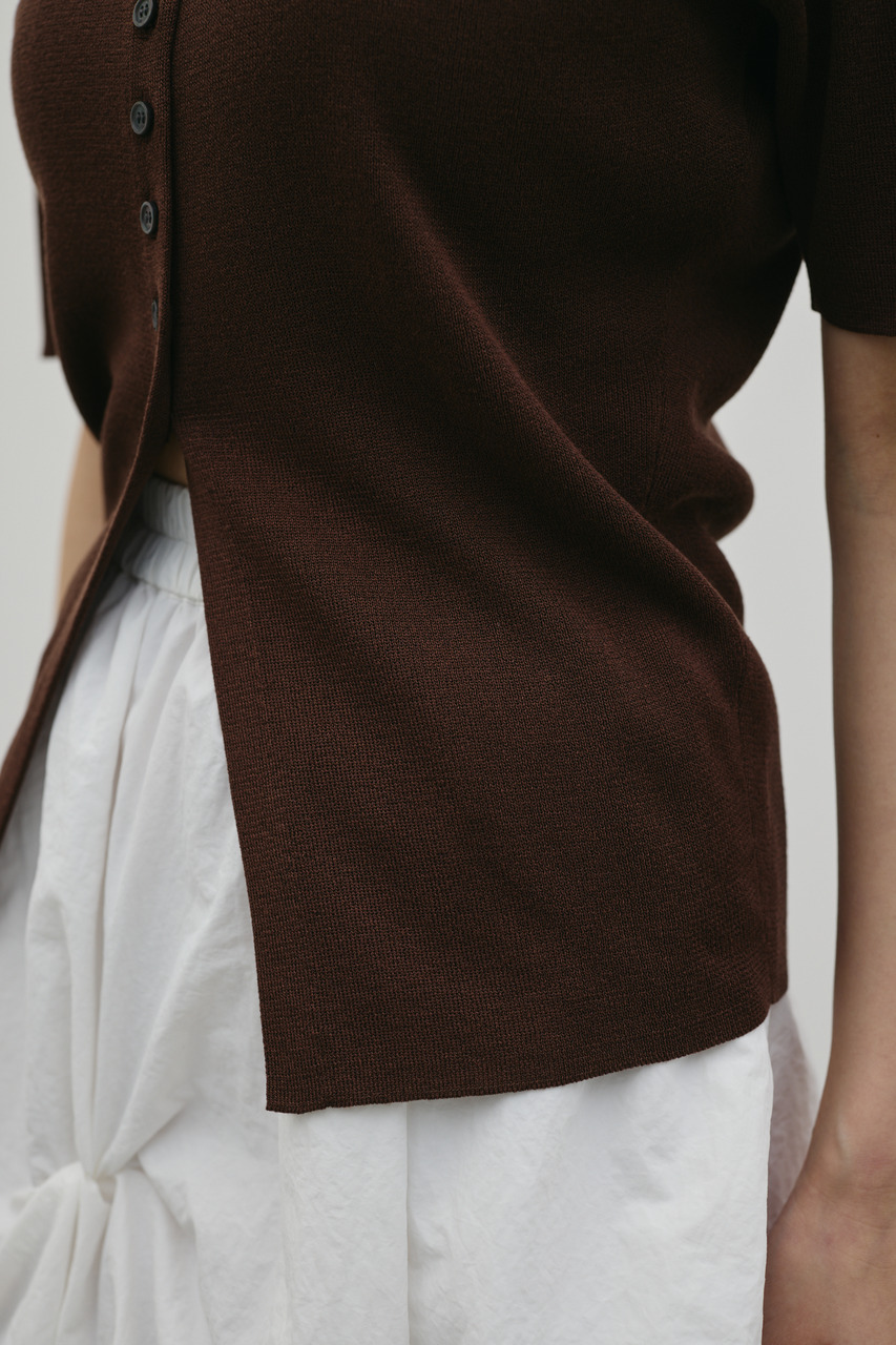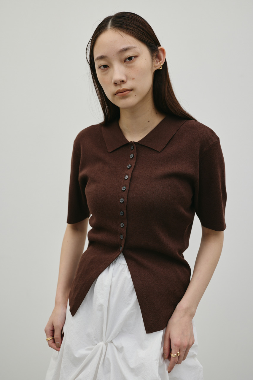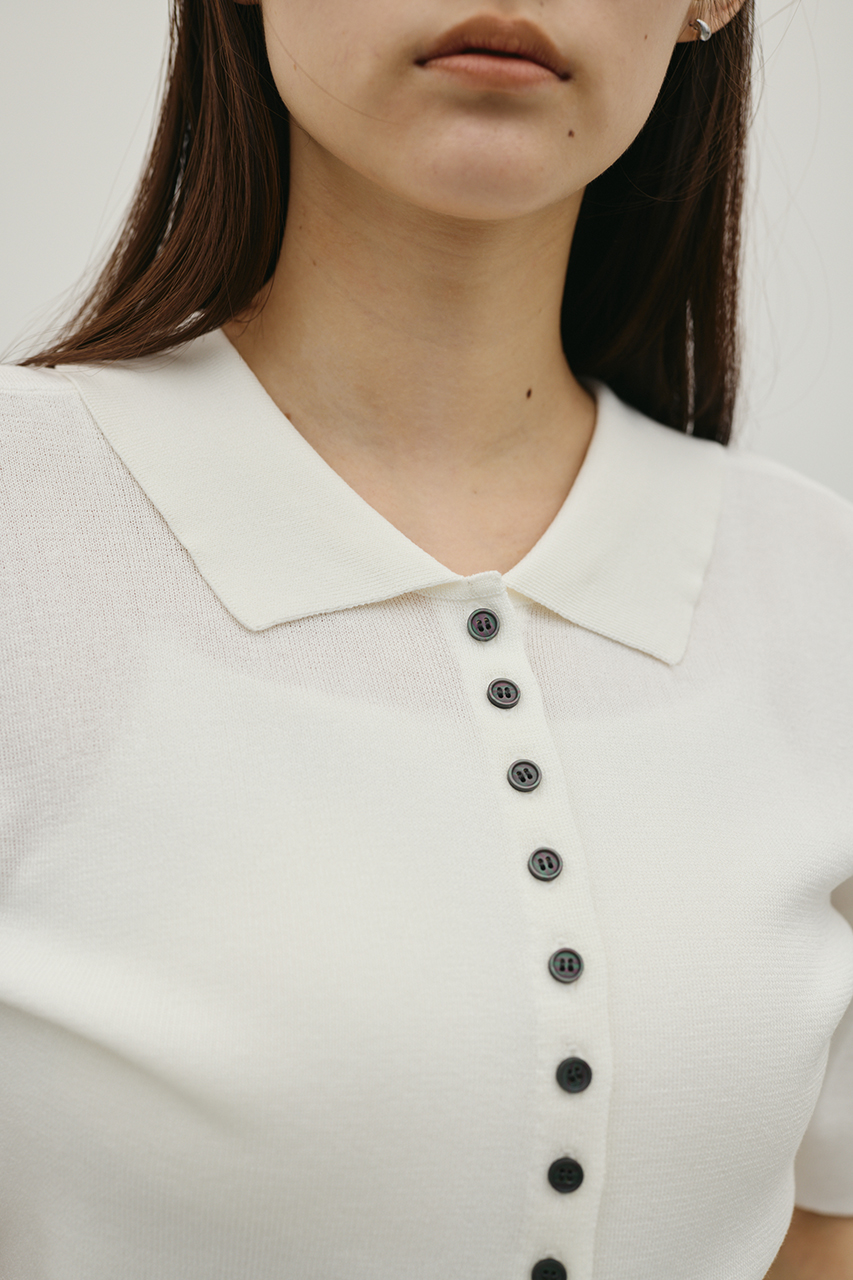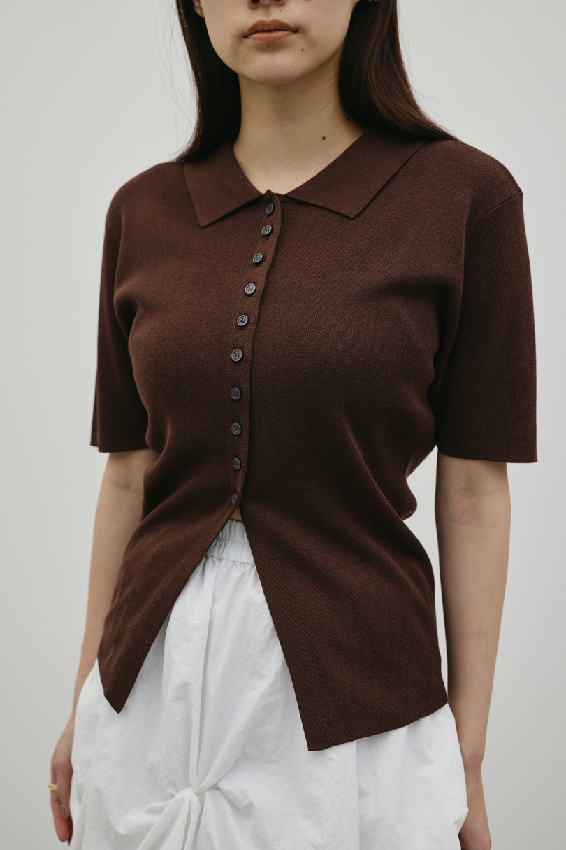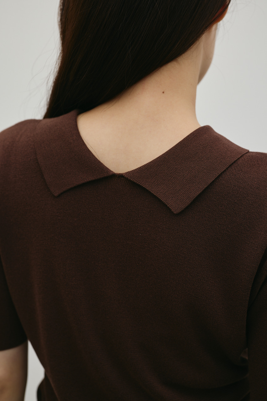 前後2WAYで着用可能なニットポロ。なめらかでさらりとした糸を使用。ビスコース混の微光沢が上品な印象に見せてくれます。総針に編み立てにしているのでボディーラインもひびきにくい一枚です。ストレッチあり、透け感なし。