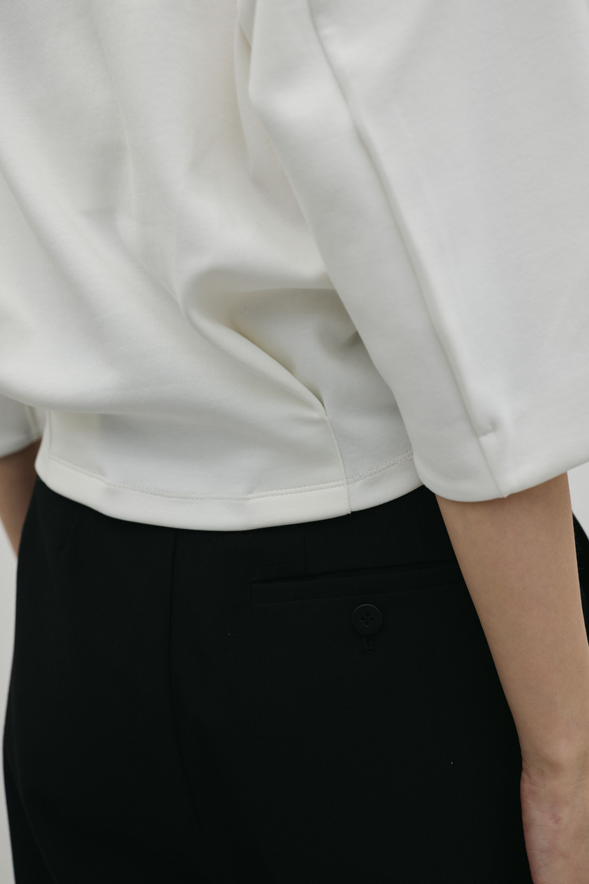 ハリ感のあるダンボールカット素材を使用したフォルムトップス。丸みをおびた立体感のある五分袖が、シンプルな中にモードさをプラスし、自然に二の腕もカバー。前はボックスシルエット、後ろはウエストにタックを施したフォルムと異なるシルエットで仕上げた一枚です。ストレッチあり、透け感なし。