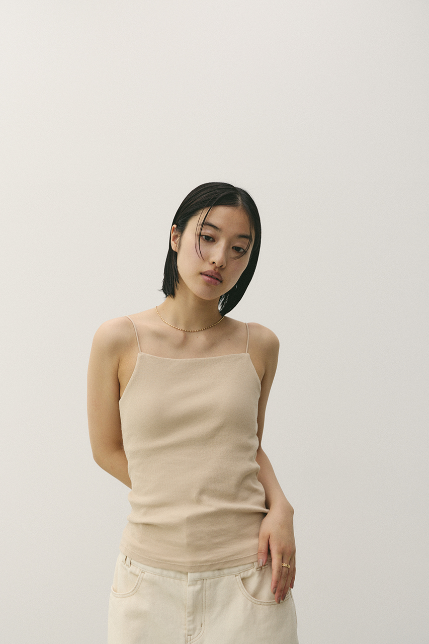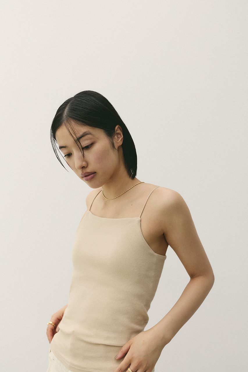 華奢なストリングとバックオープンカットが洗練された印象のミニマムカッティングな大人キャミソール。カップ付きなのでシアートップのインナー使いとしても活躍します。肌当たりの良い強撚スパンテレコを使用しているので着心地抜群。肩紐は華奢なストレッチコード仕様。取り外し可能パット入り。透け感なし、ストレッチあり。
