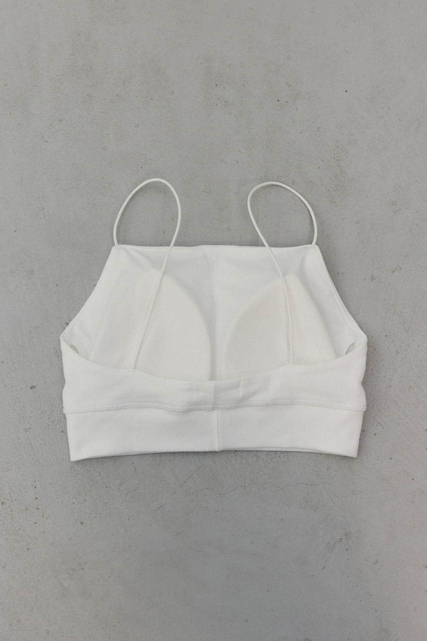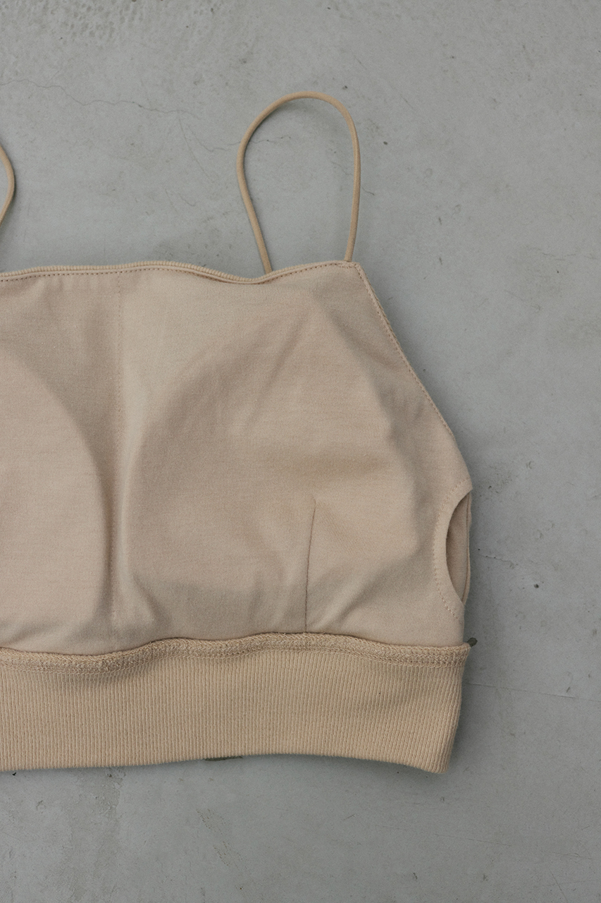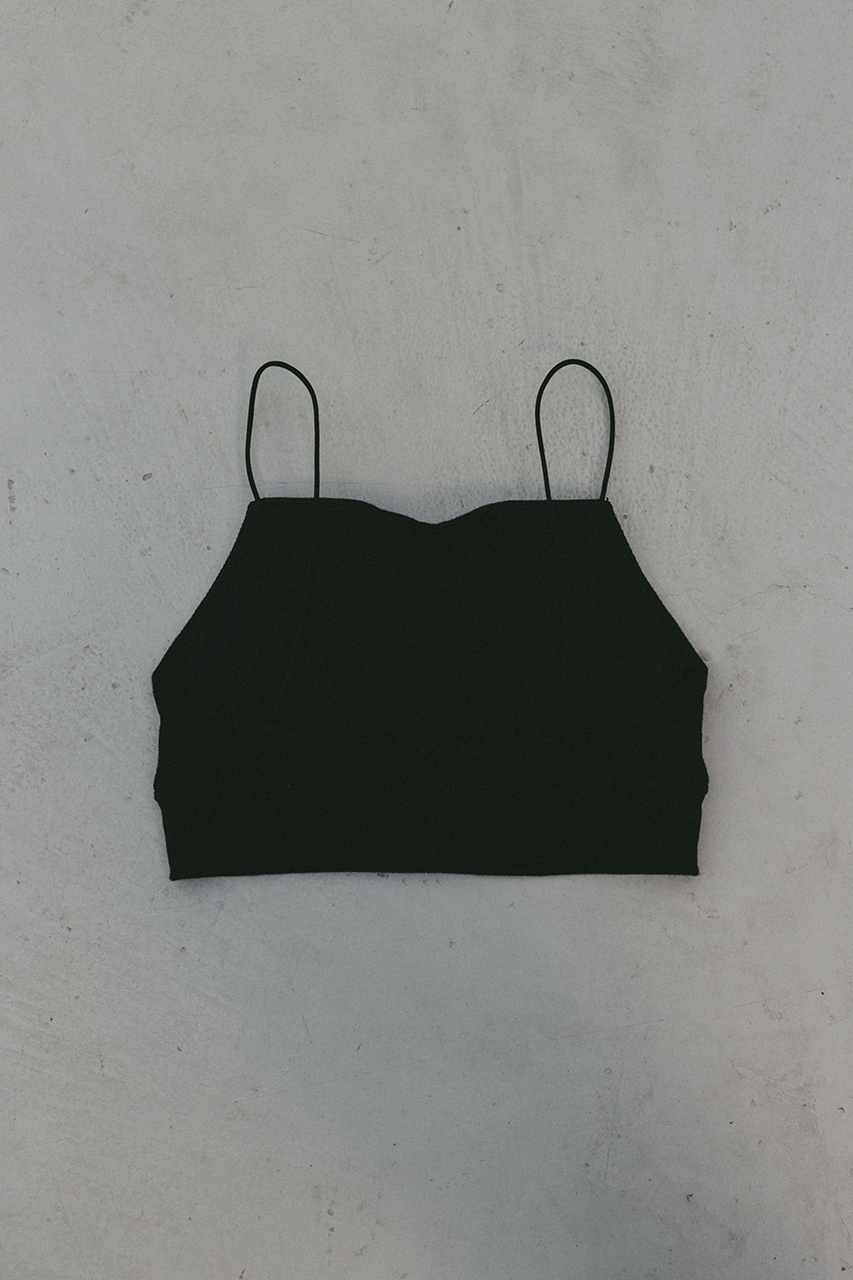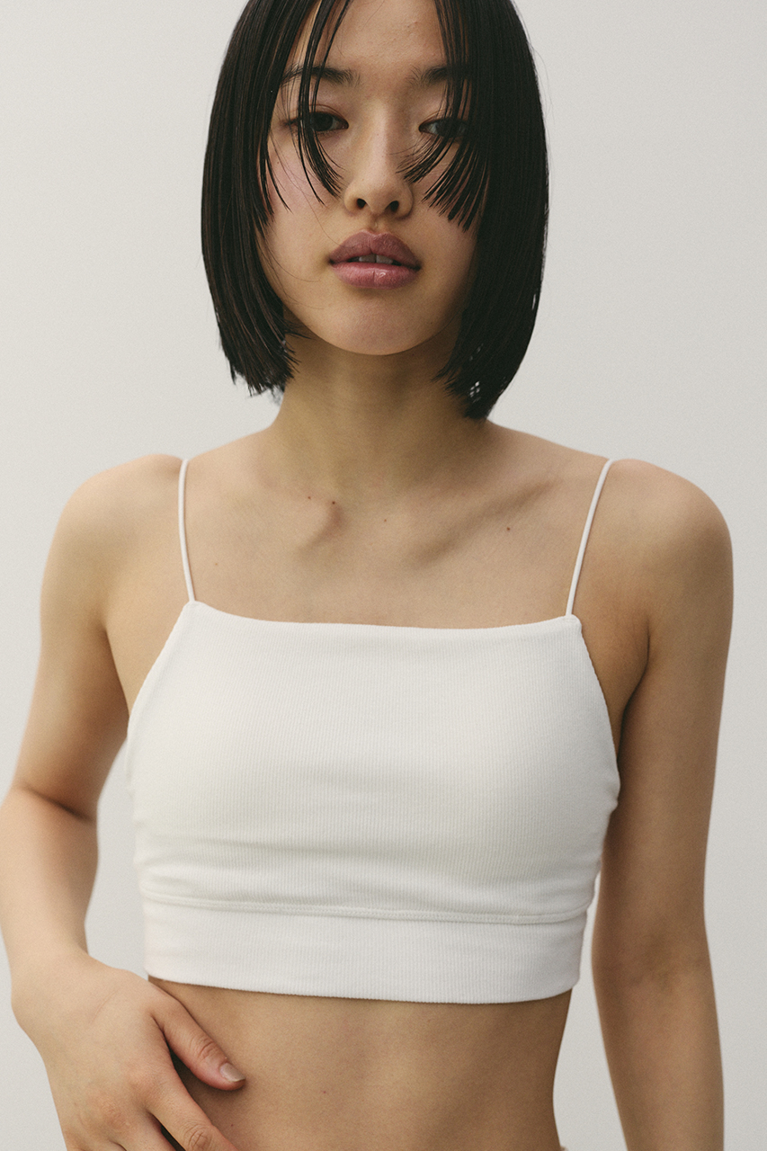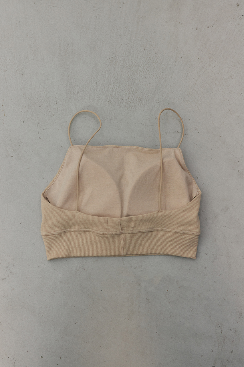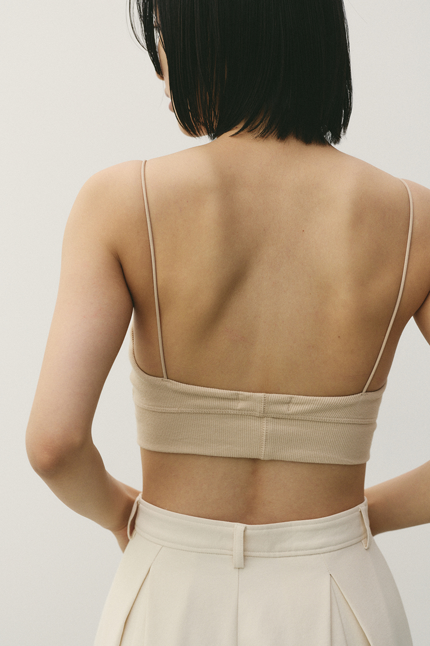 華奢なストリングとバックオープンカットが洗練された印象のミニマムカッティングな大人ブラトップ。カップ付きなのでシアートップのインナー使いとしても活躍します。肌当たりの良い強撚スパンテレコを使用しているので着心地抜群。肩紐は華奢なストレッチコード仕様。取り外し可能パット入り。透け感なし、ストレッチあり。