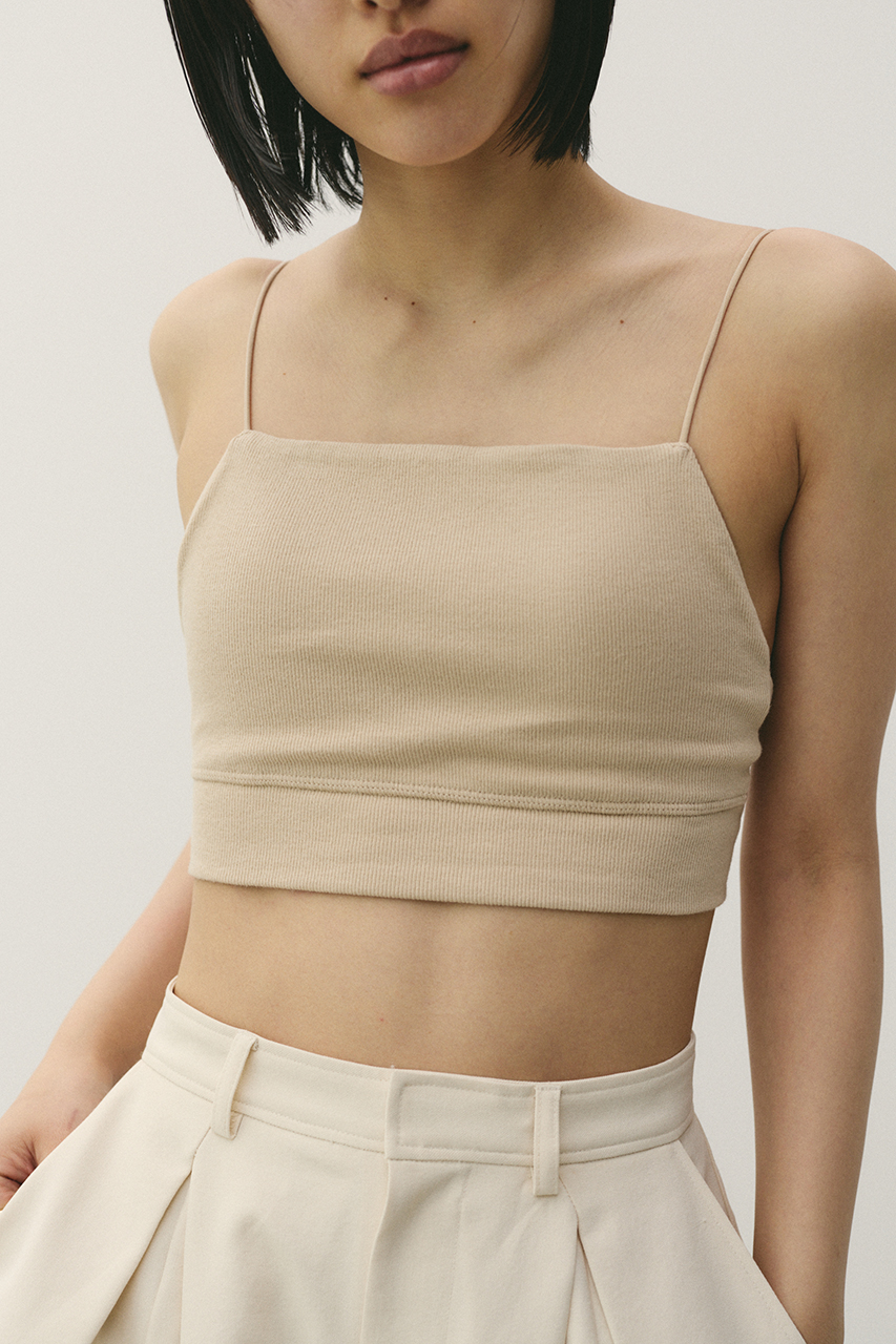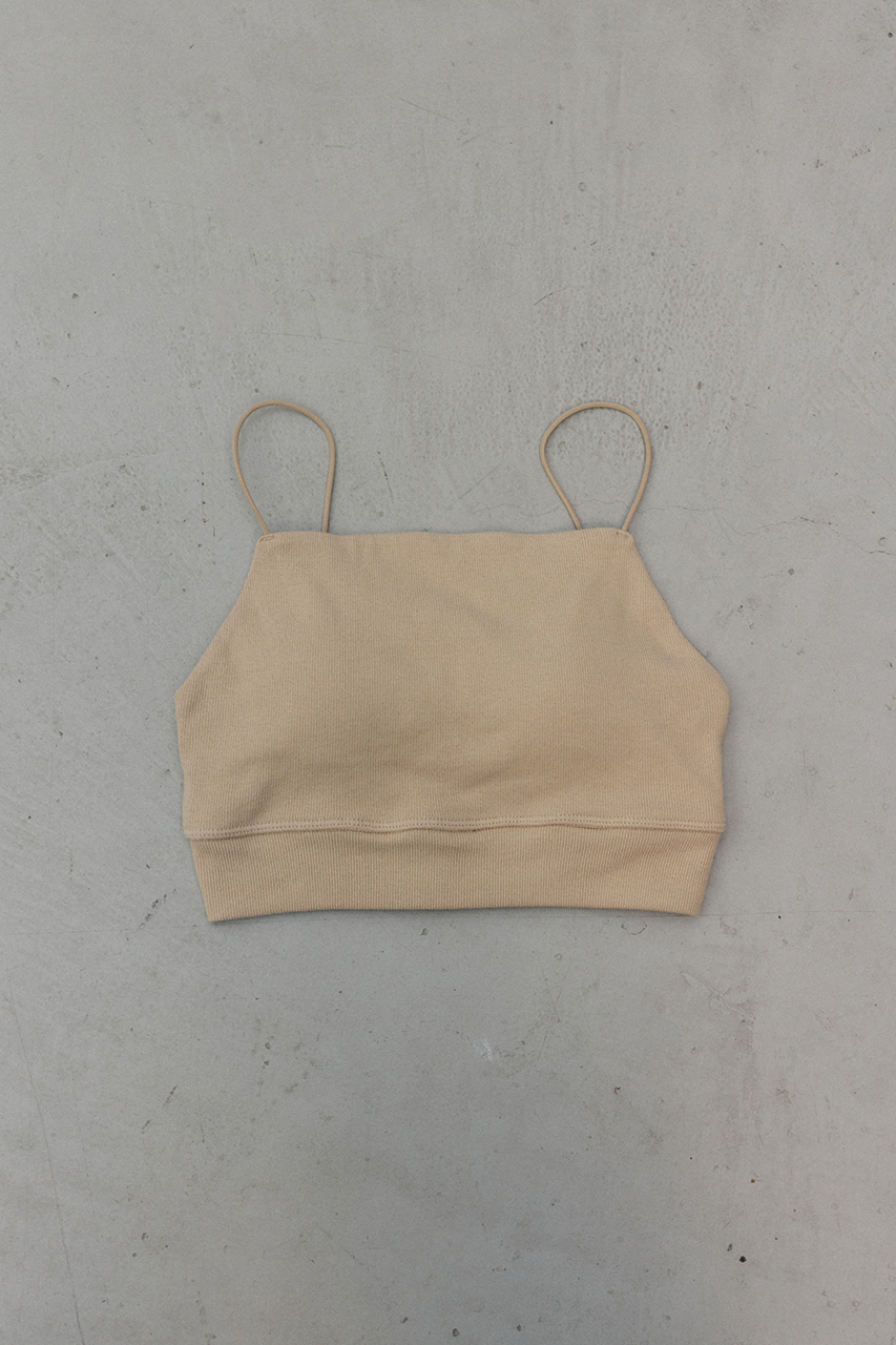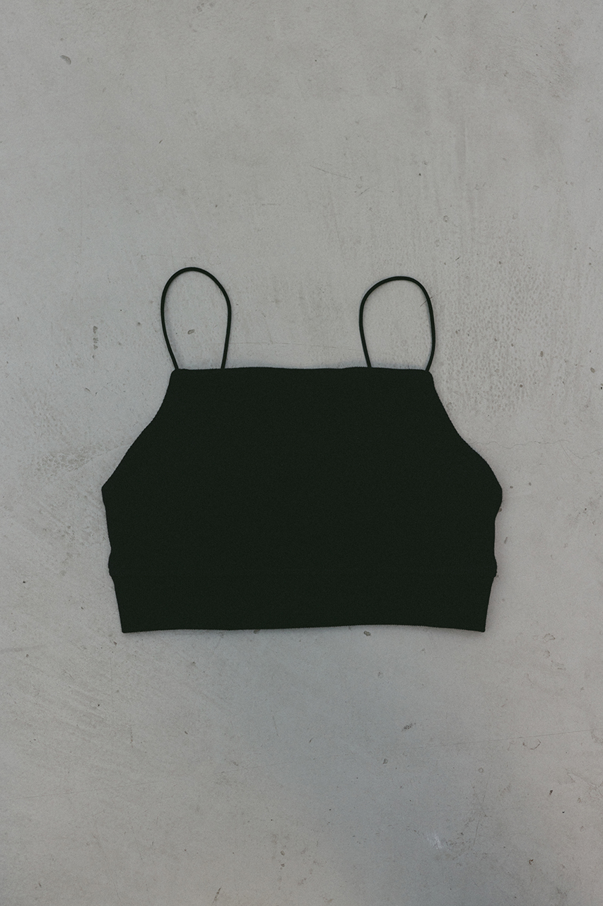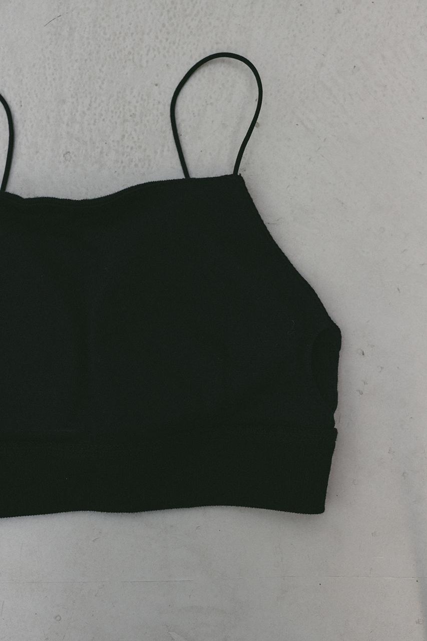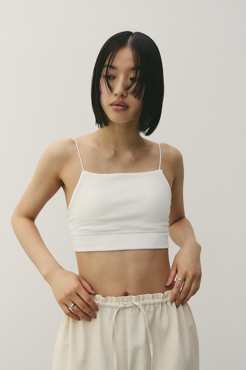 華奢なストリングとバックオープンカットが洗練された印象のミニマムカッティングな大人ブラトップ。カップ付きなのでシアートップのインナー使いとしても活躍します。肌当たりの良い強撚スパンテレコを使用しているので着心地抜群。肩紐は華奢なストレッチコード仕様。取り外し可能パット入り。透け感なし、ストレッチあり。