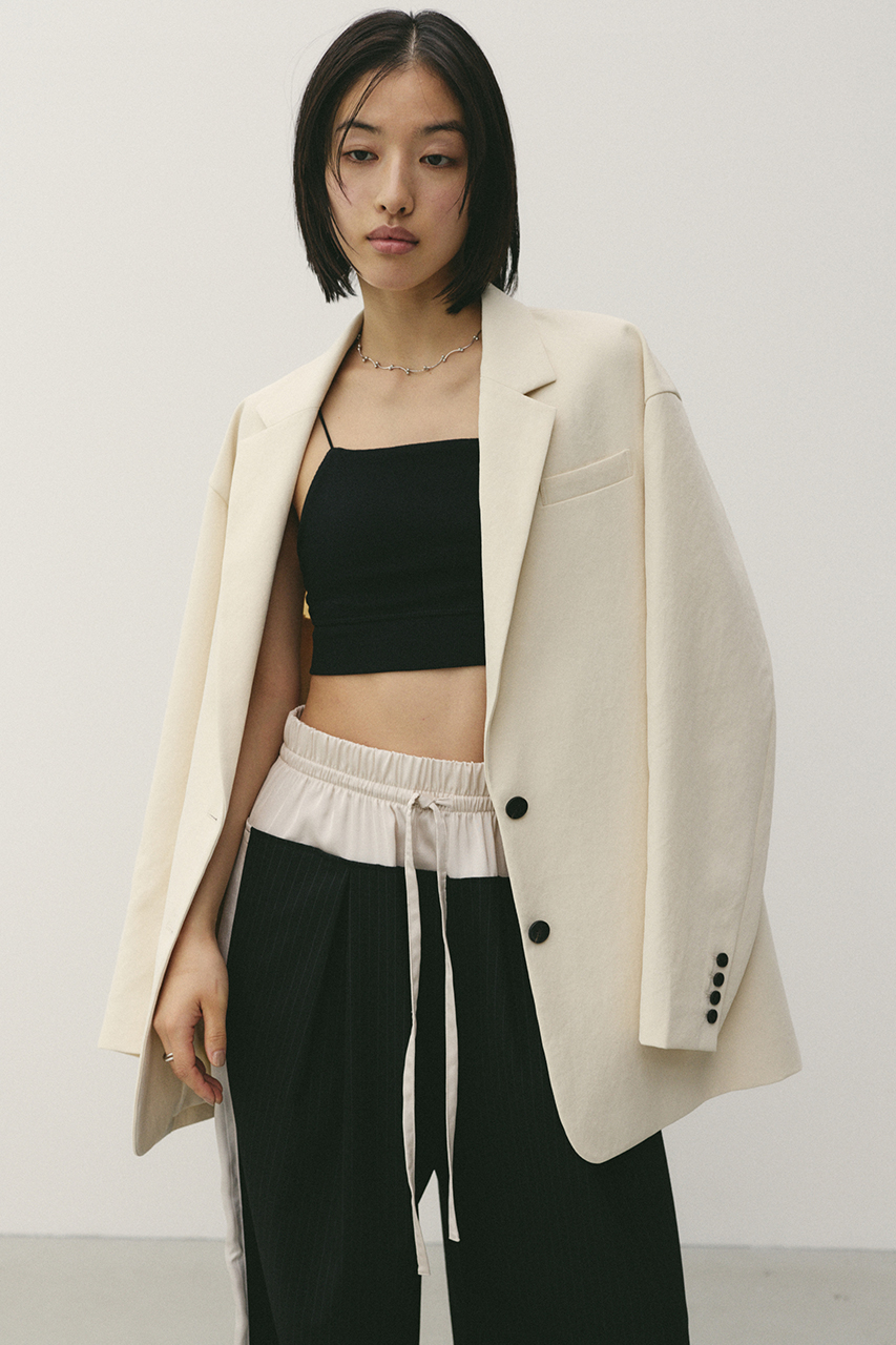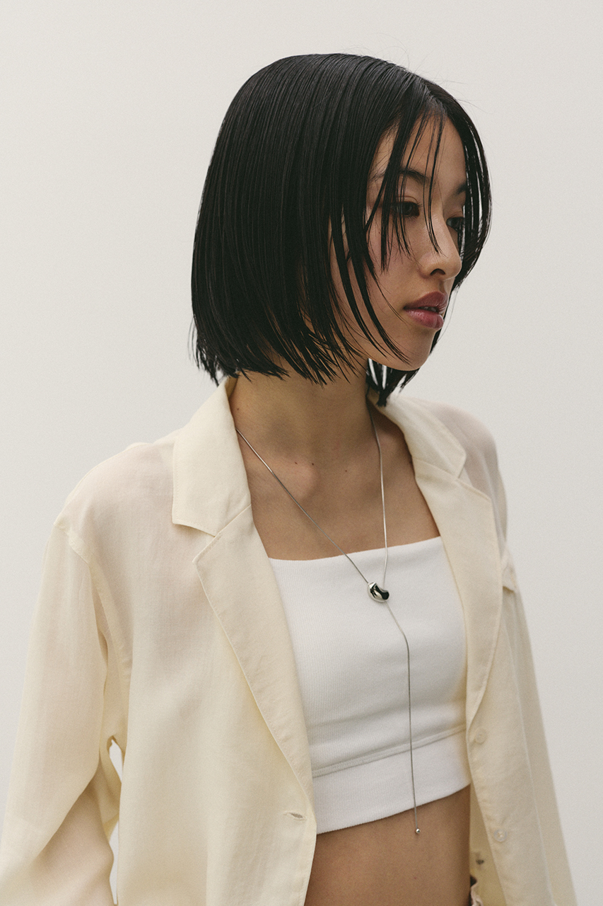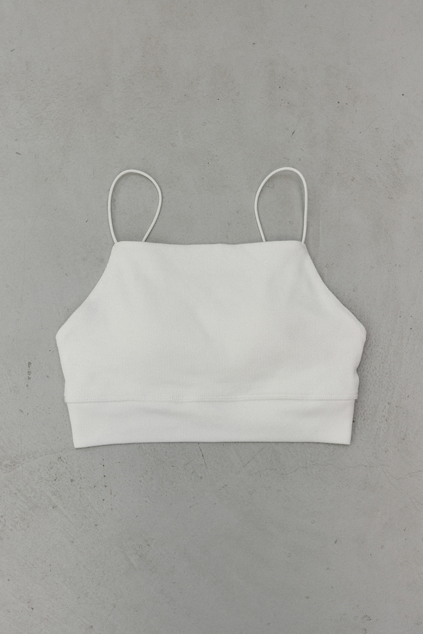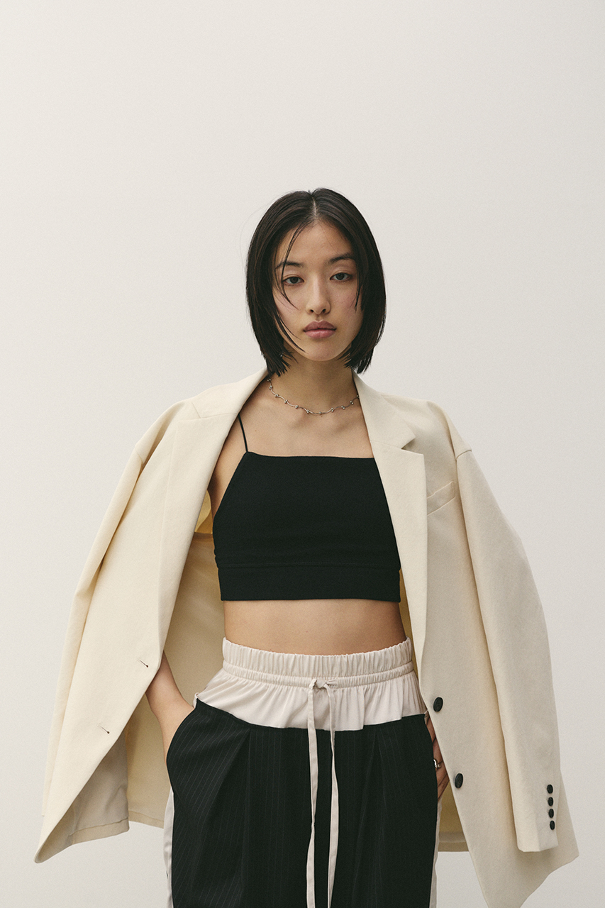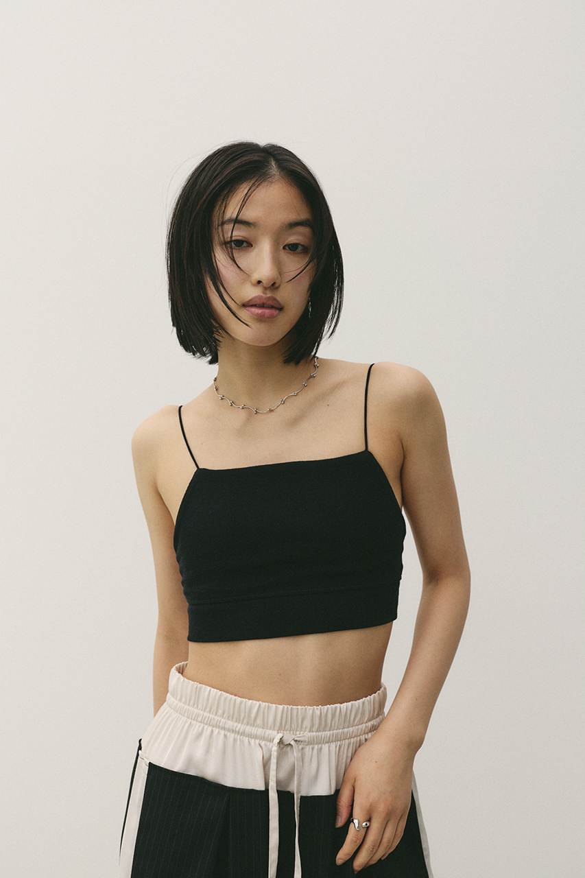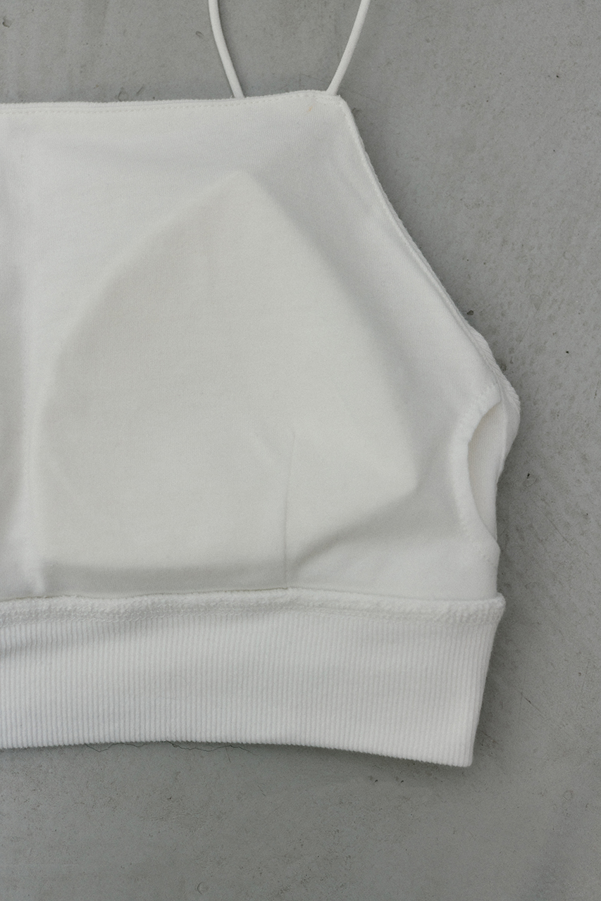 華奢なストリングとバックオープンカットが洗練された印象のミニマムカッティングな大人ブラトップ。カップ付きなのでシアートップのインナー使いとしても活躍します。肌当たりの良い強撚スパンテレコを使用しているので着心地抜群。肩紐は華奢なストレッチコード仕様。取り外し可能パット入り。透け感なし、ストレッチあり。
