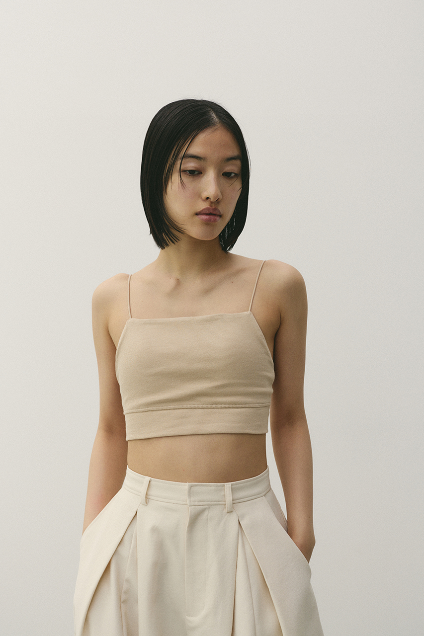 華奢なストリングとバックオープンカットが洗練された印象のミニマムカッティングな大人ブラトップ。カップ付きなのでシアートップのインナー使いとしても活躍します。肌当たりの良い強撚スパンテレコを使用しているので着心地抜群。肩紐は華奢なストレッチコード仕様。取り外し可能パット入り。透け感なし、ストレッチあり。