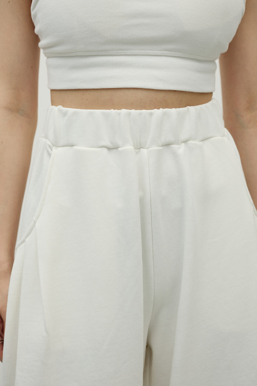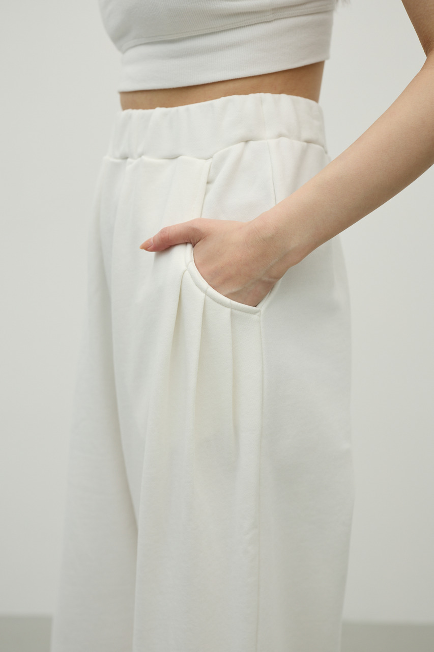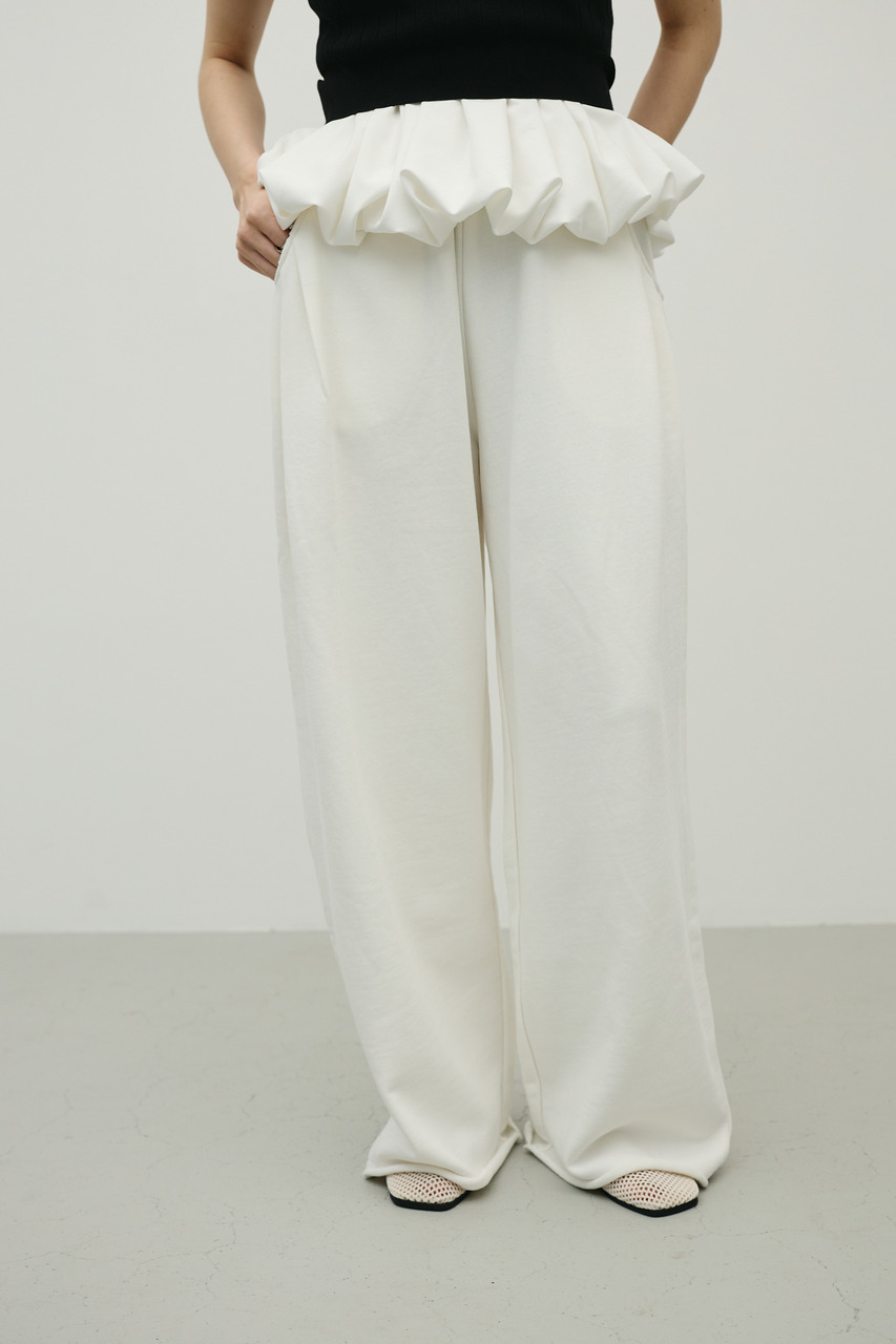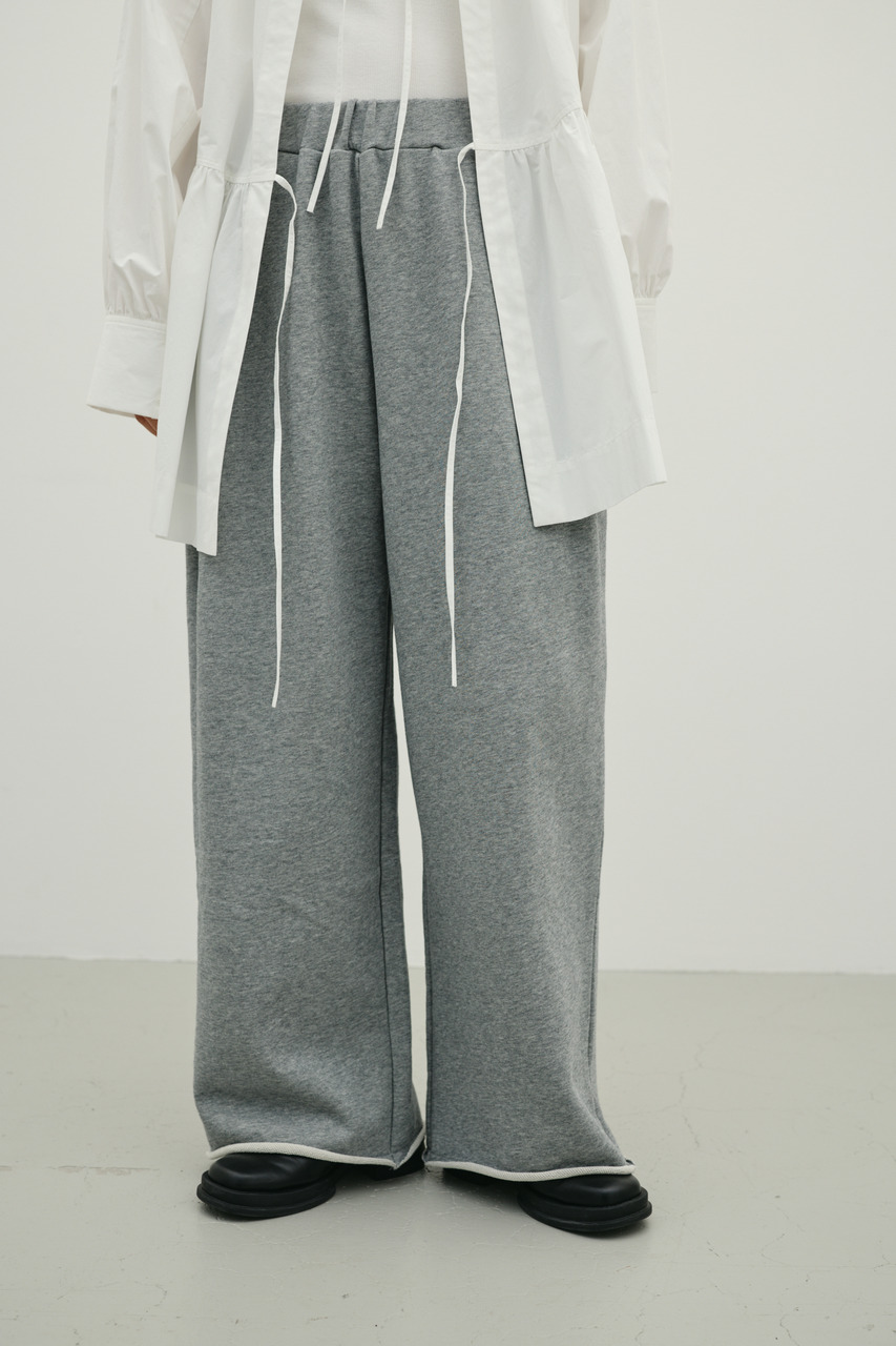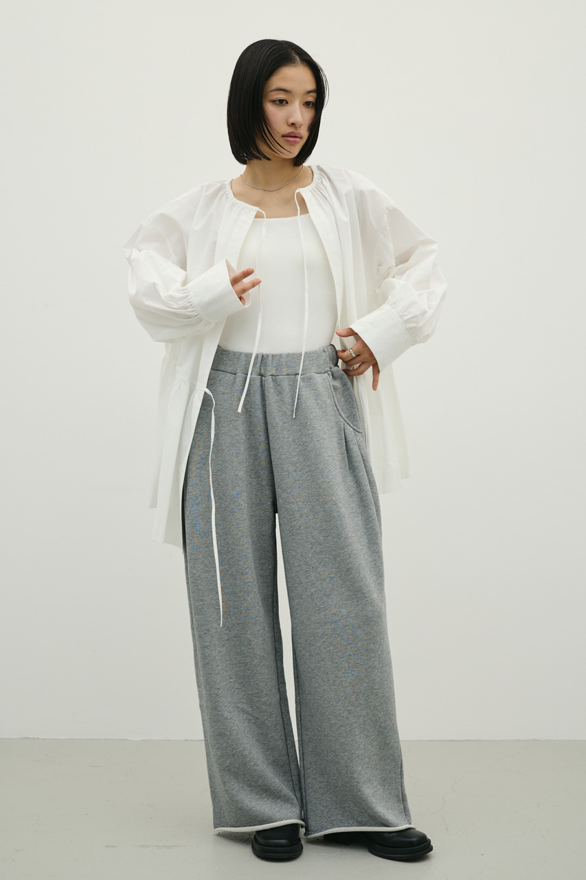 裏毛素材を使用したリラックス感のあるワイドシルエットのスウェットパンツ。カーブポケットにタックを施した、他にはないデザインがポイント。裾は裁ち切り仕様でカジュアルな抜け感をプラスしました。ウエストはゴム仕様に加え、内側紐付きでフィット感の調整が可能です。透け感WHTややあり、ストレッチあり。