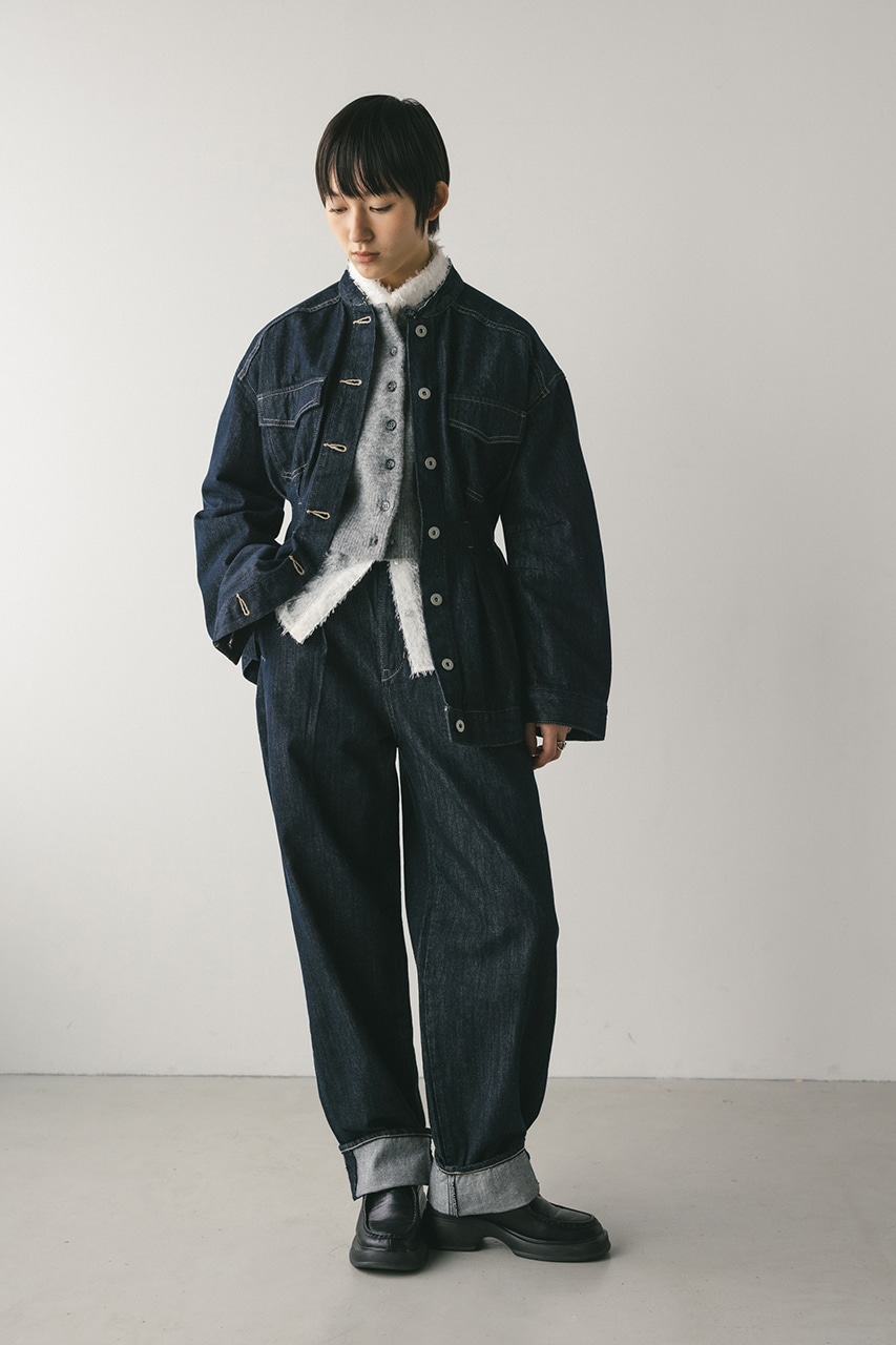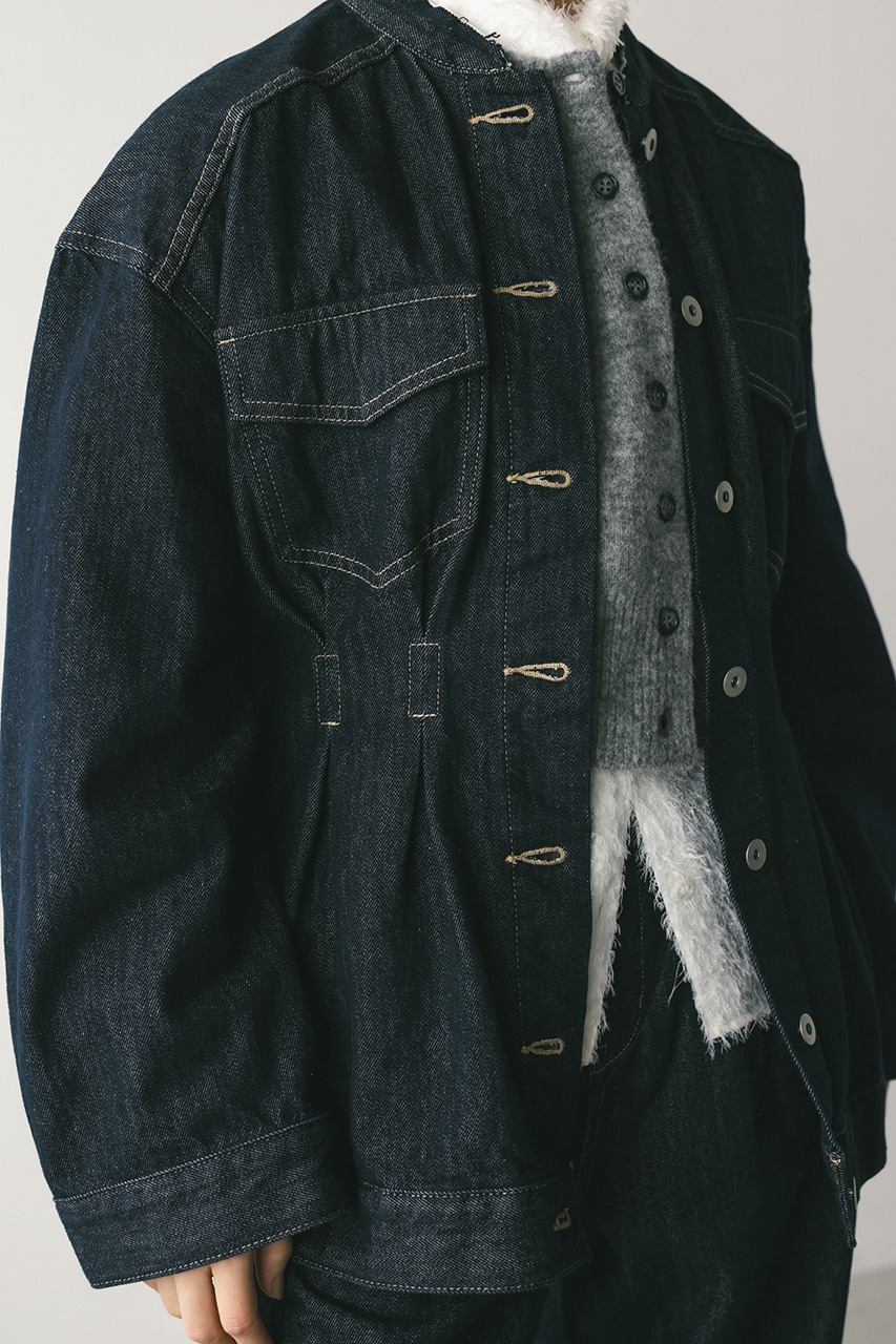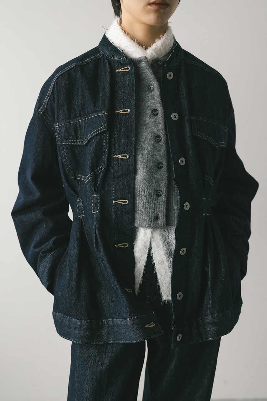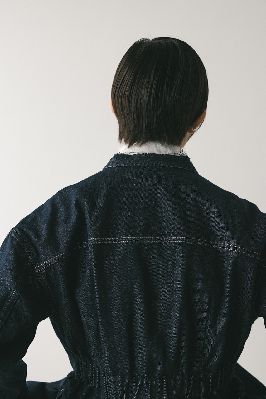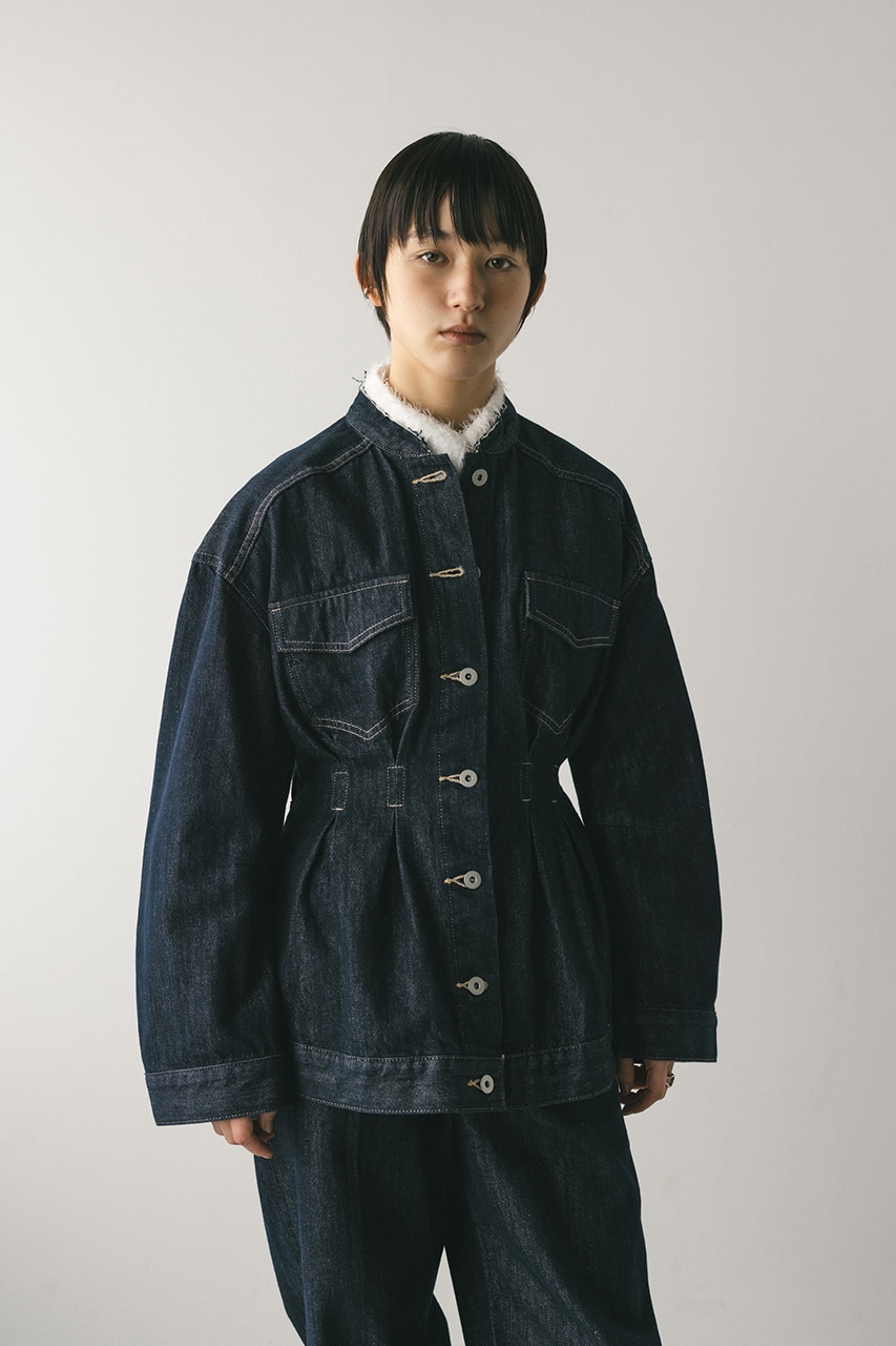 ウエストでタックをとり、女性らしいペプラムシルエットに仕上げたデニムジャケット。首元がすっきり見えるノーカラーデザインと丸みのある袖のデザインにこだわった一枚。リメイク風なカットオフのフリンジ加工が甘くなりすぎないアクセントになります。ストレッチなし、透け感なし。