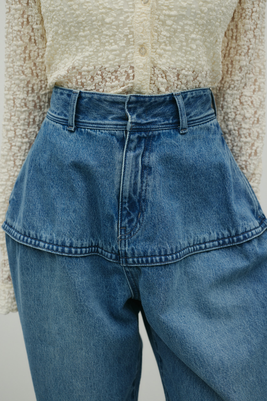 独特のランタンシルエットが特徴のデニムパンツ。加工感のある素材で、こなれた表情を演出しつつカジュアルスタイルにアクセントをプラス。ゆったりとした腰まわりから裾に向かって細くなるランタン型で、動きのあるシルエットが楽しめます。シンプルなトップスと合わせるだけで、トレンド感のあるデイリースタイルが完成する一枚です。透け感なし、ストレッチなし。