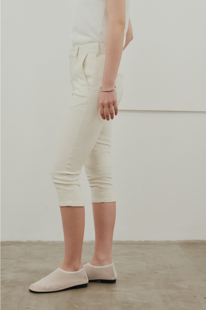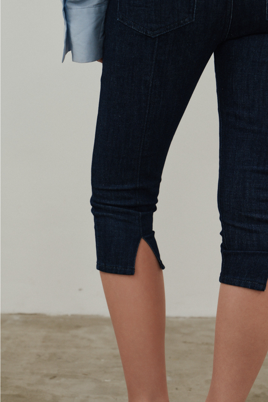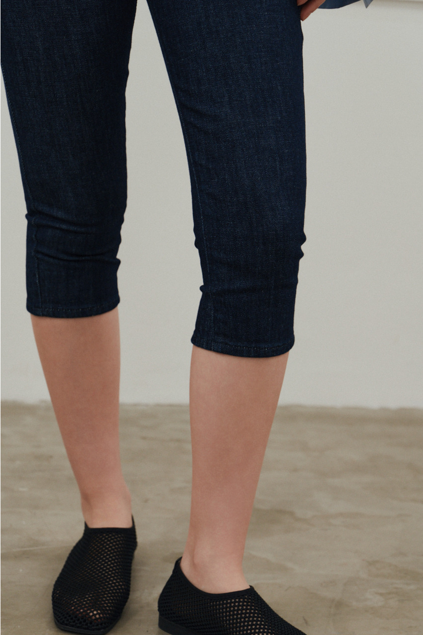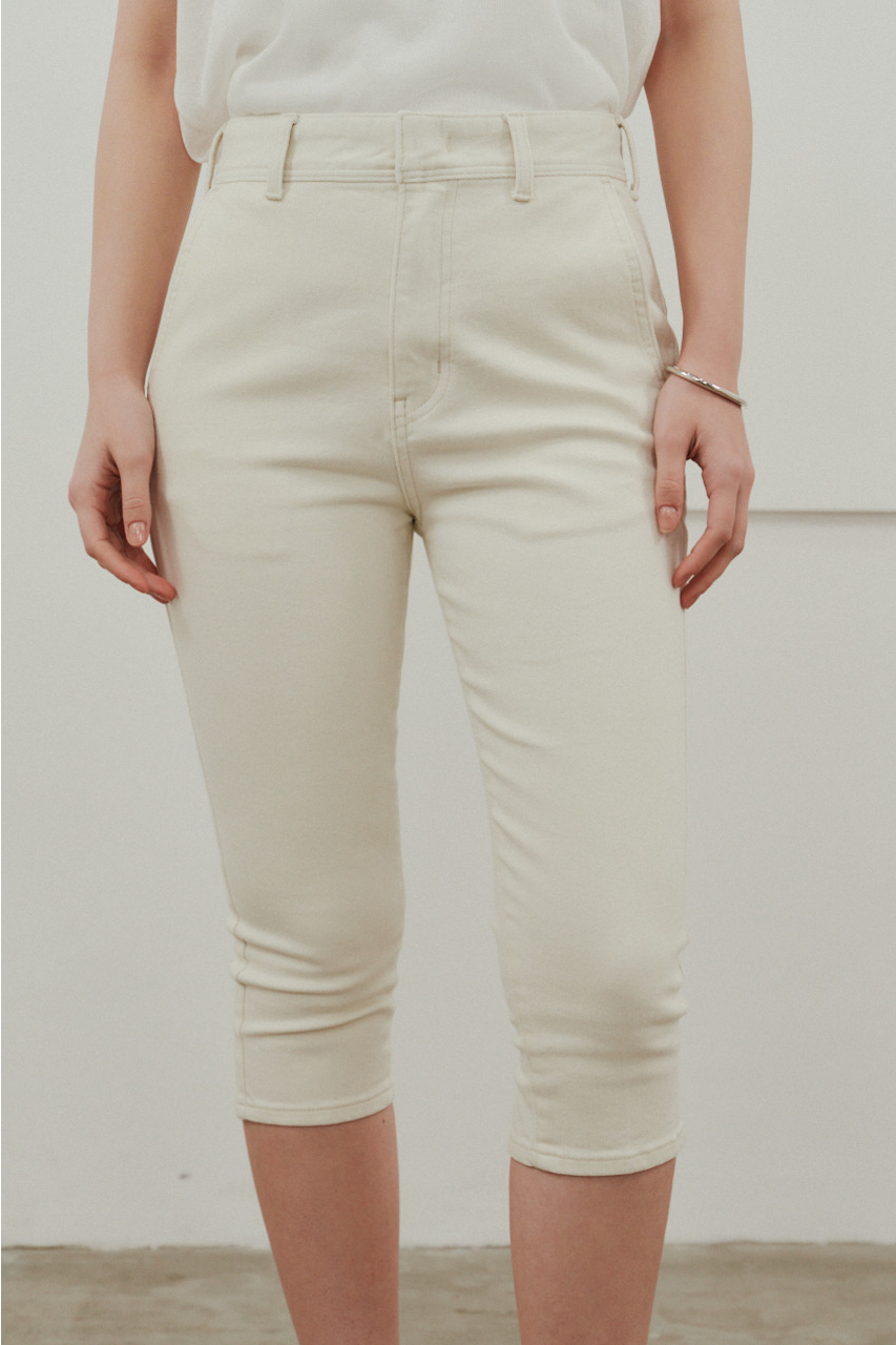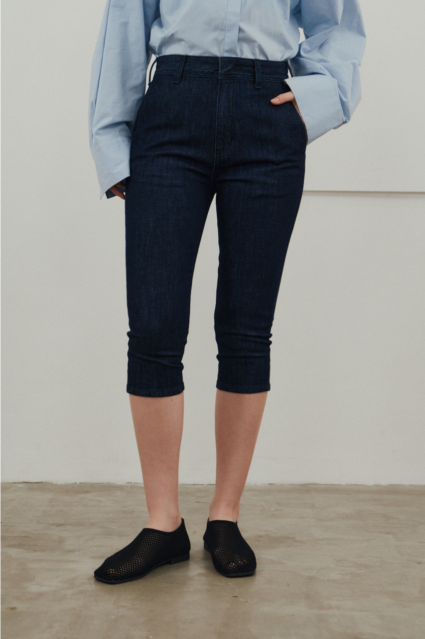 ストレッチデニム素材を使用したカプリパンツ。センタープレス入りのすっきりとしたデザインがポイント。程よいフィット感で動きやすく、カジュアルからきれいめまで幅広いコーディネートに対応できる一着です。ストレッチあり、透け感なし。