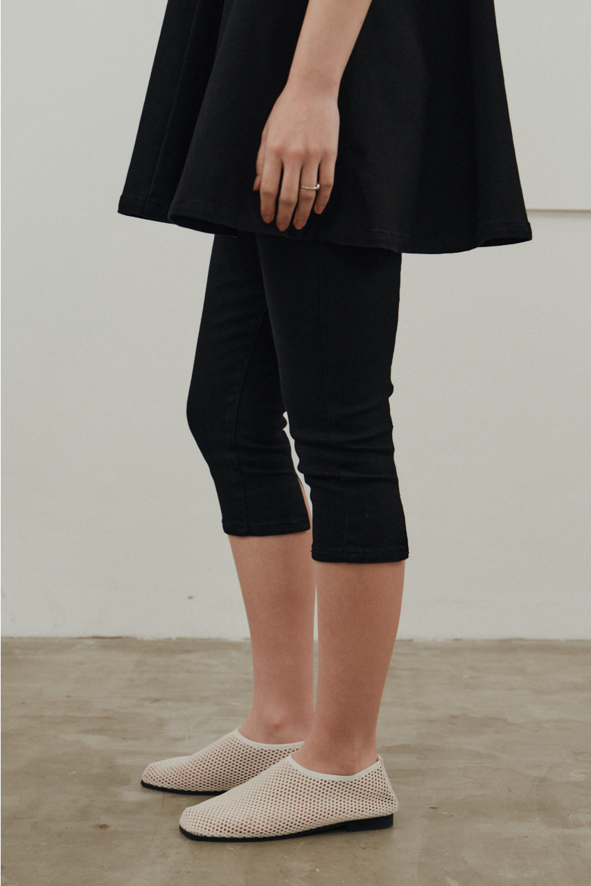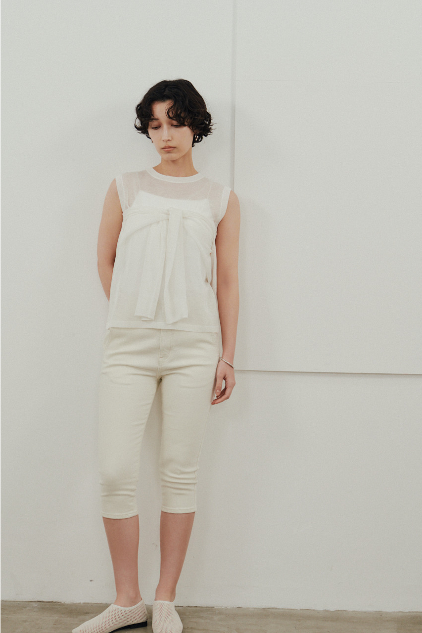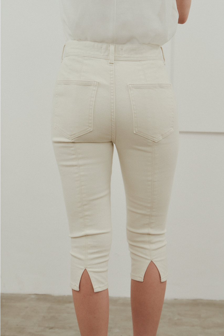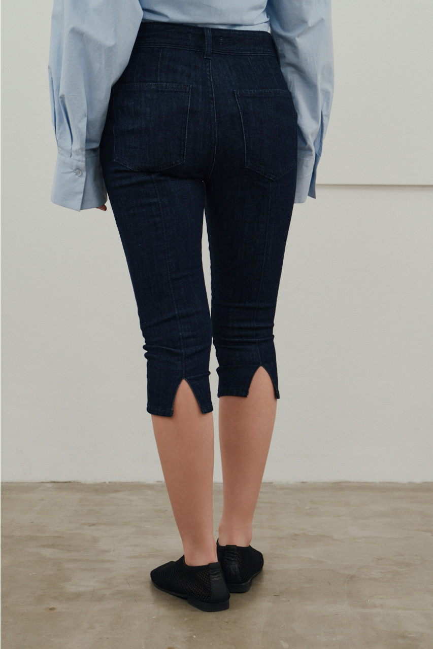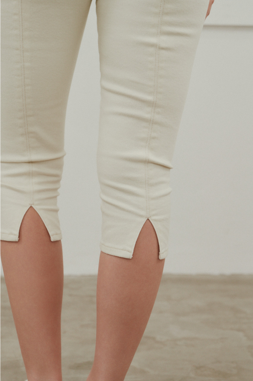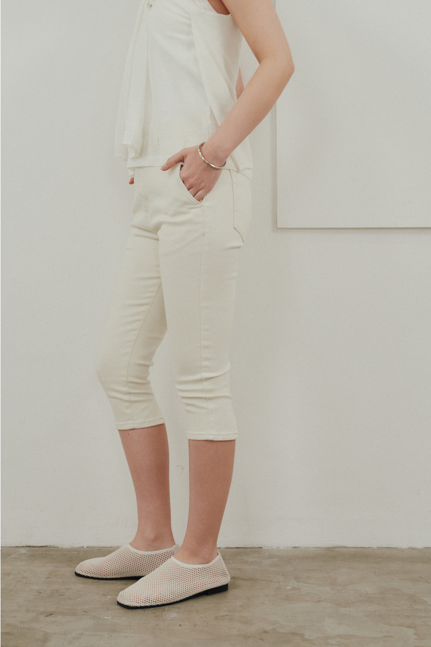 ストレッチデニム素材を使用したカプリパンツ。センタープレス入りのすっきりとしたデザインがポイント。程よいフィット感で動きやすく、カジュアルからきれいめまで幅広いコーディネートに対応できる一着です。ストレッチあり、透け感なし。