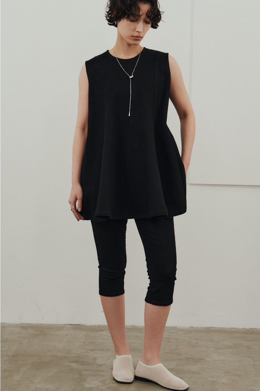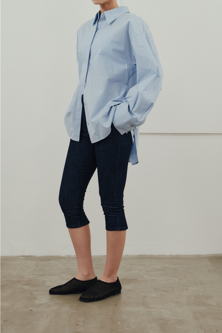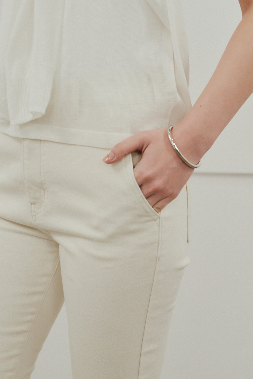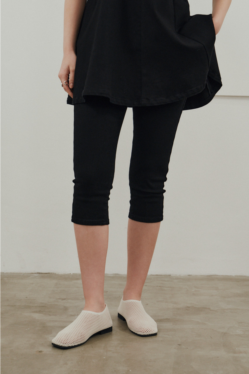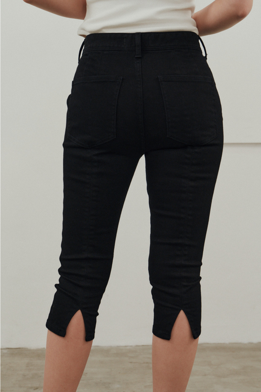 ストレッチデニム素材を使用したカプリパンツ。センタープレス入りのすっきりとしたデザインがポイント。程よいフィット感で動きやすく、カジュアルからきれいめまで幅広いコーディネートに対応できる一着です。ストレッチあり、透け感なし。