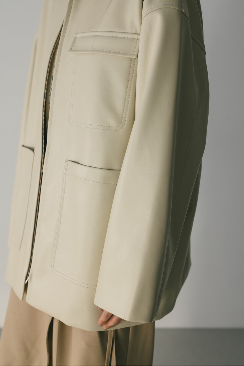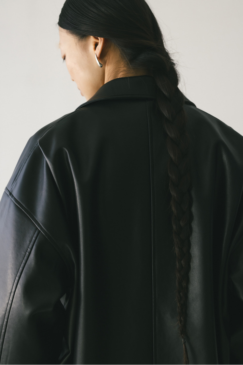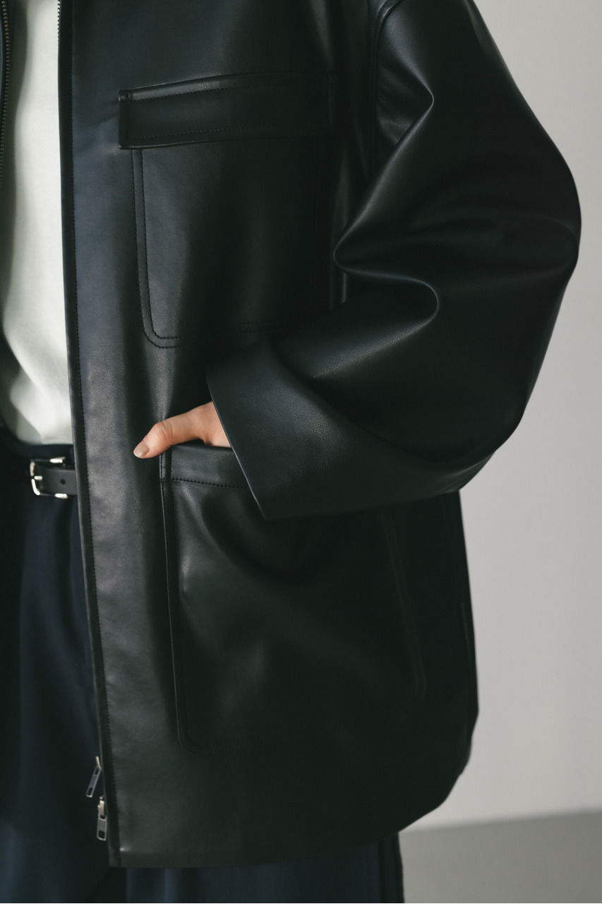 すっきりとした襟とオーバーなサイズ感がポイントのレザージャケット。タックを施した丸みのある背中のシルエットとボリューム感のある袖が可愛いアウター。ビッグポケットがデザインポイント。シンプルながらも存在感のあるシルエットが、洗練された印象を与えます。柔らかなフェイクレザー素材は馴染みやすく、重ねても羽織りやすい一枚。ヒップラインが隠れる長め丈で、気になる腰回りもカバーしてくれます。ストレッチ無し、透け感なし。
