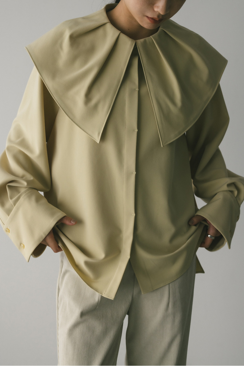タックをあしらったビッグカラーが特徴的なブラウス。大きめな衿は可愛らしさがありつつもタックデザインとケープのようなデザインが落ち着き感とモードな印象の大人なデザインに仕上げました。ゆったりとしたサイズ間で、1枚でもインナータートルなどとレイヤードしても使えるアイテムです。ストレッチなし、透け感なし。