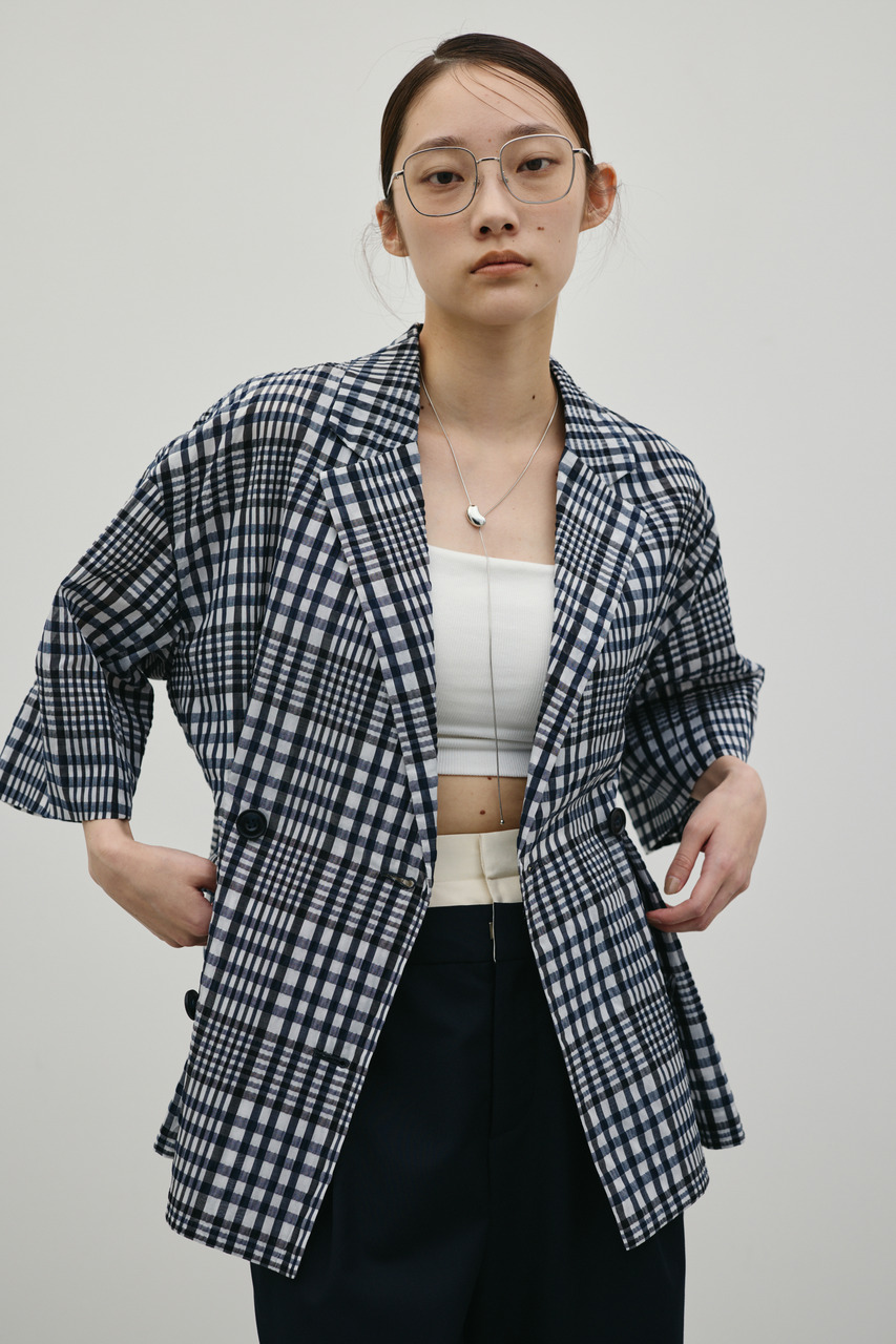 オリジナル柄のシアーチェック素材を使用した半袖ジャケット。透け感のある軽やかな素材に加え、ウエストタックを施すことで構築的なシルエットを実現。シンプルなコーディネートにプラスするだけで、さりげない個性と上品さを演出できる一着です。500JSB31-1671(シアーチェックスカート)とセットアップ着用可能。ストレッチなし、透け感あり。