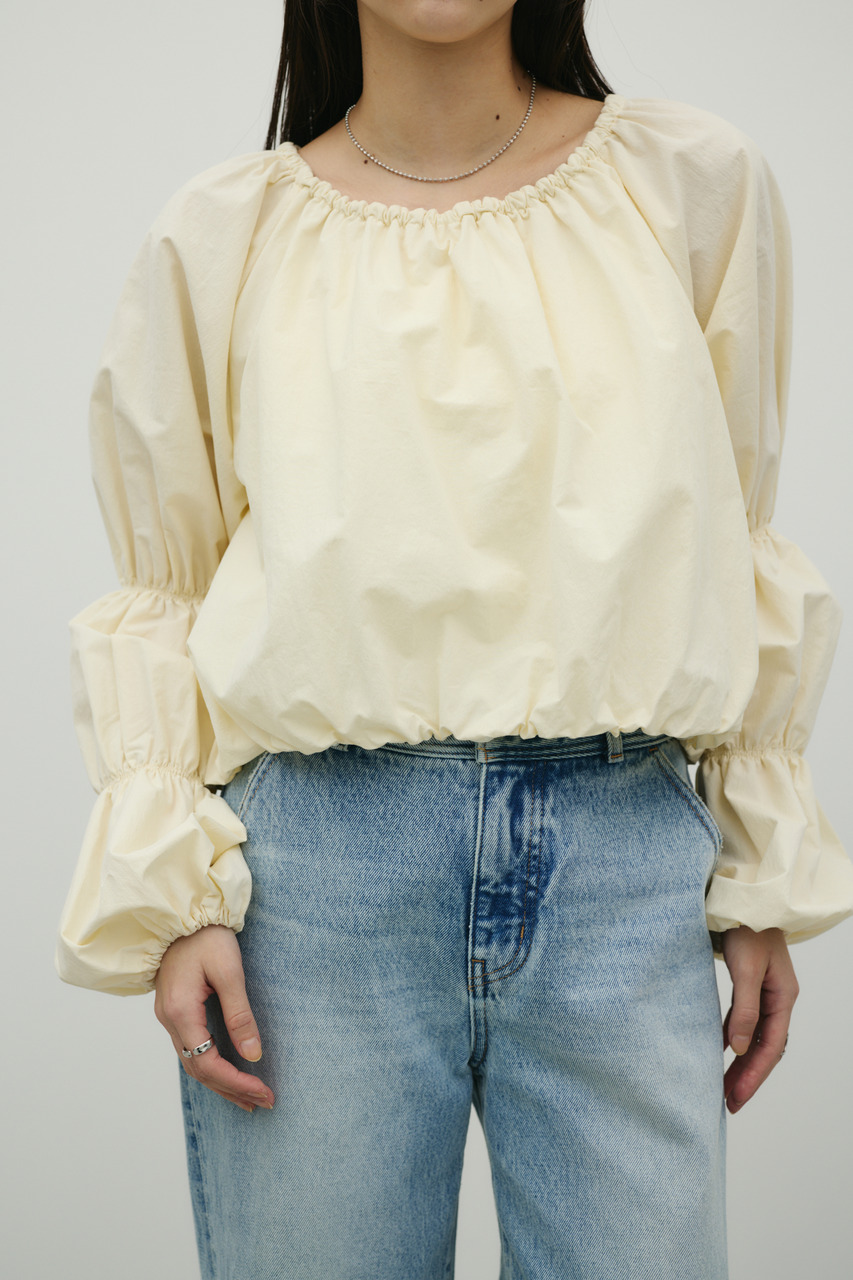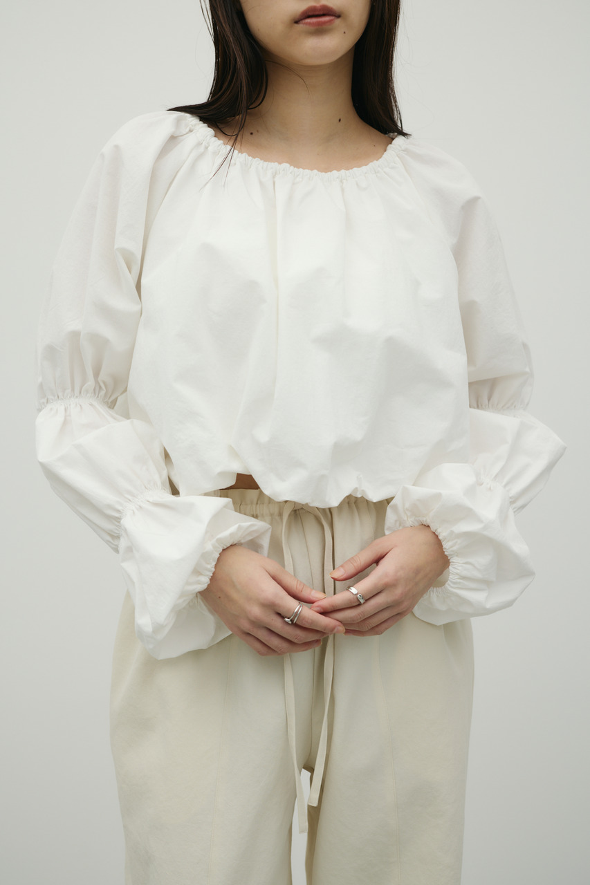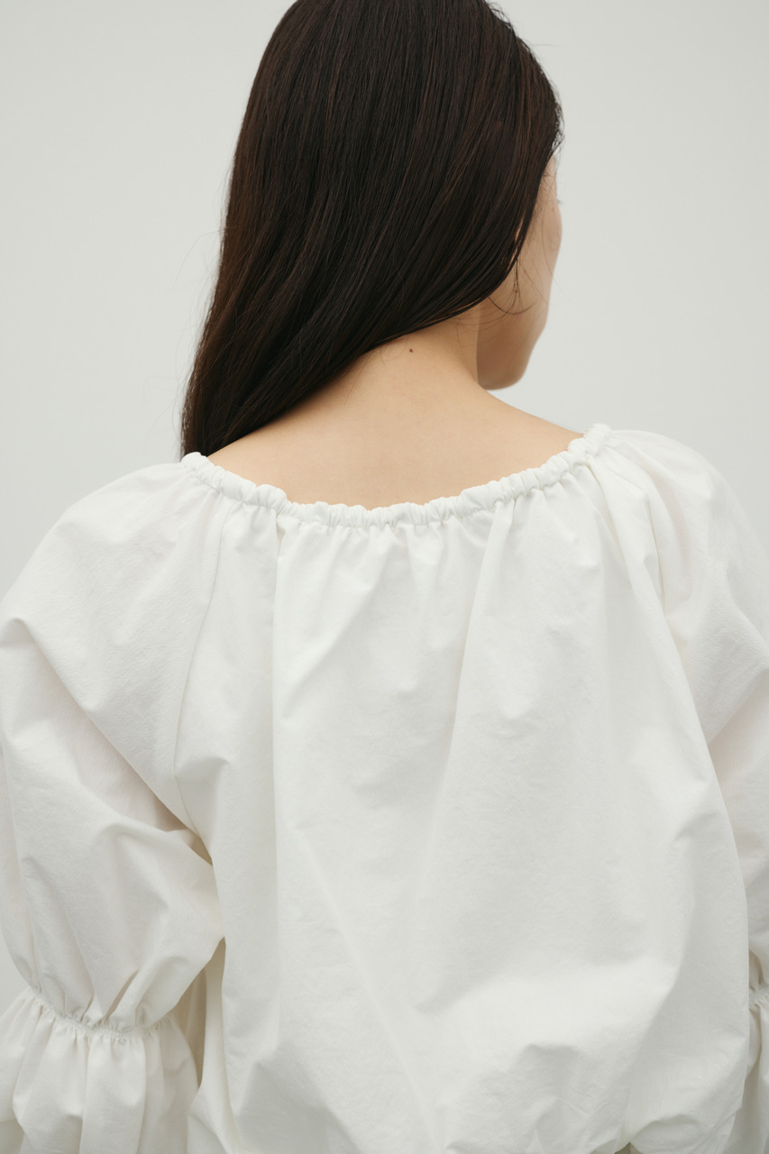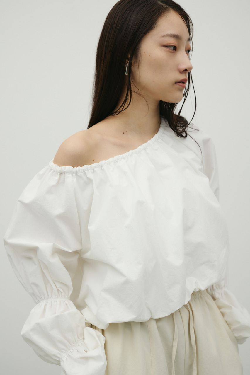 ハリ感のある素材で立体的なシルエットを楽しめるランタンスリーブオフショルトップ。裾はバルーンシルエットになっており、華やかさと可愛らしさをプラス。袖は捲ることができるデザインで、こなれた印象のアレンジも可能です。動きのあるデザインで、デイリーからお出かけまで幅広く活躍する一枚です。透け感なし、ストレッチなし。