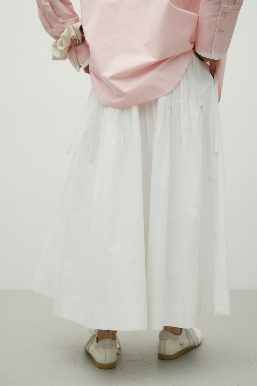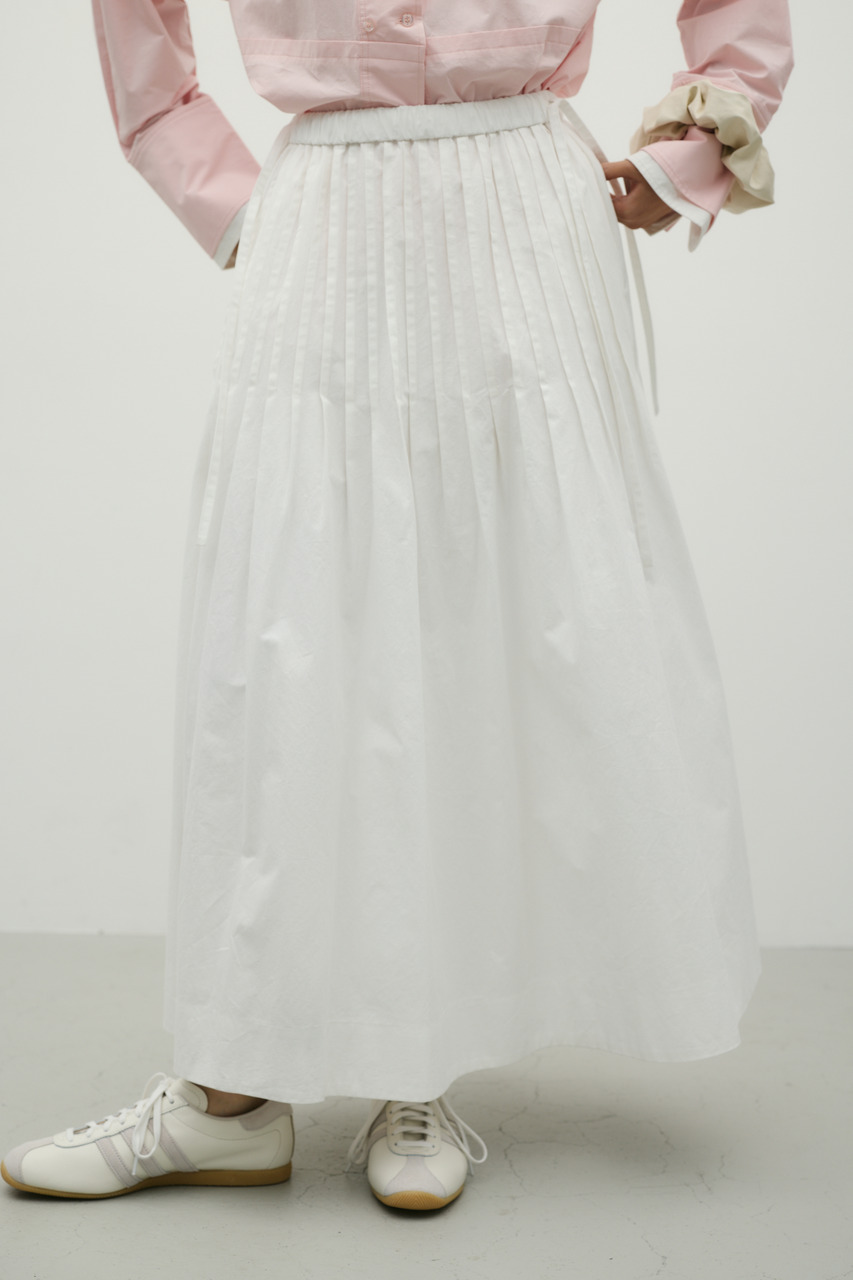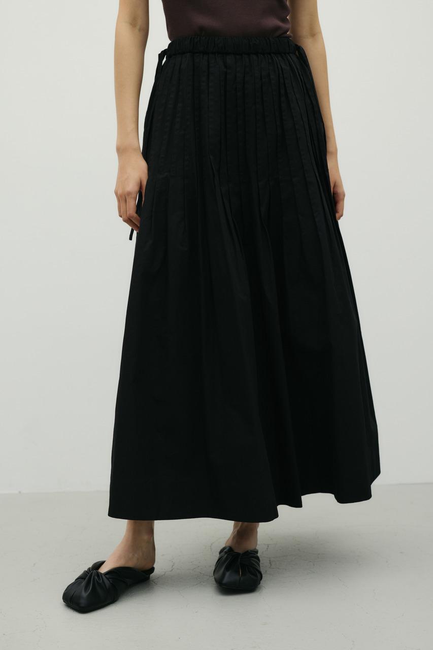 ボリューム感とハリのある素材でふんわり広がるフレアシルエットが魅力のタックプリーツスカート。程よくカジュアルな着こなしが楽しめる素材感でデイリーコーデにこなれ感をプラス。シンプルなトップスと合わせるだけで、ボリューム感を活かしたおしゃれなスタイルが完成します。ウエストは調節可能。透け感なし、ストレッチなし。