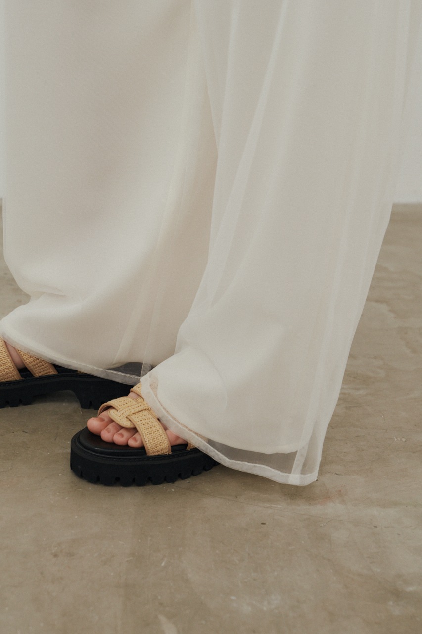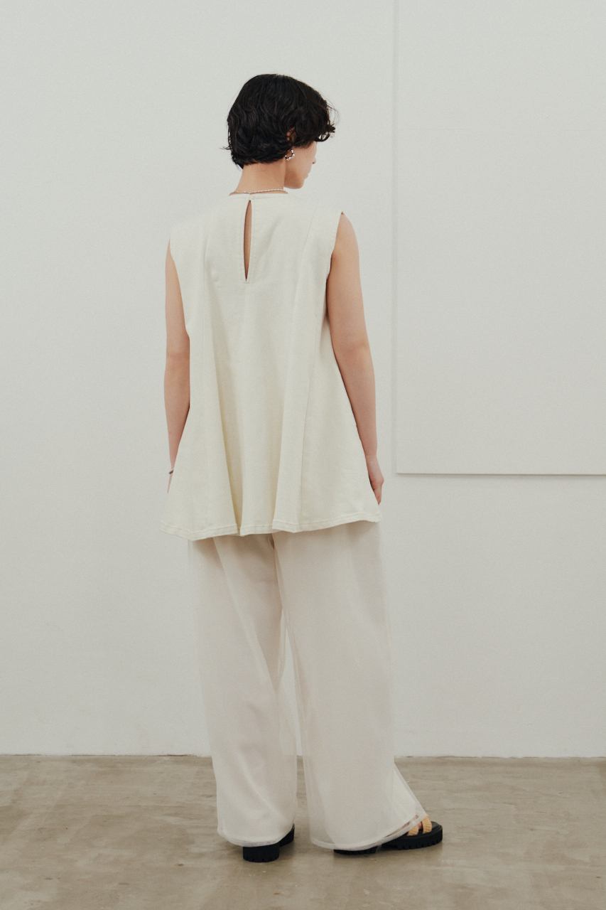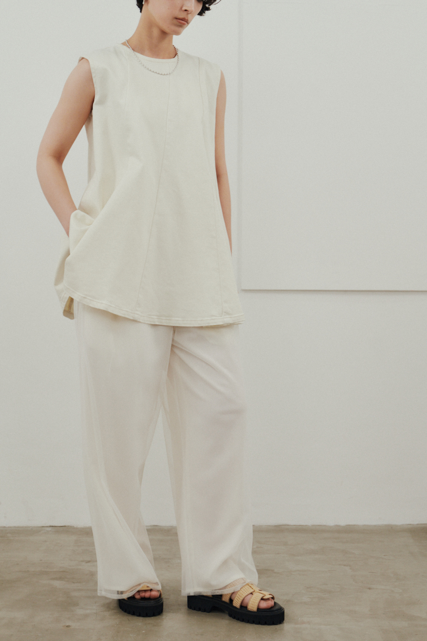 透けのない軽やかな素材に軽い細かいメッシュ素材を重ねた、透け感と立体感が楽しめるシアーパンツ。軽やかな素材感とウエストゴム仕様で、リラックスムードたっぷりの着心地を叶えます。レイヤードデザインによる、程よい奥行きと動きのあるシルエットが魅力。シンプルなトップスやコンパクトなブラウスと合わせるだけで、トレンド感のあるスタイルが完成。夏のデイリーコーデやリゾートスタイルにもぴったりな軽やかパンツです。ストレッチなし、透け感なし。