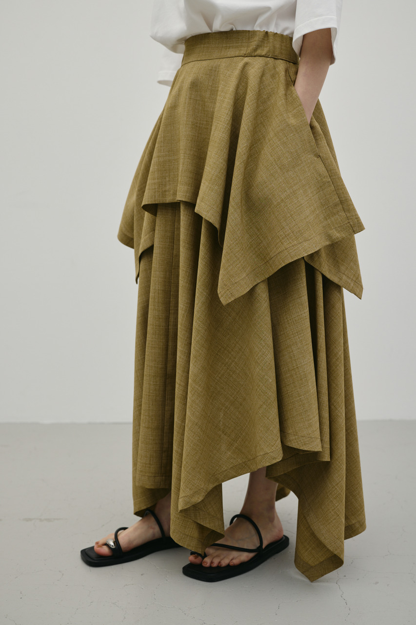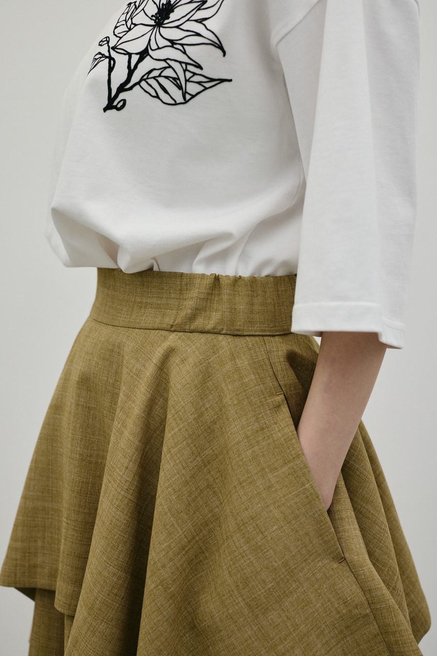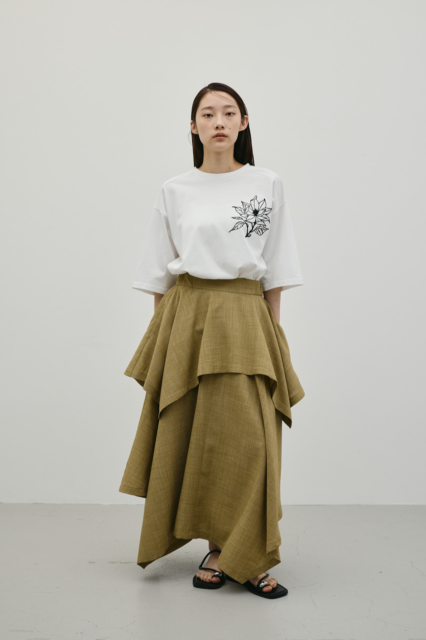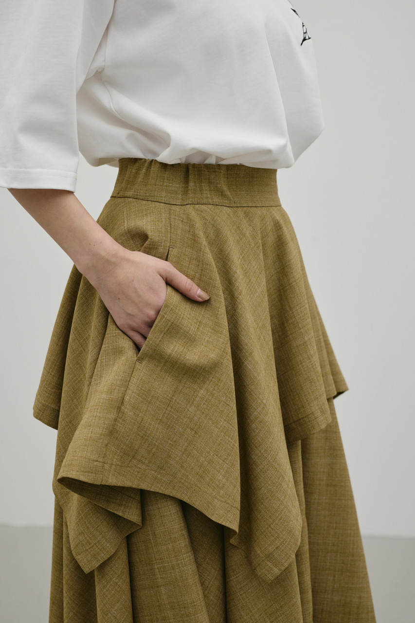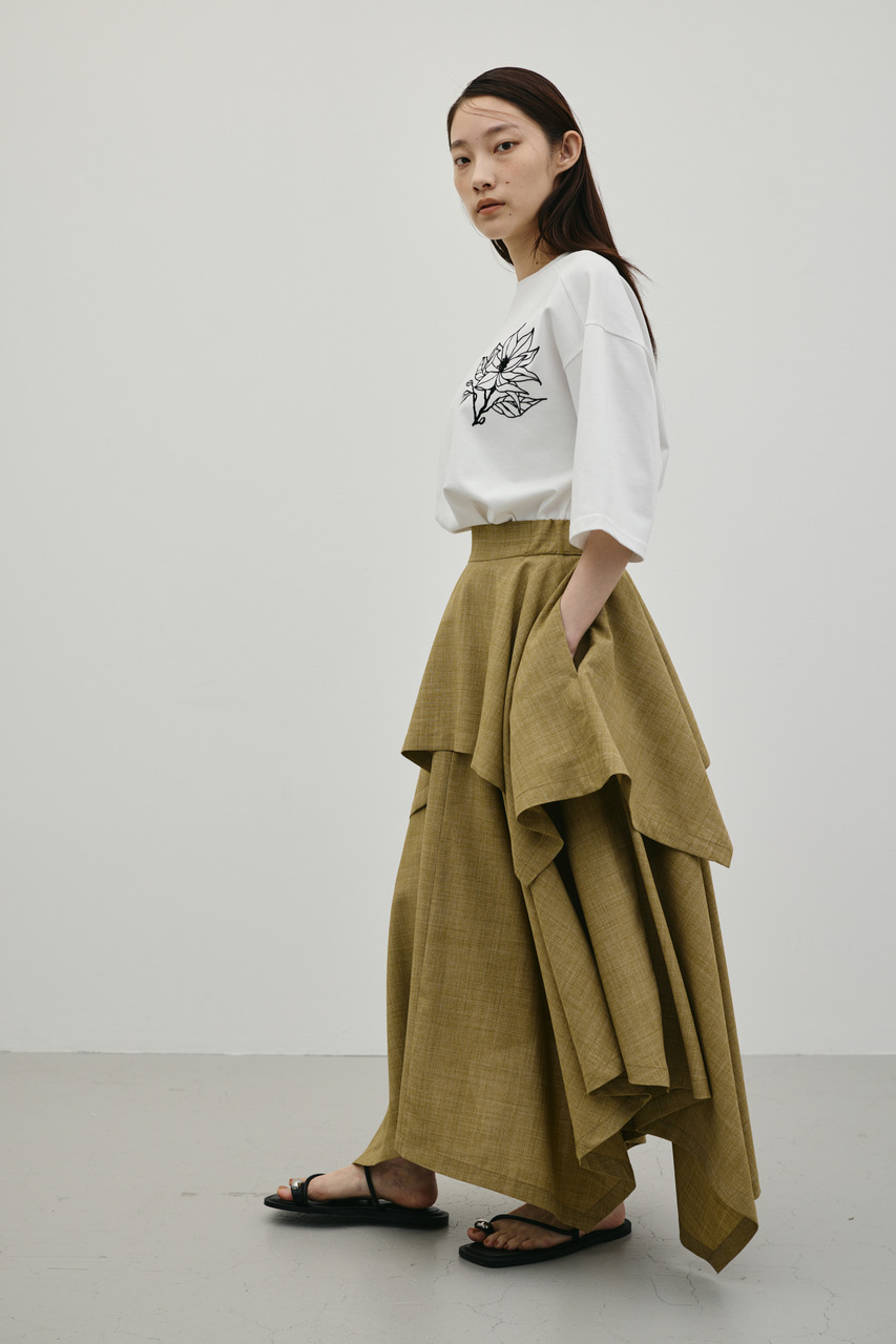まるで四角い布を重ねたような、構築的なパターンにこだわったレイヤードフレアスカート。2段ティアードデザインが生み出す奥行きと立体感で、動くたびに美しく揺れる一枚です。直線的なカッティングとフレアの柔らかさを掛け合わせ、甘くなりすぎないモードな印象に仕上げました。シンプルなトップスを合わせるだけで、洗練されたスタイリングが完成。ウエストまわりはすっきりと、裾に向かって広がるシルエットでバランスよく着用可能。デイリーからお出かけまで幅広く活躍します。ストレッチなし、透け感なし。