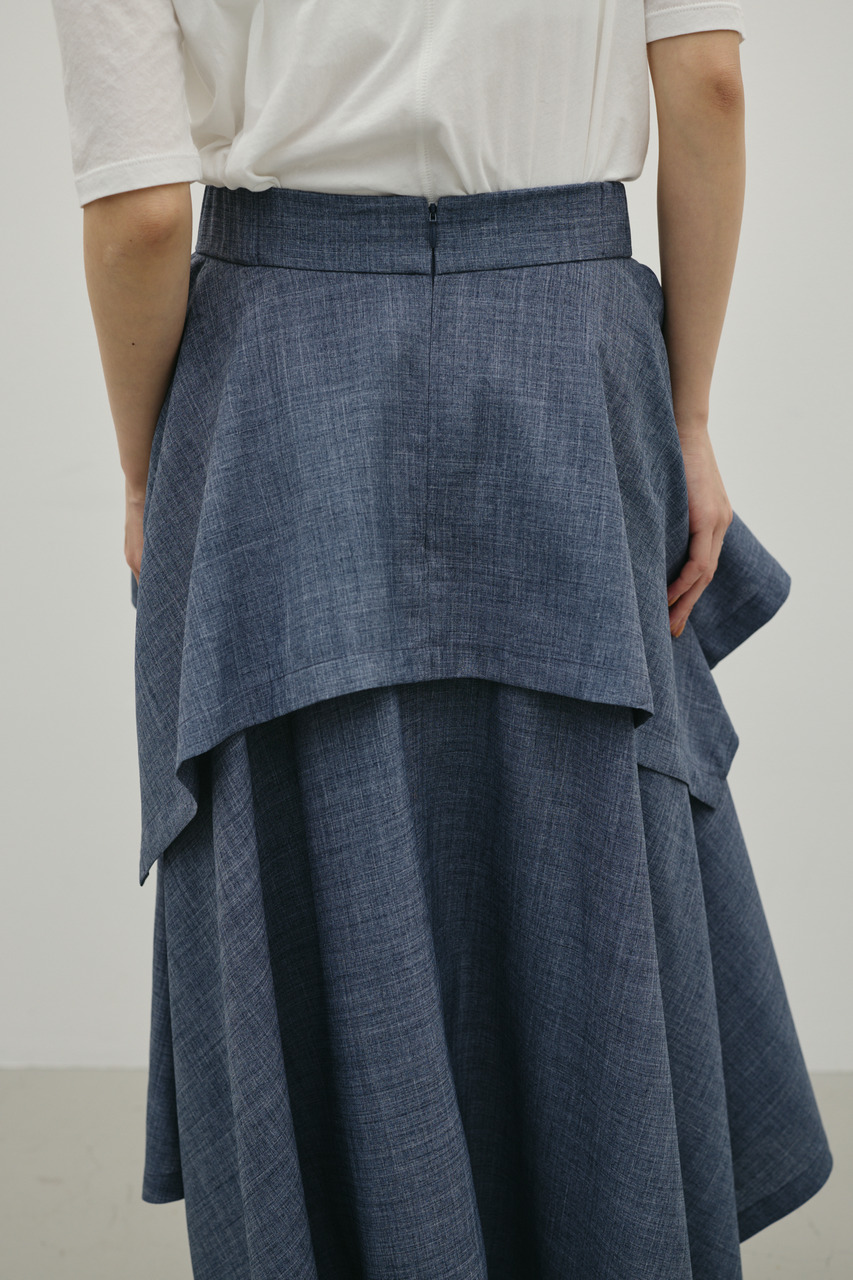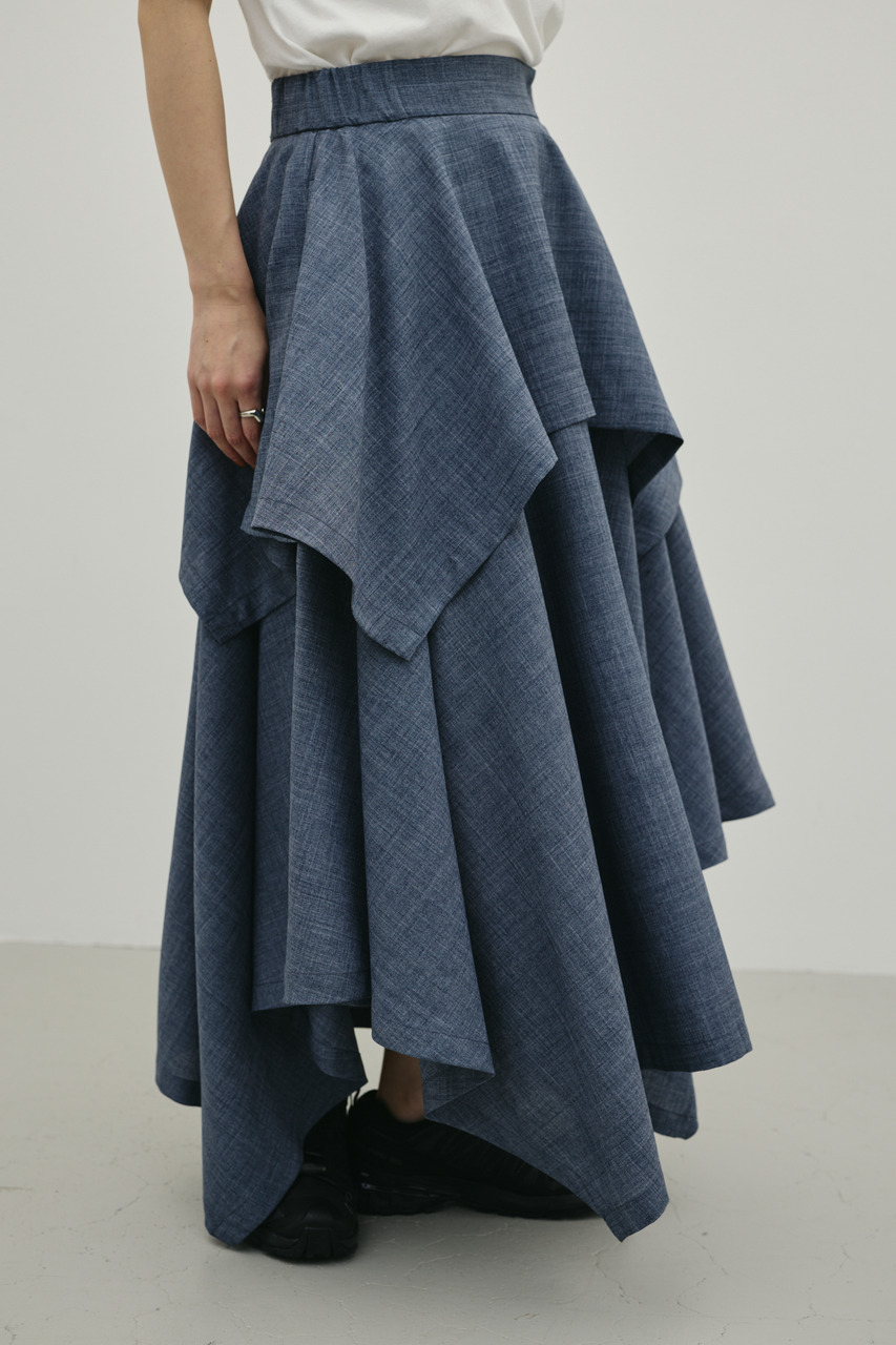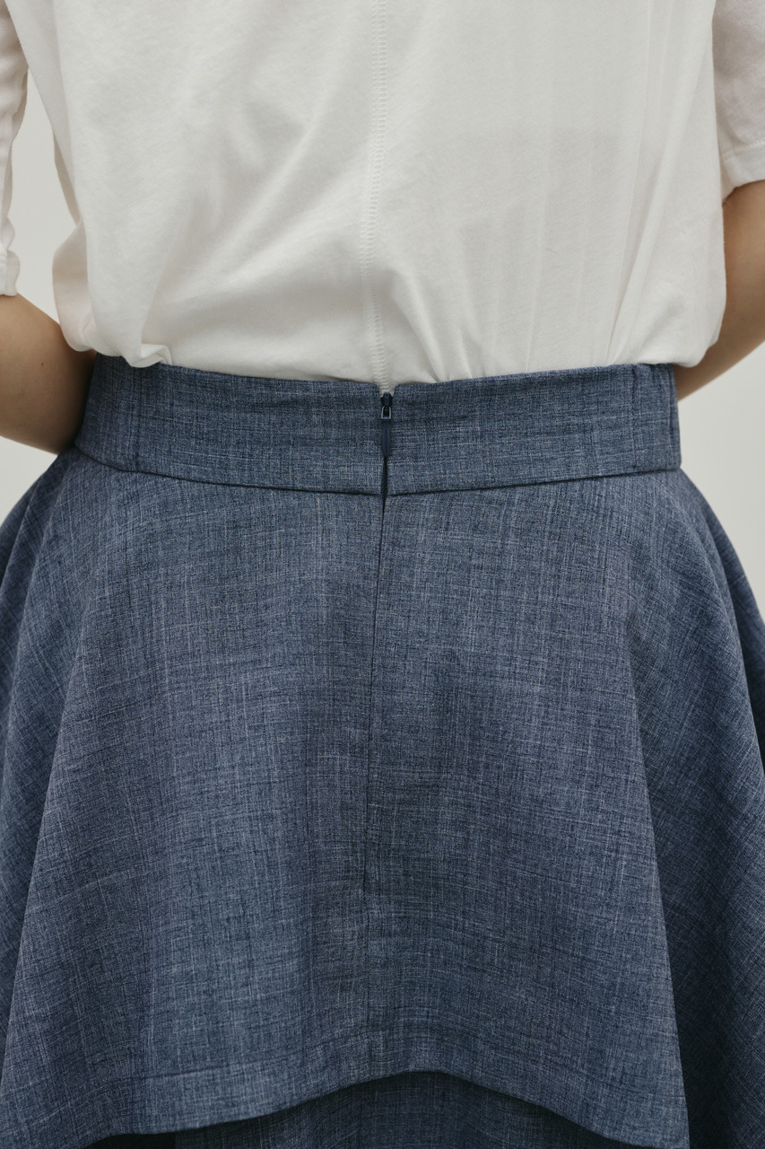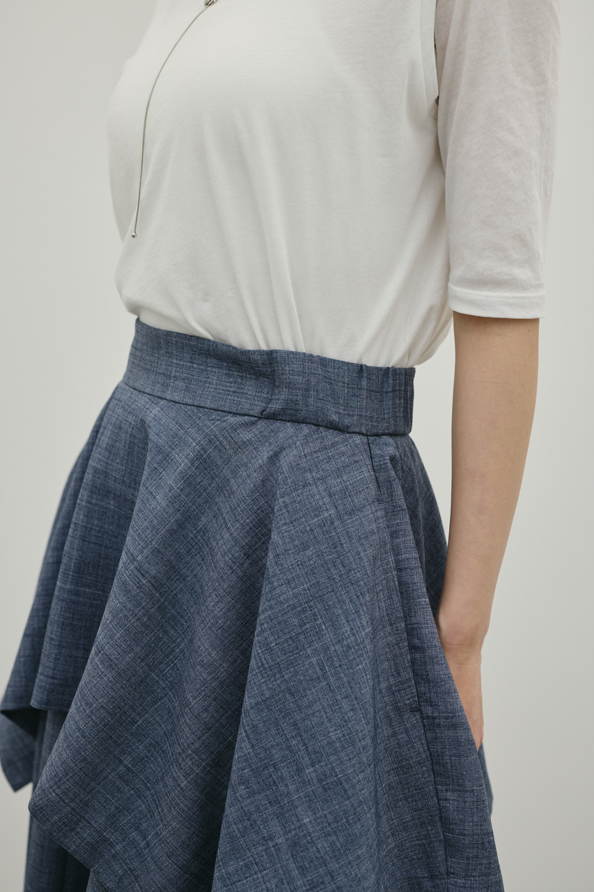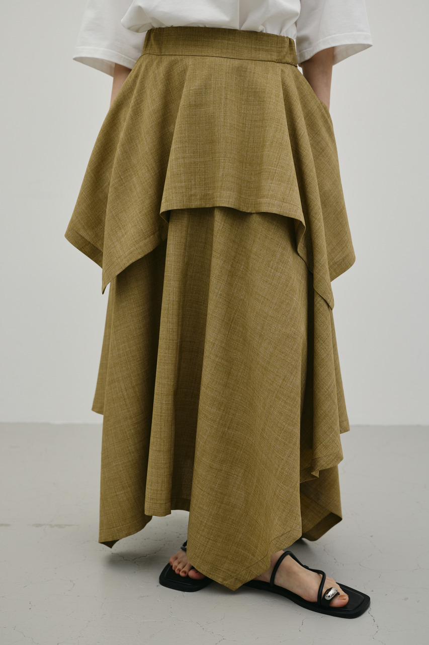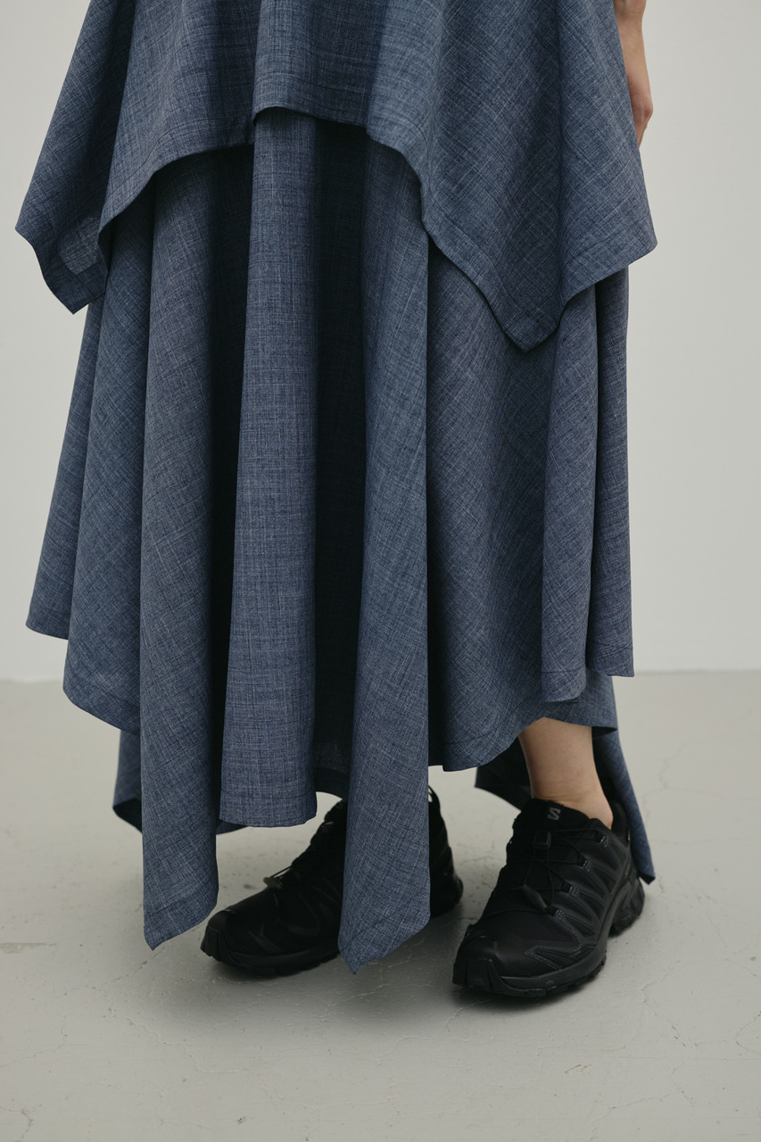まるで四角い布を重ねたような、構築的なパターンにこだわったレイヤードフレアスカート。2段ティアードデザインが生み出す奥行きと立体感で、動くたびに美しく揺れる一枚です。直線的なカッティングとフレアの柔らかさを掛け合わせ、甘くなりすぎないモードな印象に仕上げました。シンプルなトップスを合わせるだけで、洗練されたスタイリングが完成。ウエストまわりはすっきりと、裾に向かって広がるシルエットでバランスよく着用可能。デイリーからお出かけまで幅広く活躍します。ストレッチなし、透け感なし。