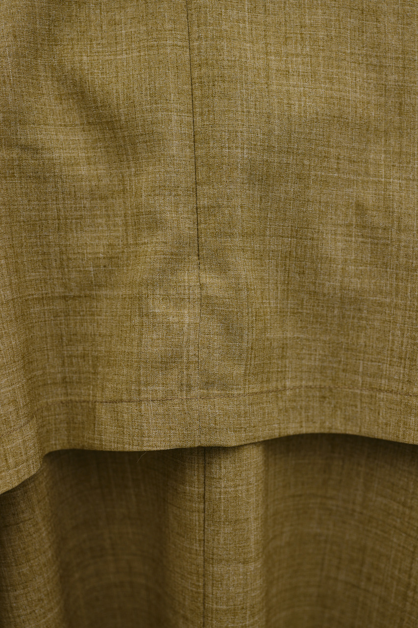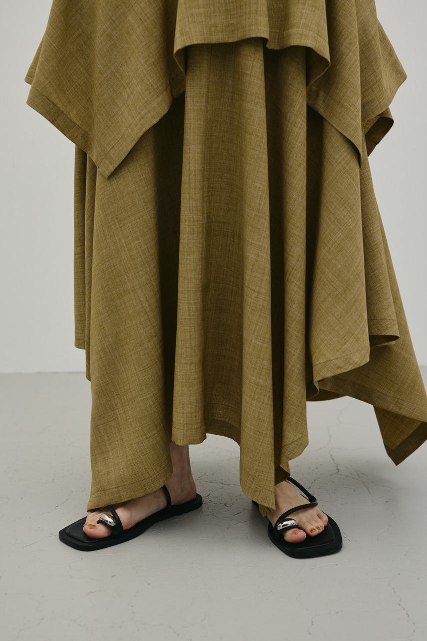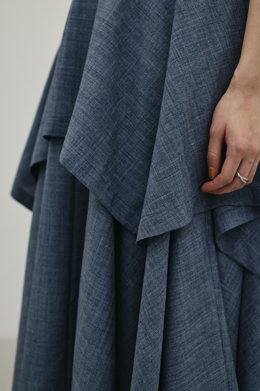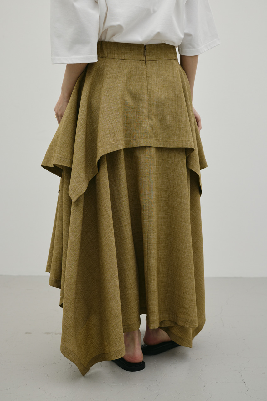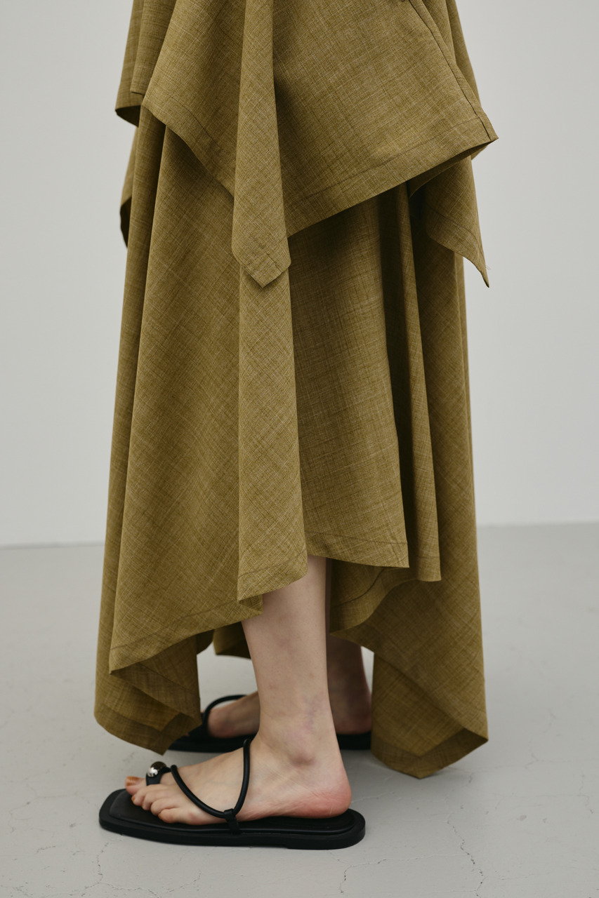 まるで四角い布を重ねたような、構築的なパターンにこだわったレイヤードフレアスカート。2段ティアードデザインが生み出す奥行きと立体感で、動くたびに美しく揺れる一枚です。直線的なカッティングとフレアの柔らかさを掛け合わせ、甘くなりすぎないモードな印象に仕上げました。シンプルなトップスを合わせるだけで、洗練されたスタイリングが完成。ウエストまわりはすっきりと、裾に向かって広がるシルエットでバランスよく着用可能。デイリーからお出かけまで幅広く活躍します。ストレッチなし、透け感なし。