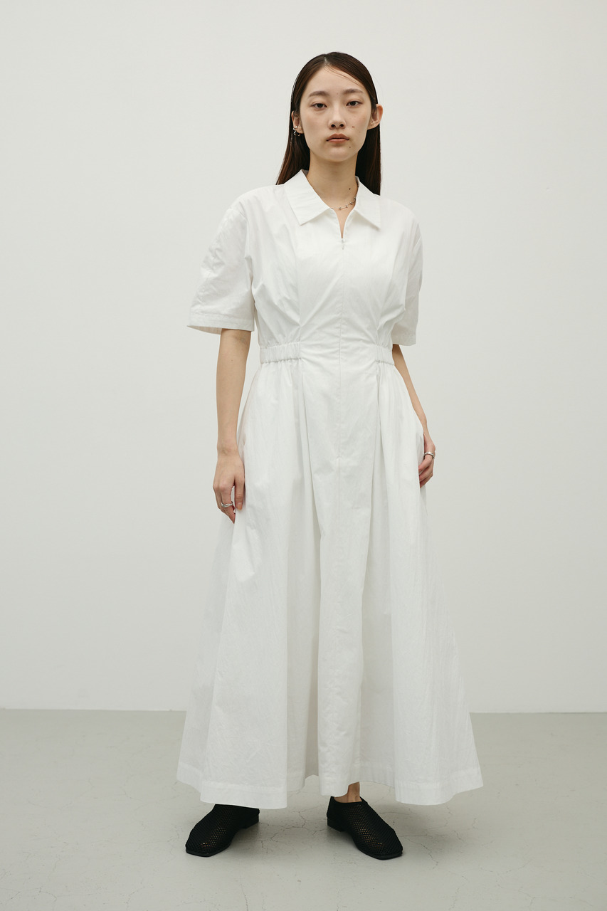 ウエストギャザーでメリハリを効かせた女性らしいシルエットの半袖シャツワンピース。フロントファスナーデザインがアクセントになり、程よくカジュアルダウンした一枚です。きゅっと寄せたウエストギャザーが自然なくびれを演出し、スタイルアップ効果◎。半袖デザインで軽やかに着られ、1枚でバランスの取れたコーデが完成します。フロントジップ仕様。ジップの開け具合で印象を変えられるのもポイントです。ストレッチなし、透け感WHTややあり。